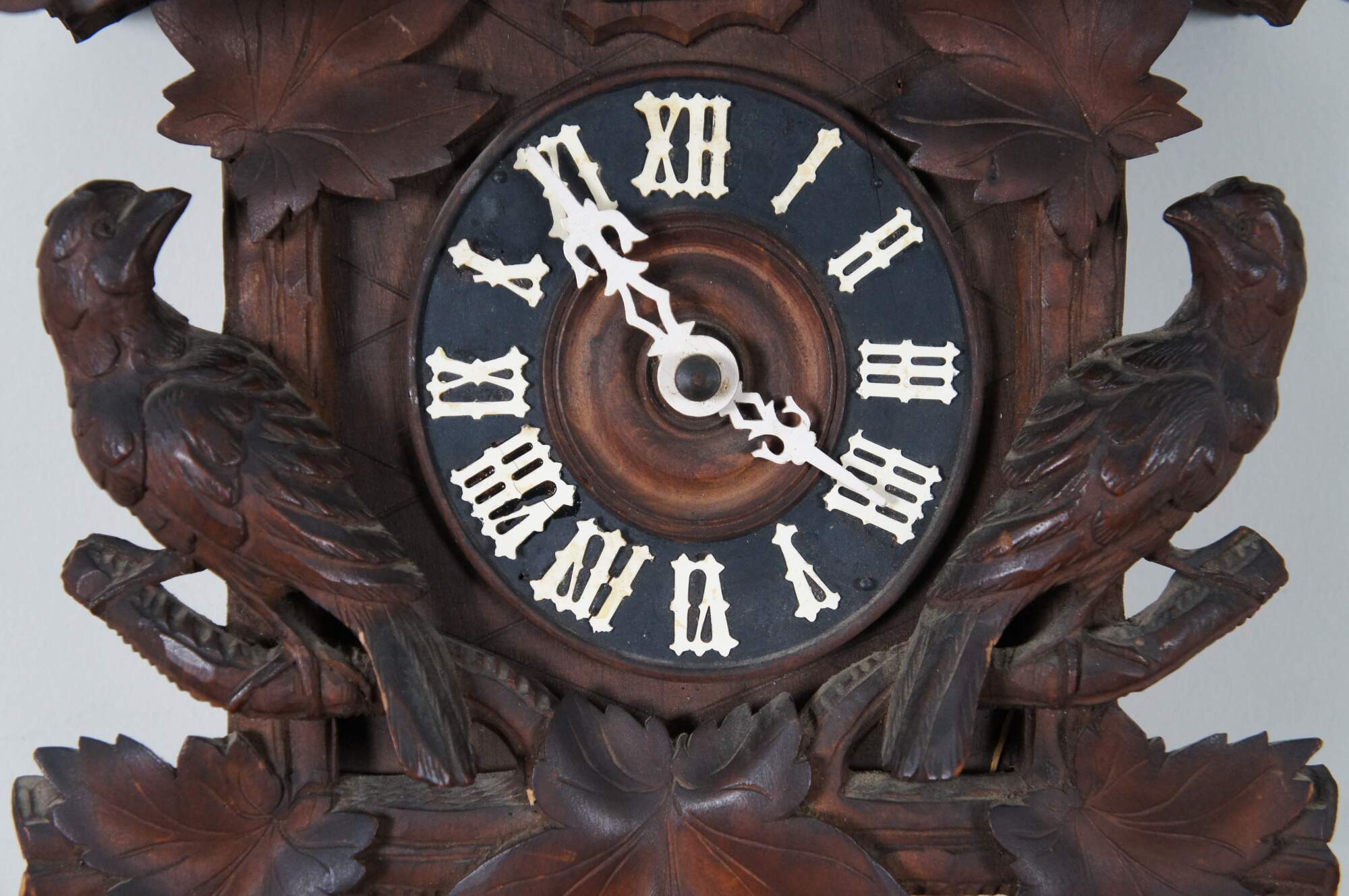 George Kuehl & Co. antique Black Forest carved wood cuckoo clock in the traditional house form, decorated with leaves and birds. Includes pine cone shaped weights and additional pendulum. works marked G.K. George Kuehl & Co., operated out of Chicago, Illinois. Circa 1910s.