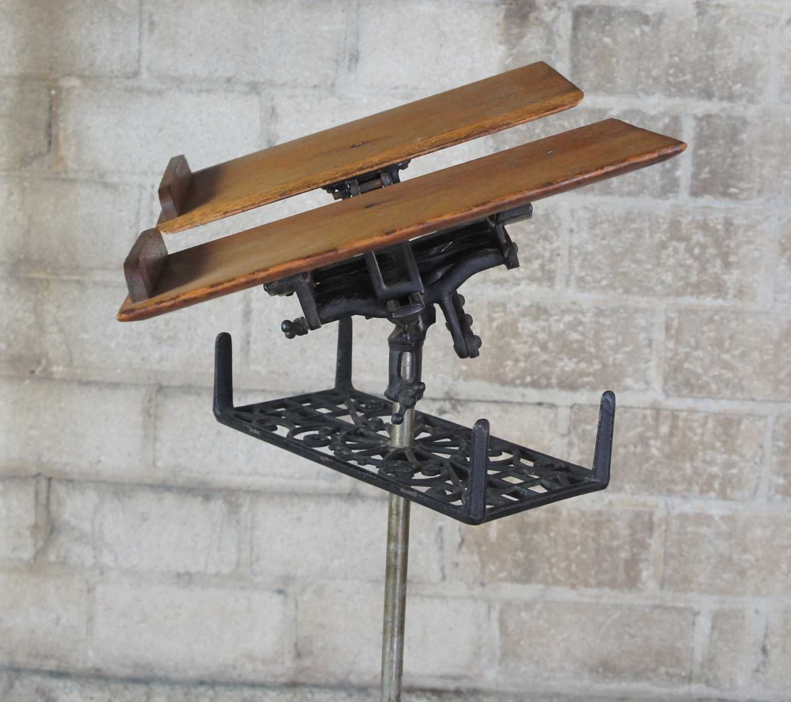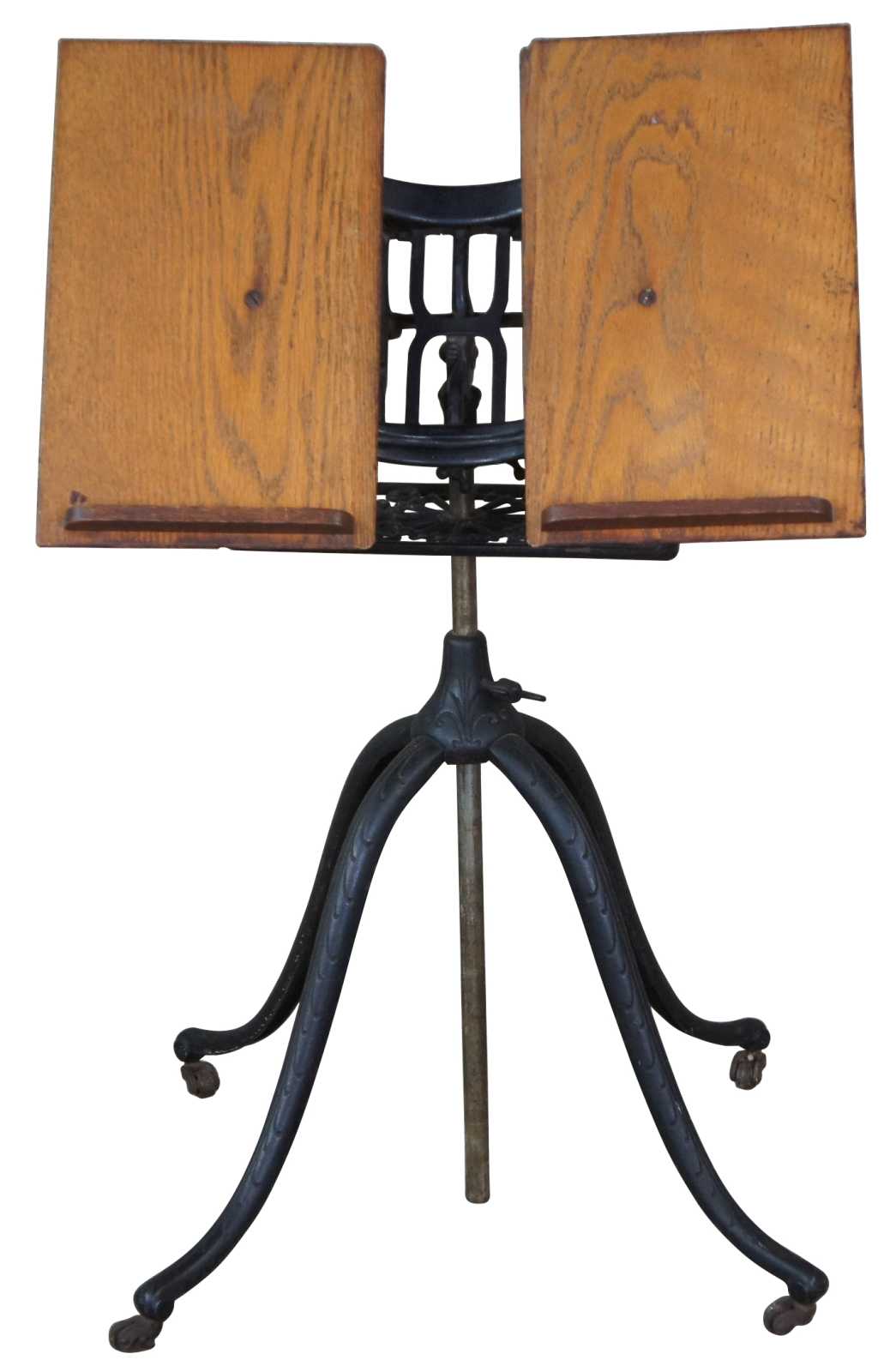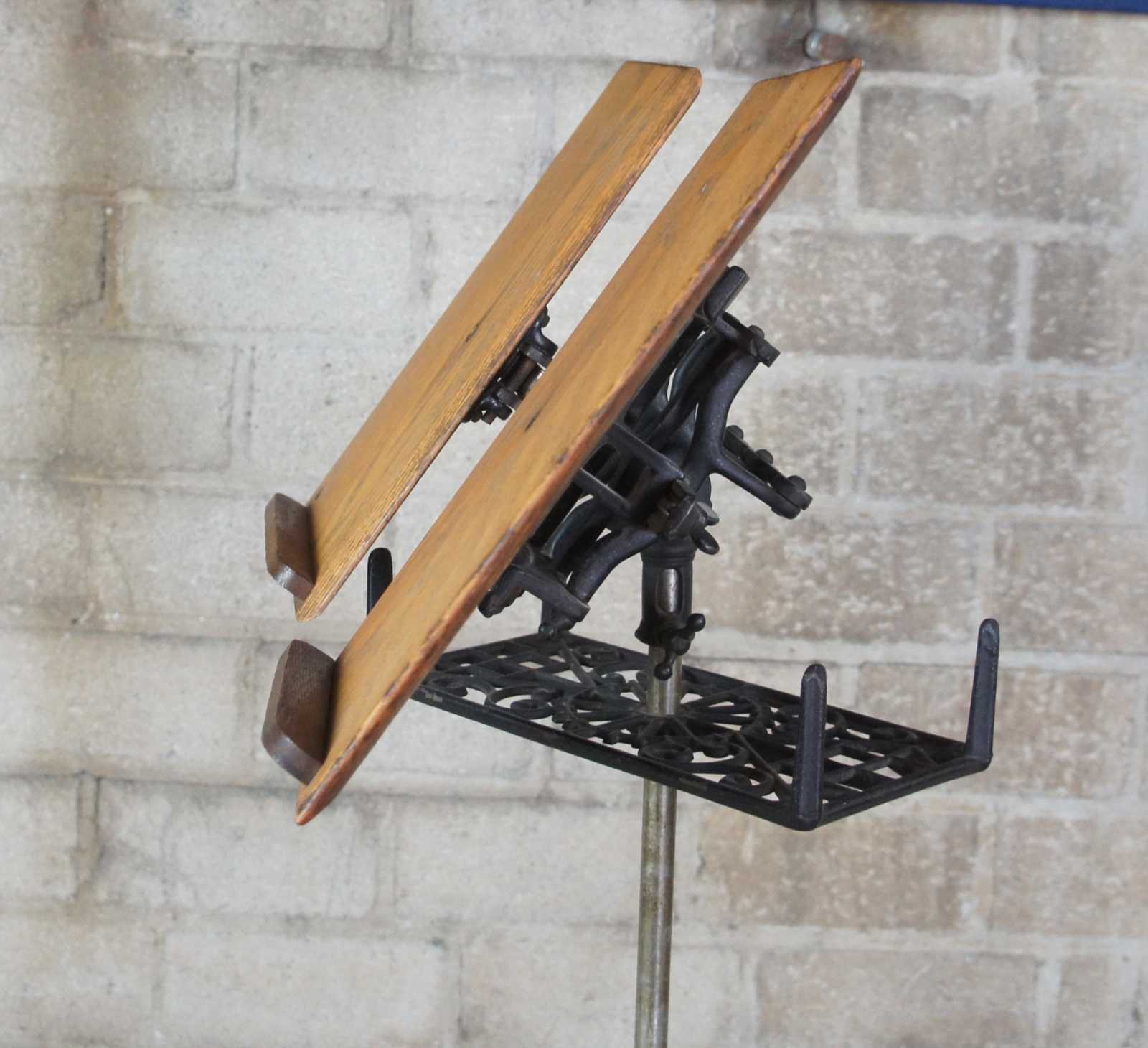 Antique 19th century Victorian adjustable book stand or library lectern featuring ornate wrought iron pedestal base and quartersawn oak book holder.
