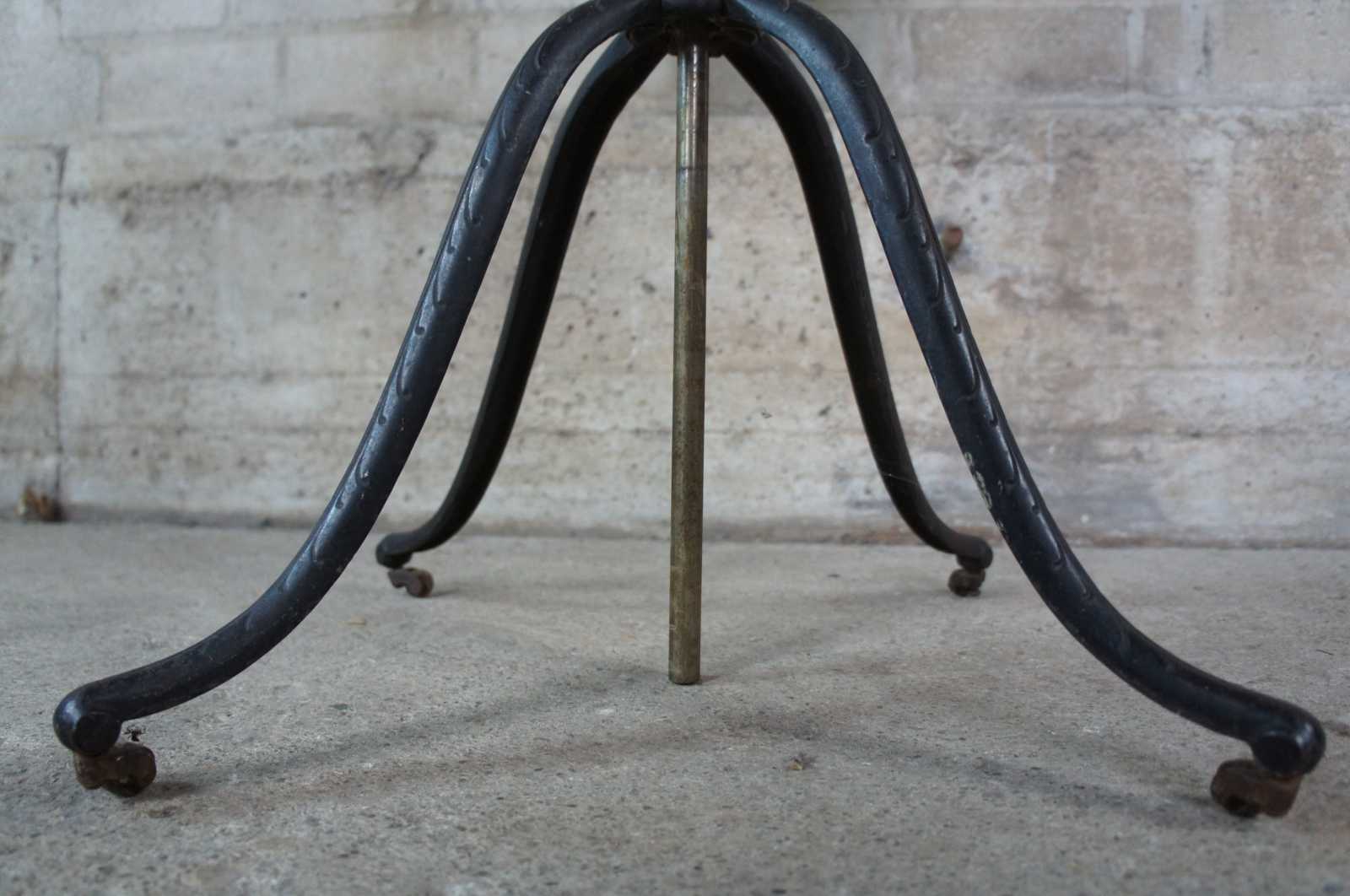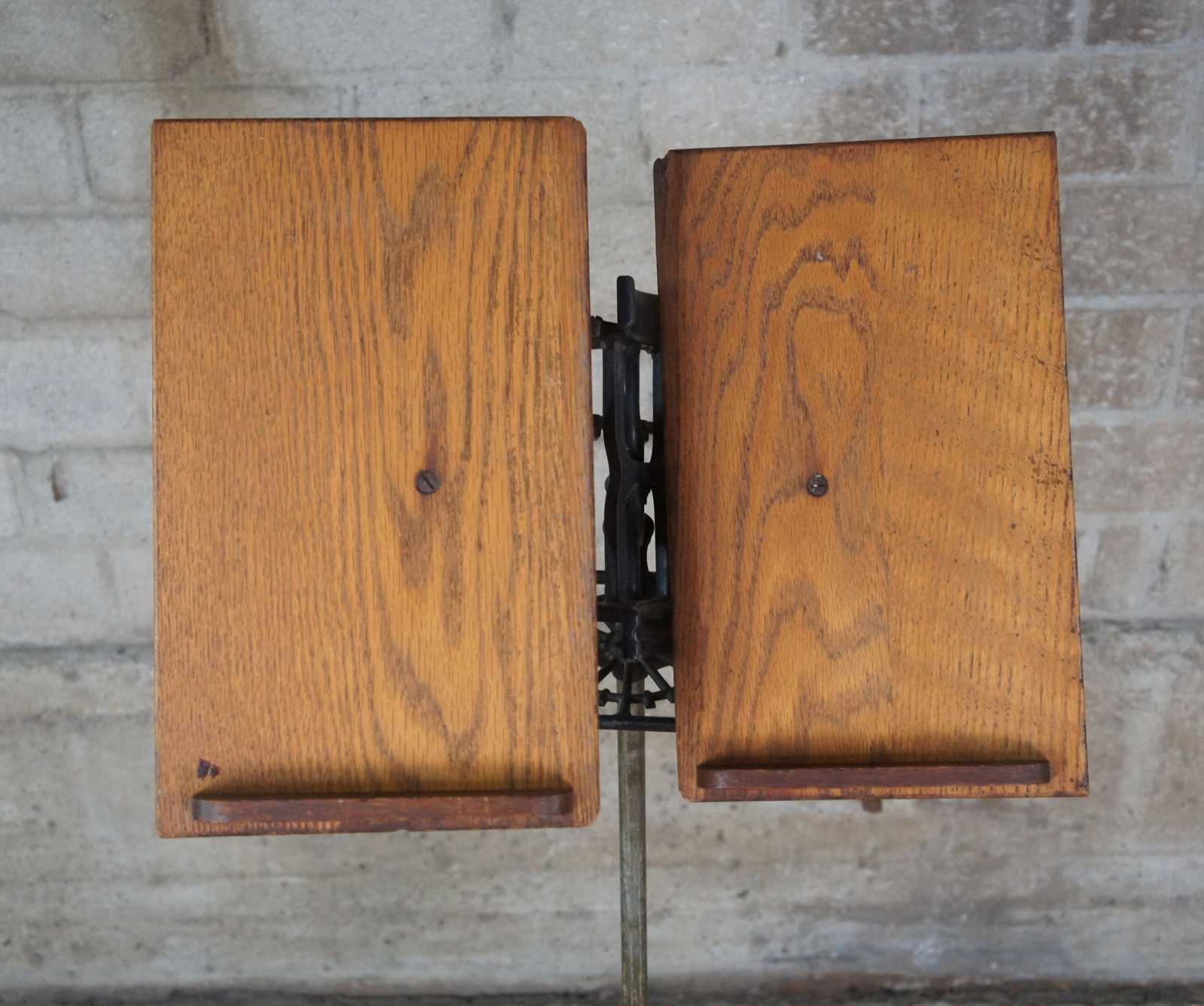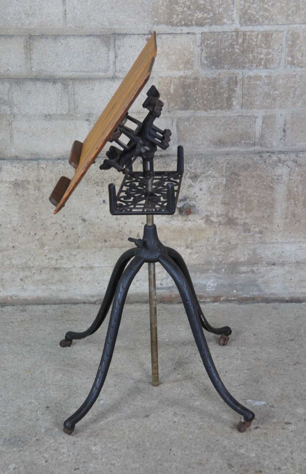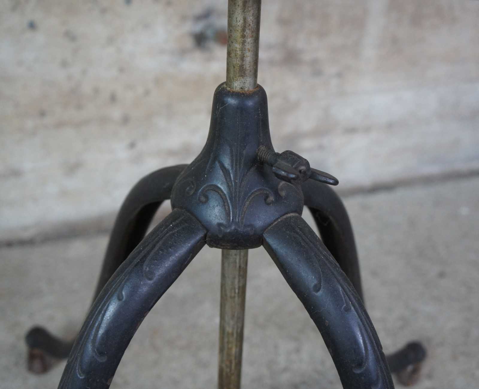 Antique 19th century Victorian adjustable book stand or library lectern featuring ornate wrought iron pedestal base and quartersawn oak book holder.