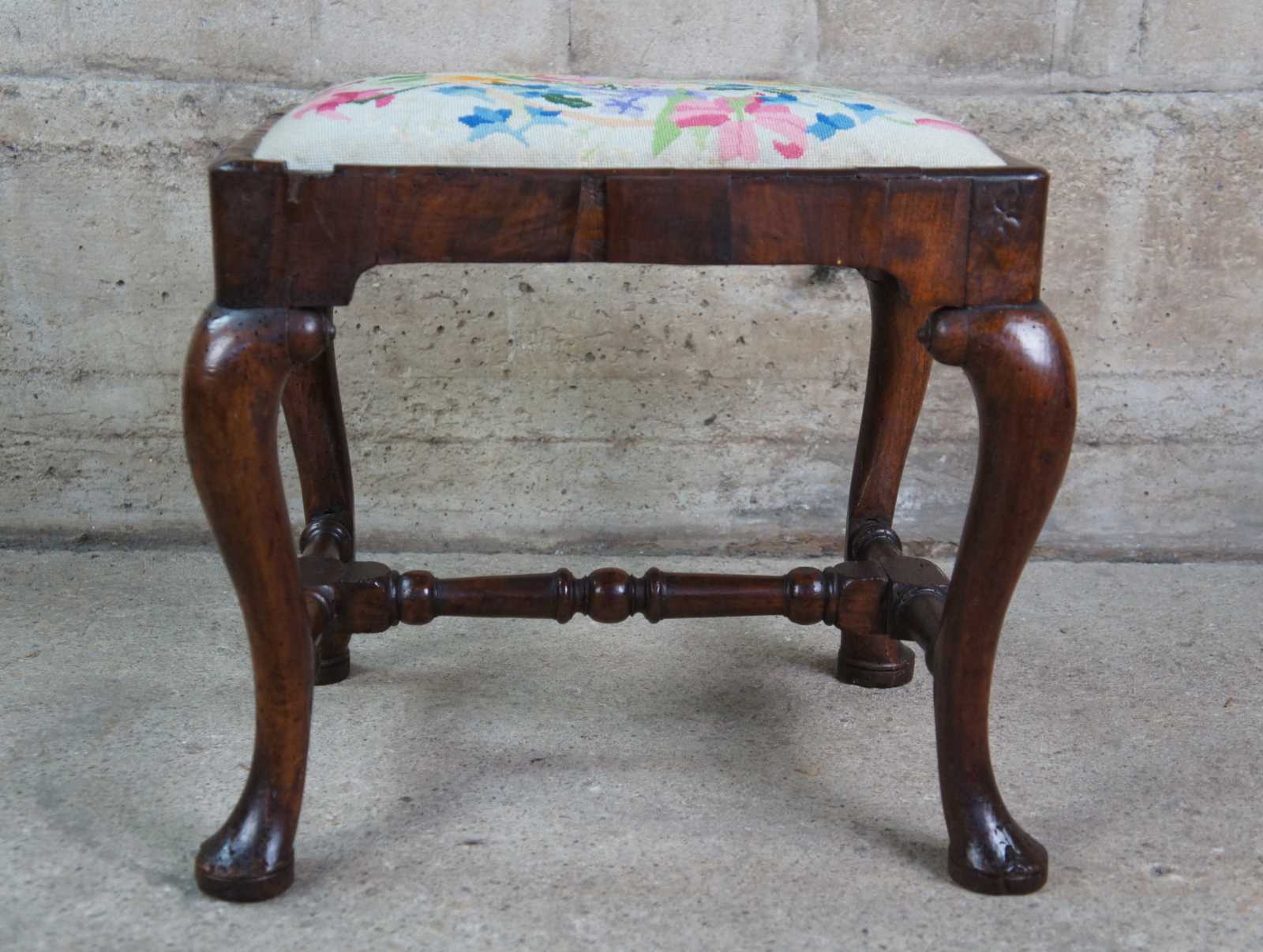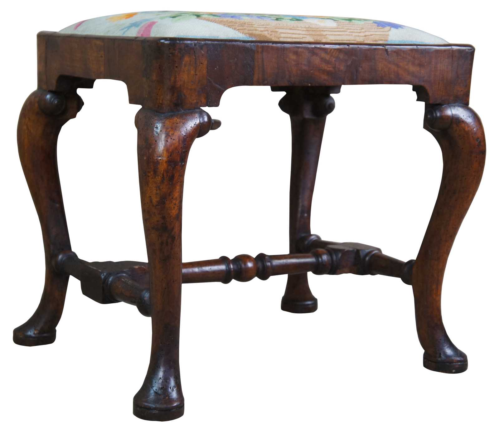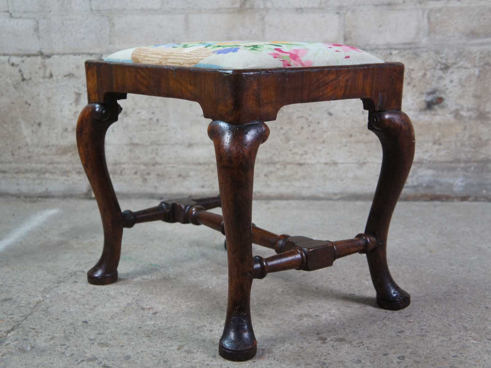 An exceptional 18th century Georgian Stool. A rectangular form made from Mahogany with floral needlepoint seat and cabriole legs with pad feet. Legs are connected by a turned H stretcher.