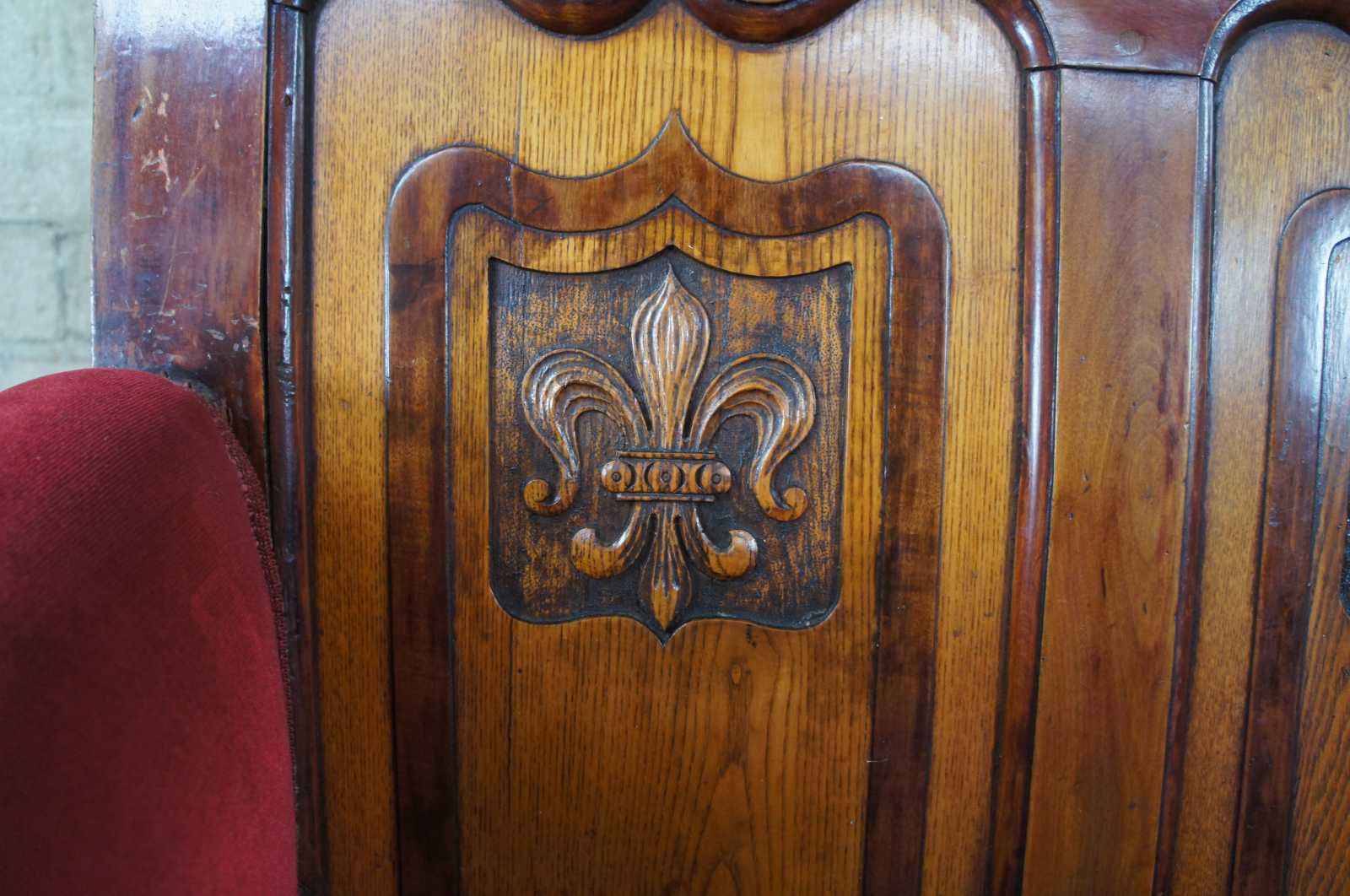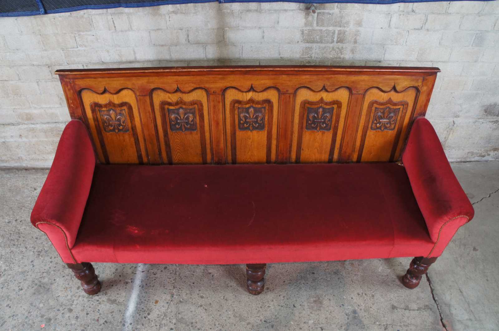 Extraordinary 18th century English oak pub bench or sofa. A rectangular form with high back and red velvet upholstery. Features Gothic revival panels and Fleur De Lis carvings. The bench is supported by robust turned bun feet. Origin London, England.
