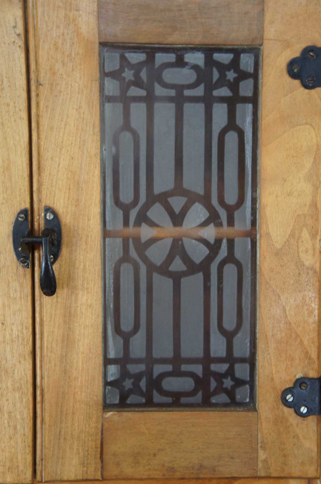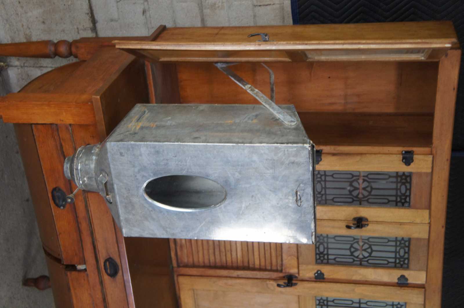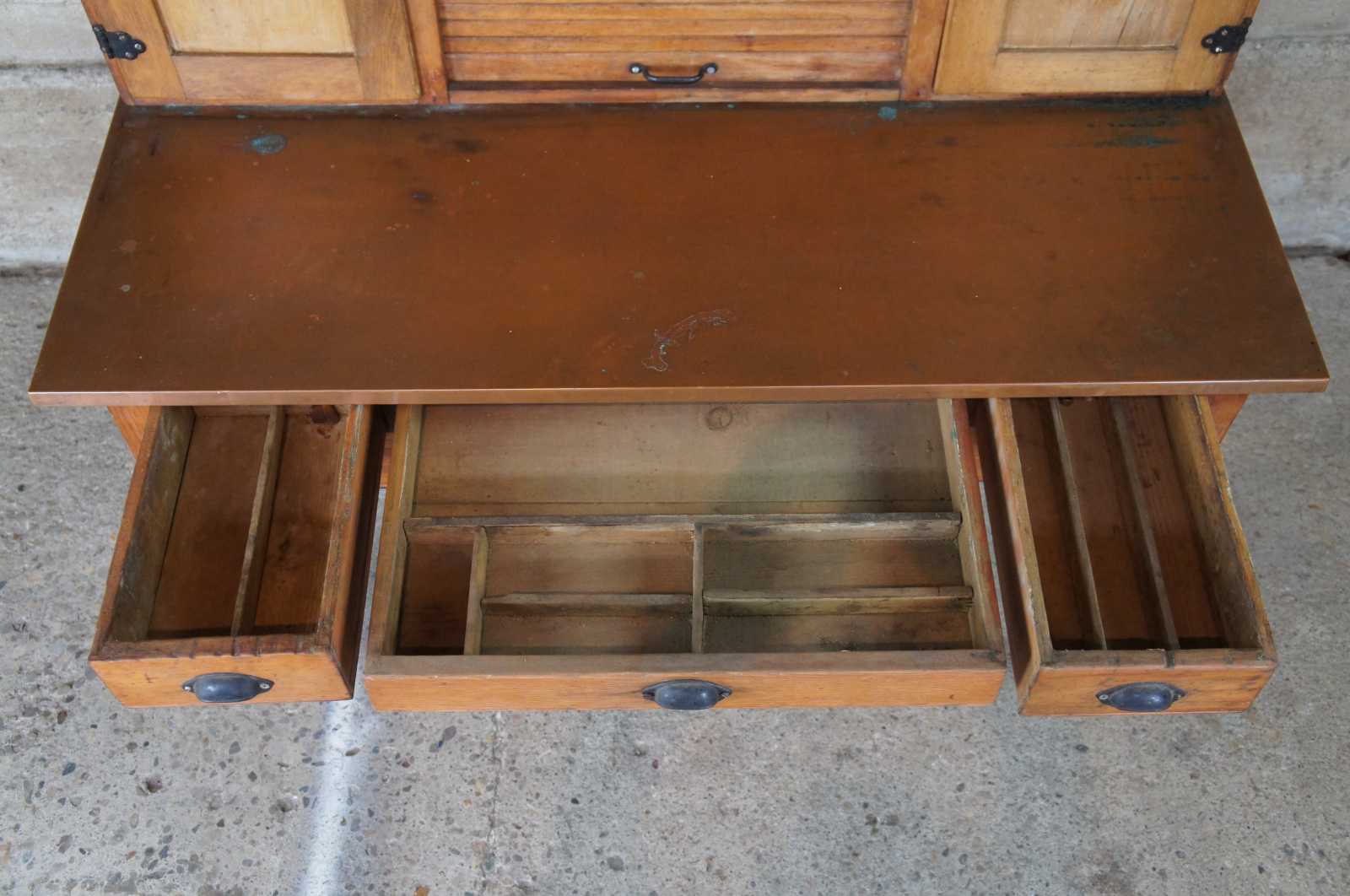 An exquisite Bakers cabinet by Montgomery Ward. Made from oak with 5 drawers, copper work surface and stepback hutch featuring etched glass, a tambour door and articulating sifter. Includes copper lined flour bins and iron hardware.