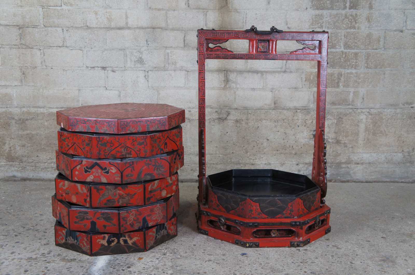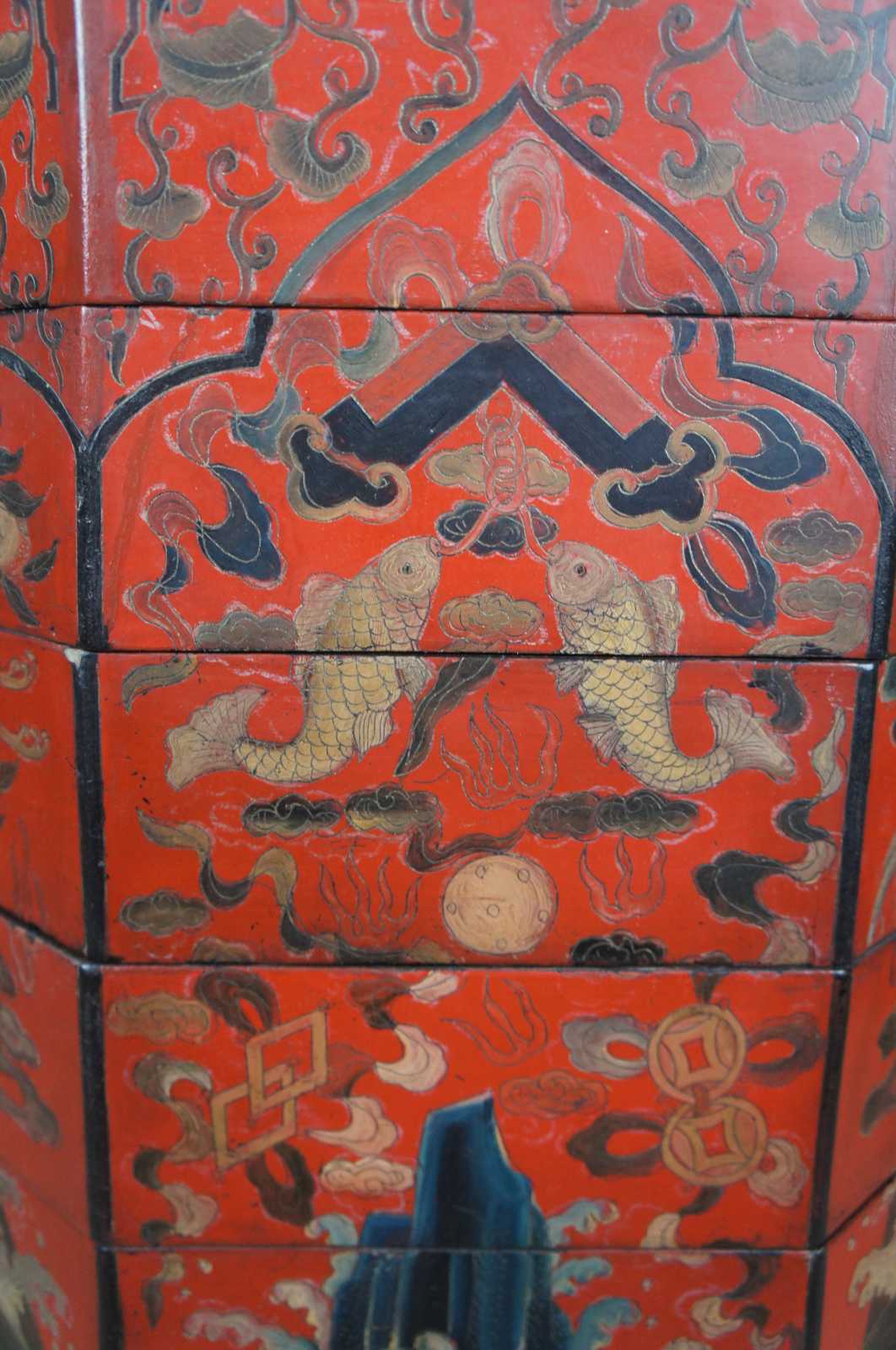 Antique Chinese six tiered octagon shaped wedding basket or box. Made of lacquered wood, bound in iron, with cranes, dragons and fish motif.