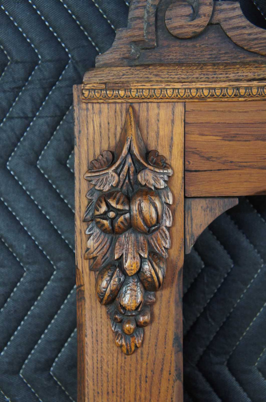 An exquisite Victorian era French hanging plate rack from last quarter of the 19th century. Made from oak with five open shelves supported by corbels. Includes ornate fruit and nut carvings set beneath gadrooning trim. Features an ornately scrolled crown centered by a convex crest. The letters "LA" are carved into the center. The slim profile allows for versatile use and display of collectibles.