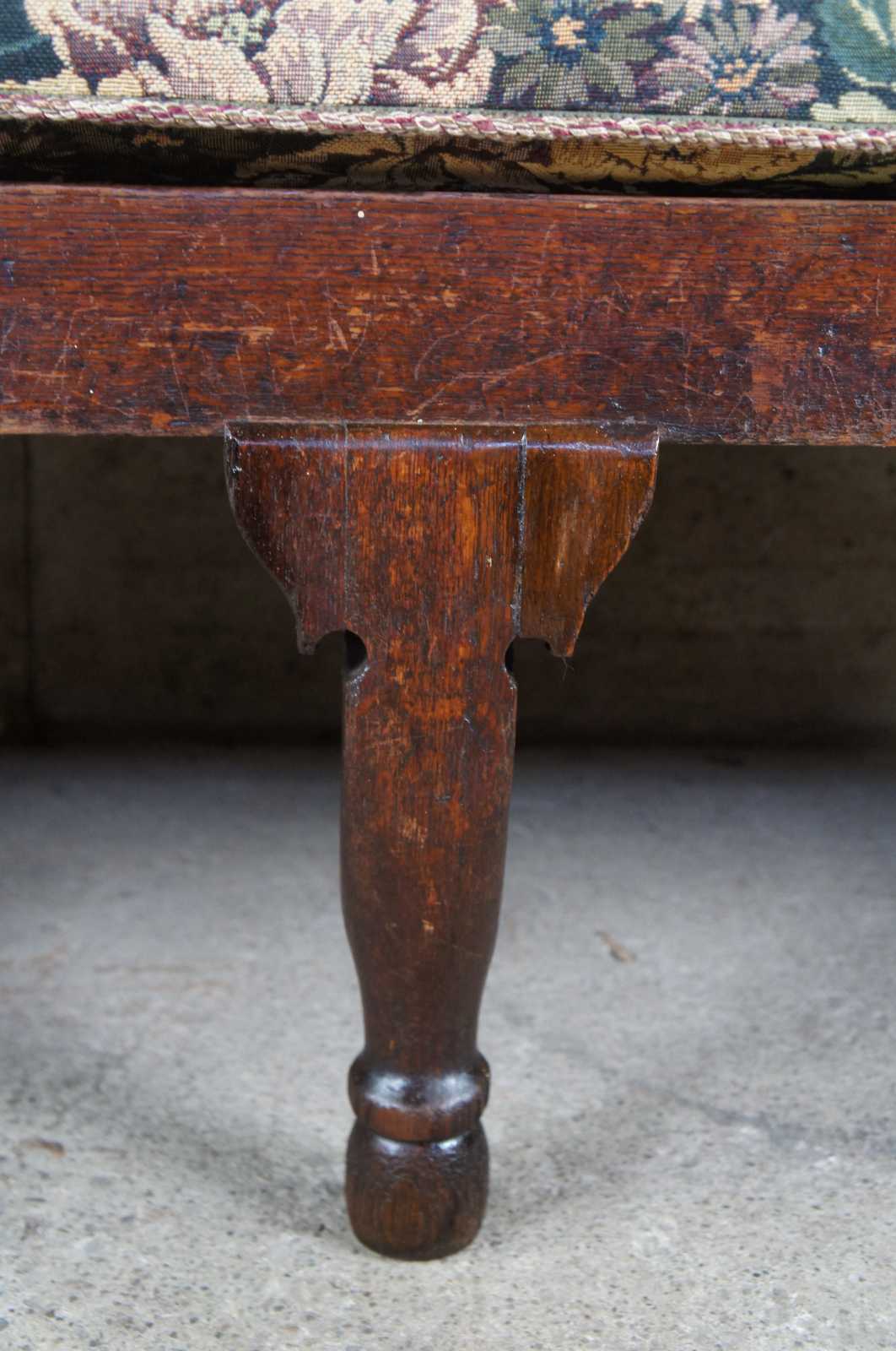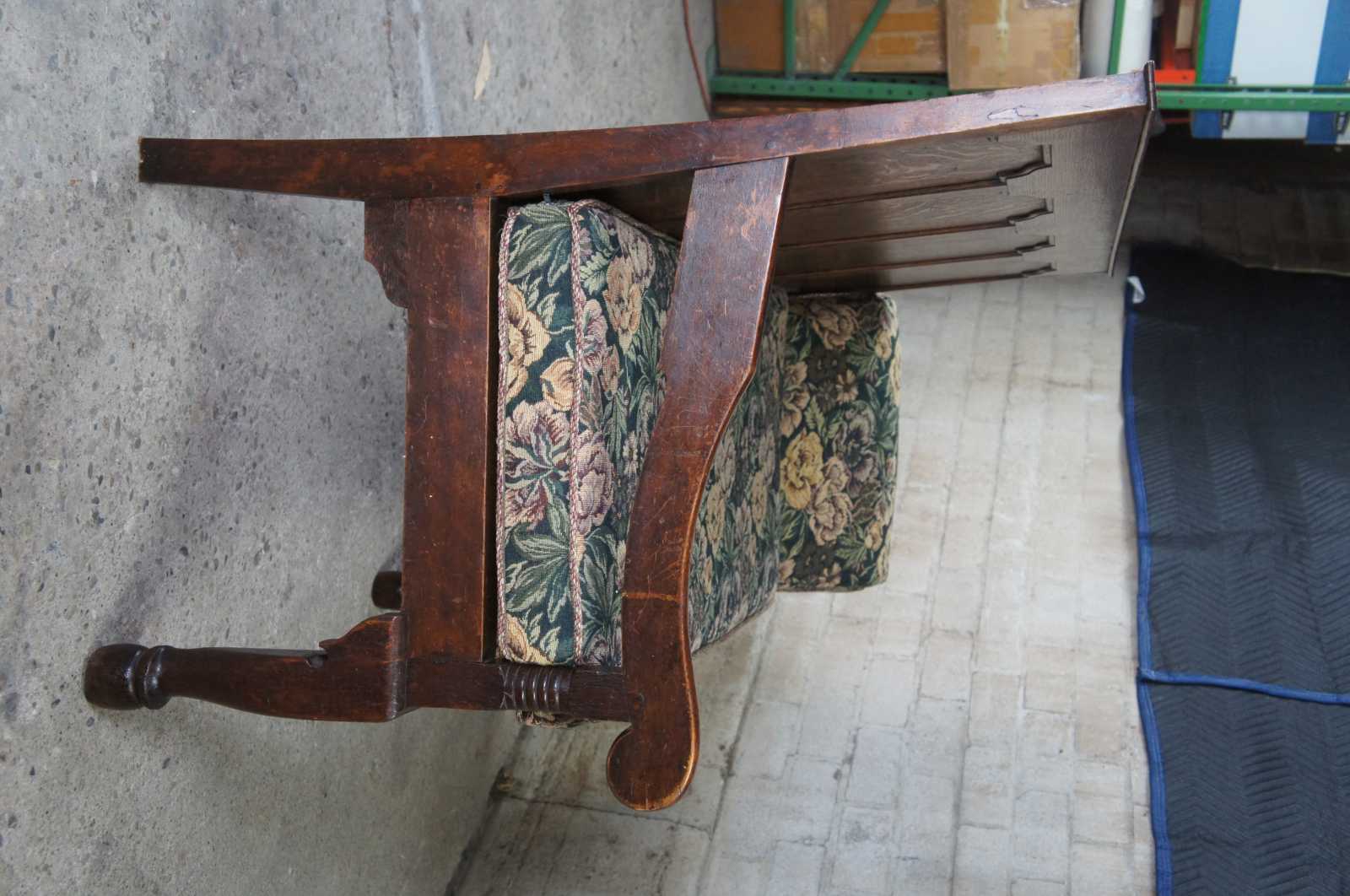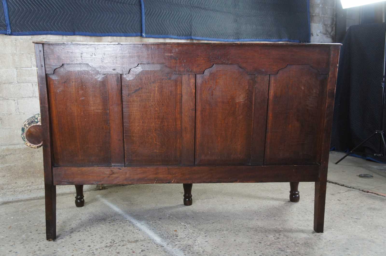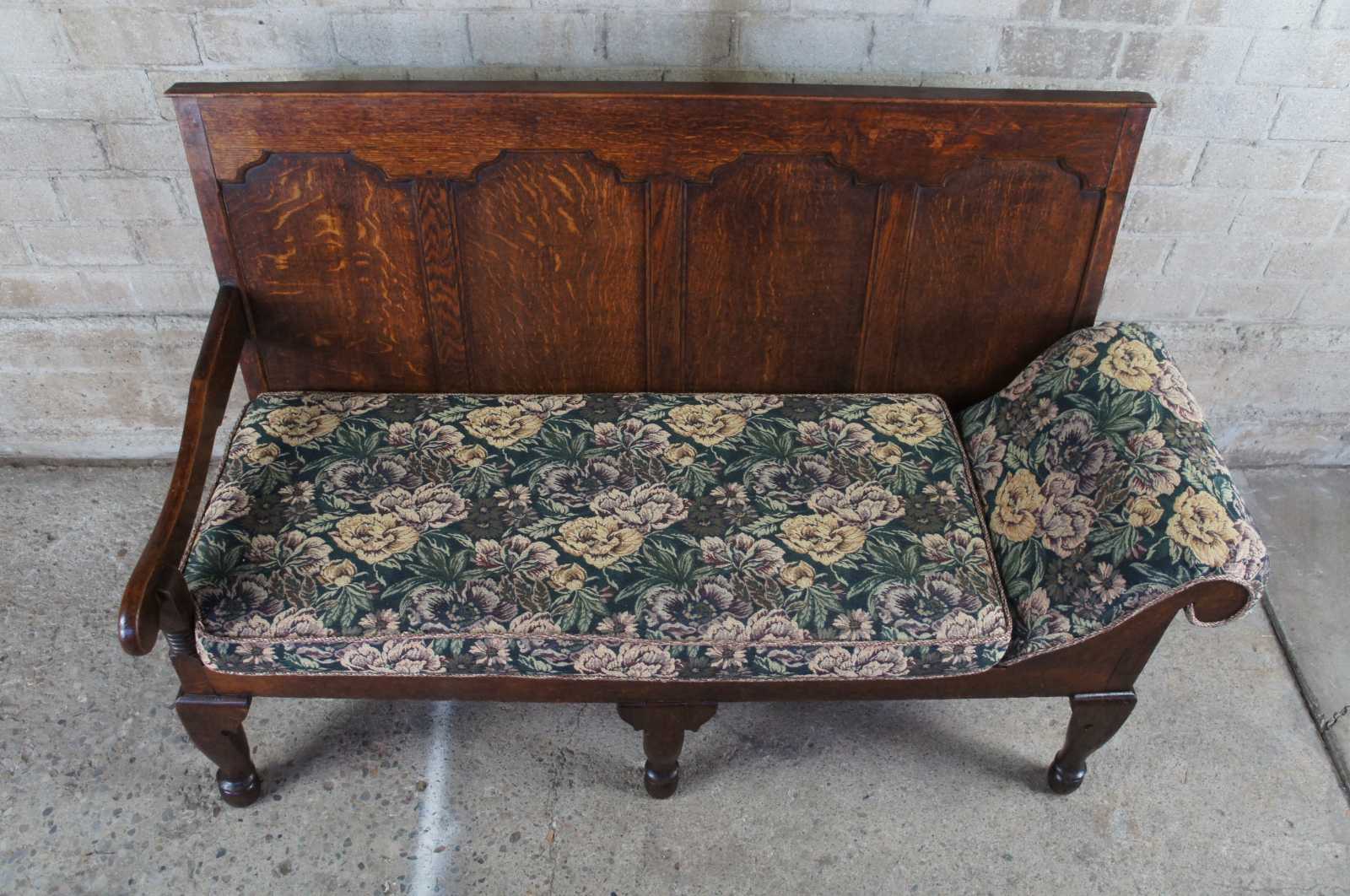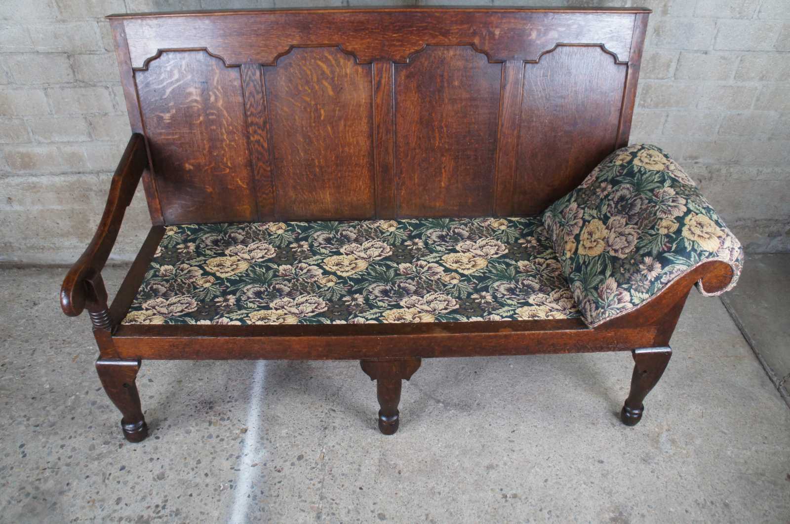 English 18th century settle in oak with peg construction. Features a straight crest rail over four shaped, raised and fielded panels. Floral upholstery with scroll shaped lower arm and conforming upholstery. Includes matching bolster and throw pillows. The bench is supported by cabriole legs with bun feet