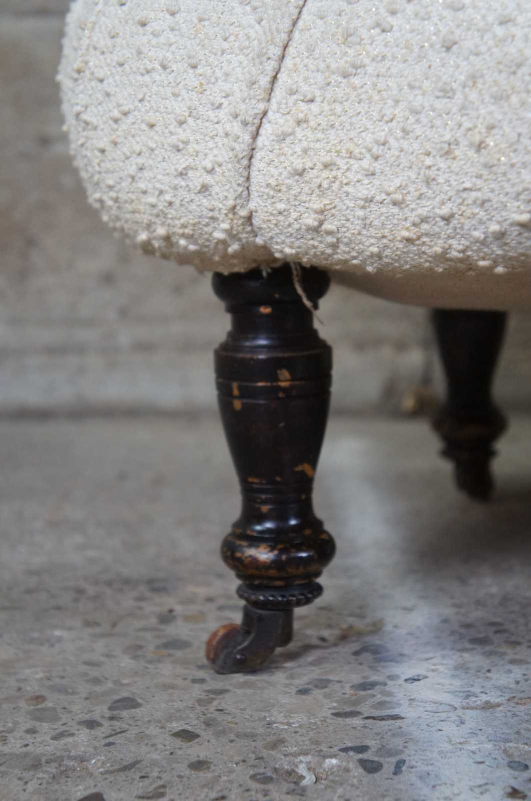 A magnificent Victorian era Tete-A-Tete. Upholstered in a heavy off white tufted fabric. The bench is supported by five turned walnut legs with casters.