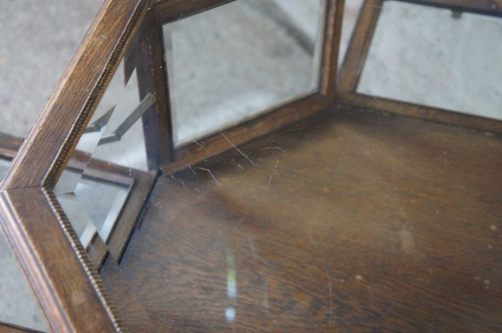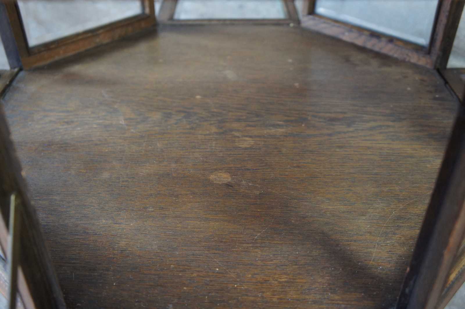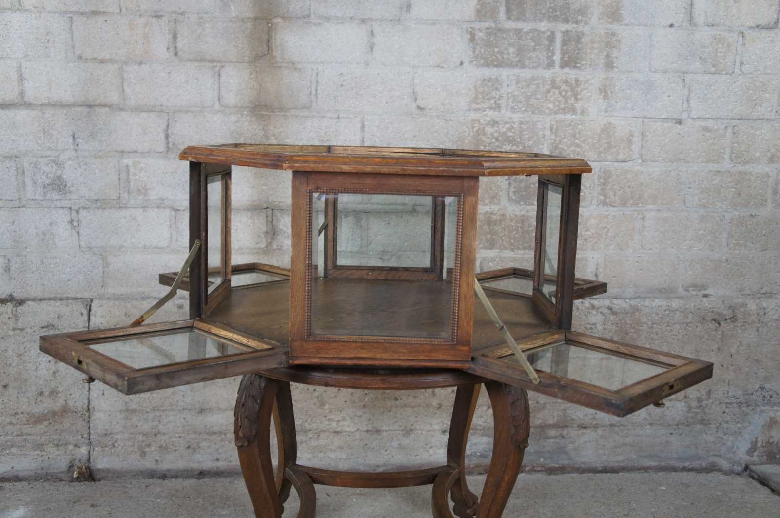 An exquisite and rare Victorian octagonal shaped Vitrine or Bijouterie, Last quarter of the 19th century. Made of quartersawn oak featuring rotating top with beveled glass, four drop front doors over serpentine legs with claw feet and casters.