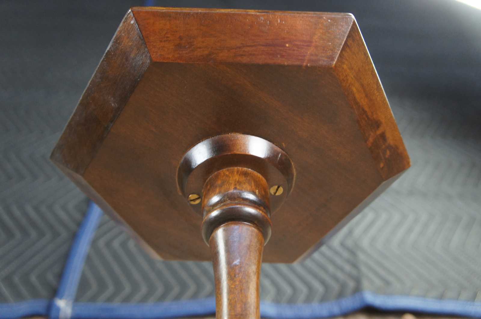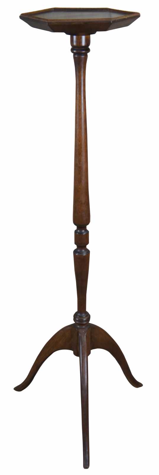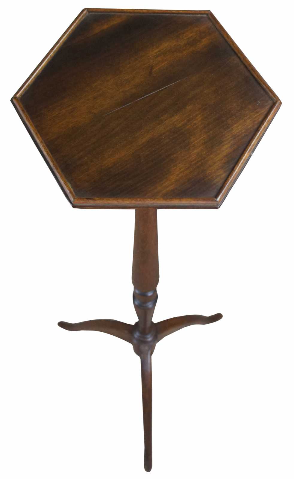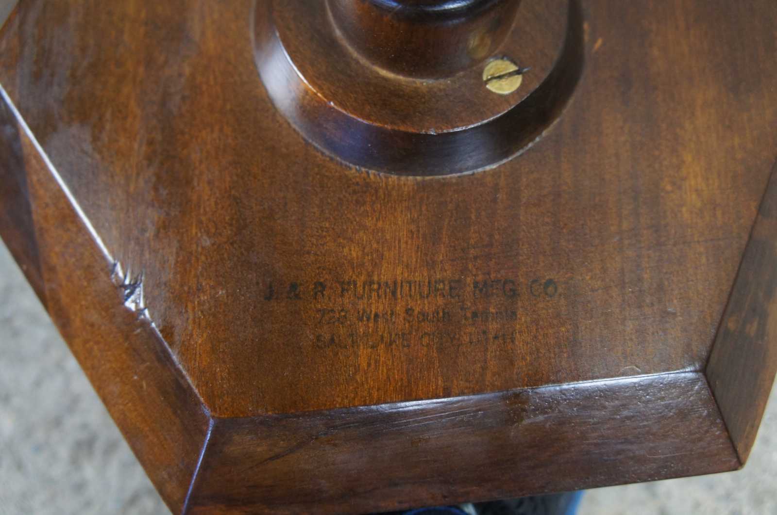 Mid 20th Century Federal inspired candle stand by J&R Furniture Mfg Co of Salt Lake City Utah. Made from walnut with an inset hexagon top over turned column and tripod base.