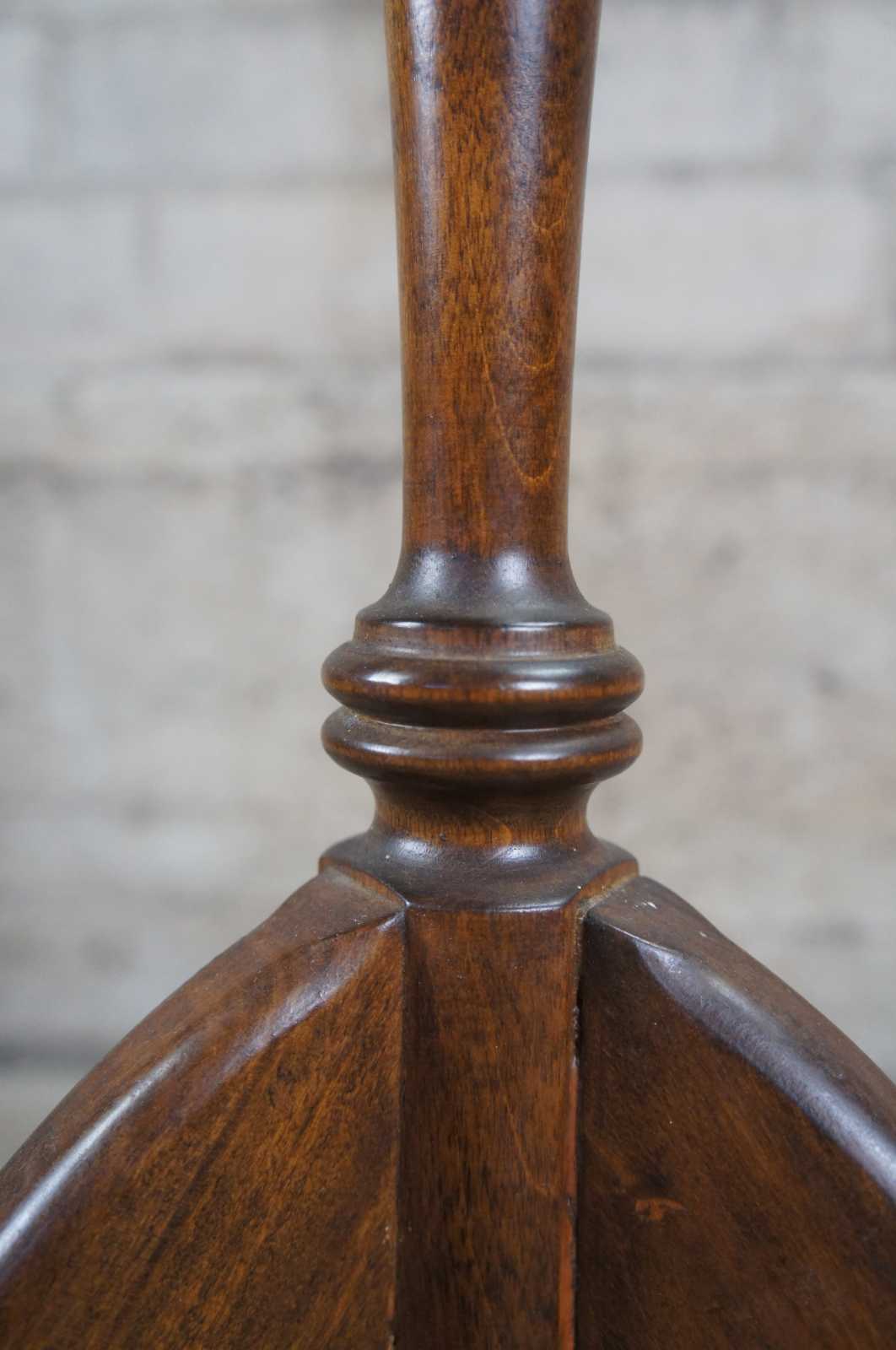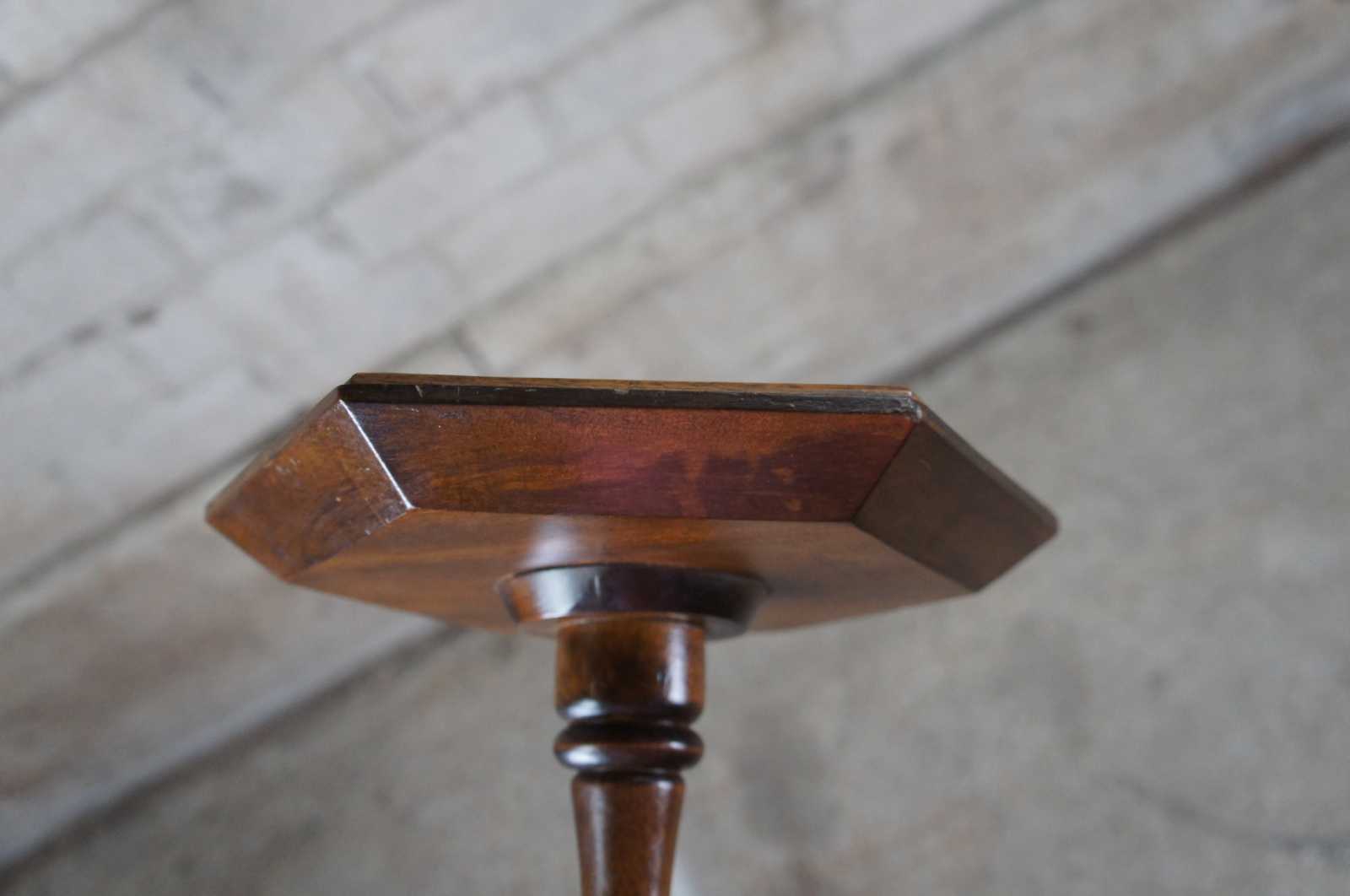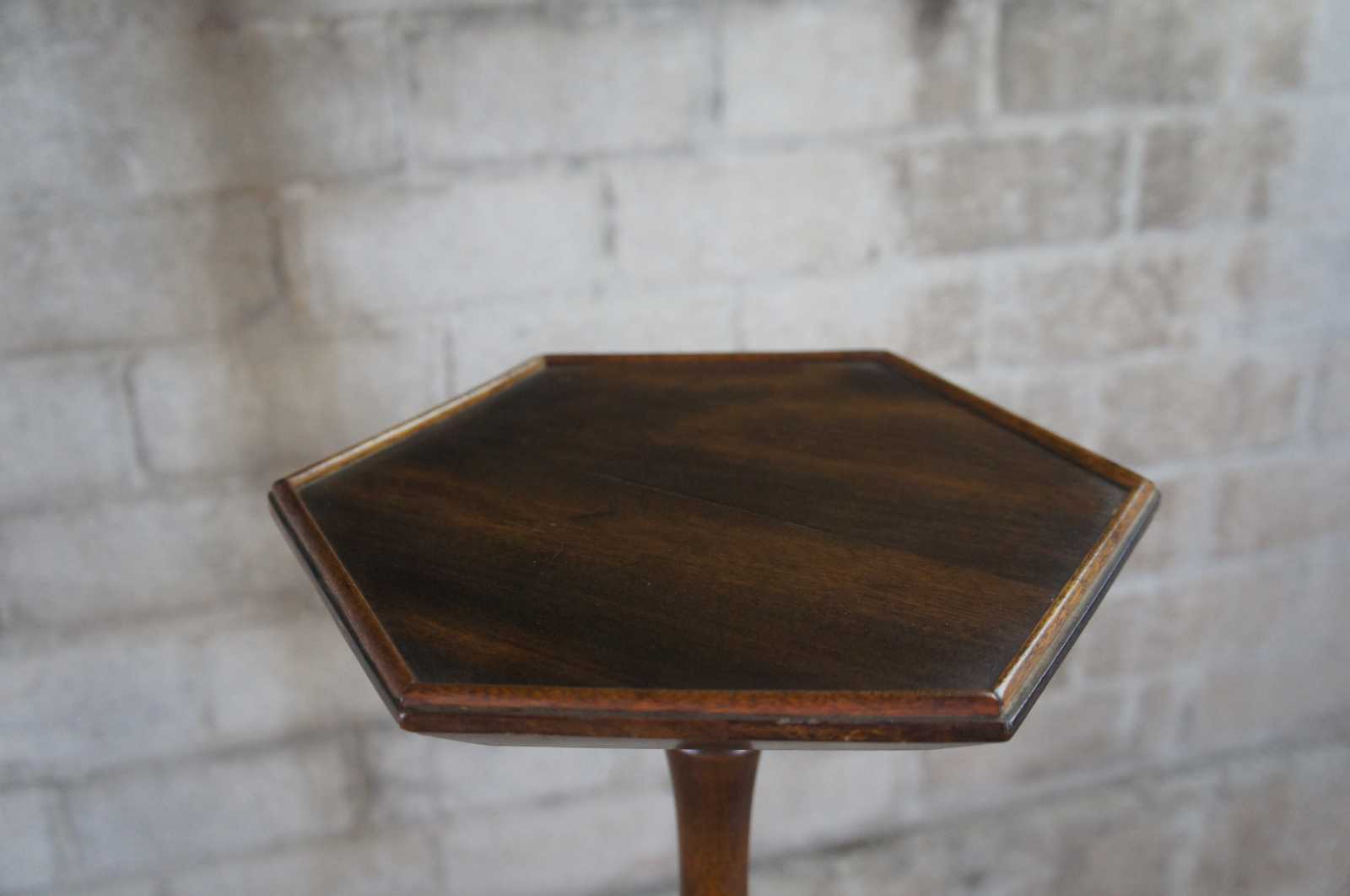 Mid 20th Century Federal inspired candle stand by J&R Furniture Mfg Co of Salt Lake City Utah. Made from walnut with an inset hexagon top over turned column and tripod base.