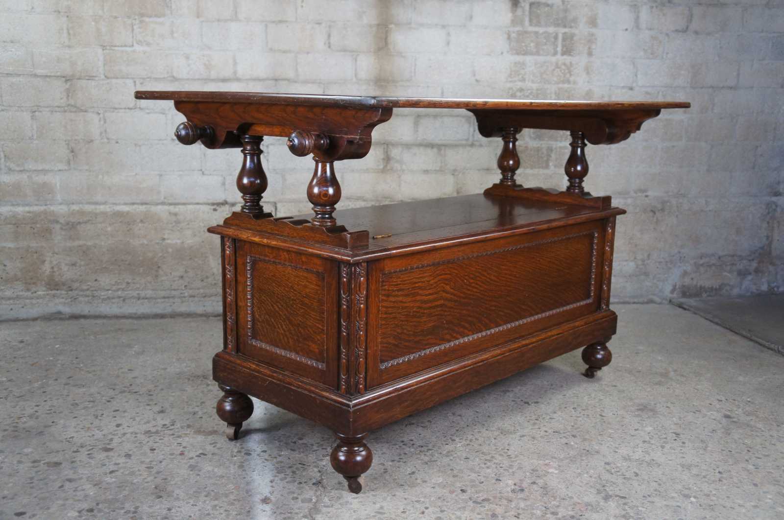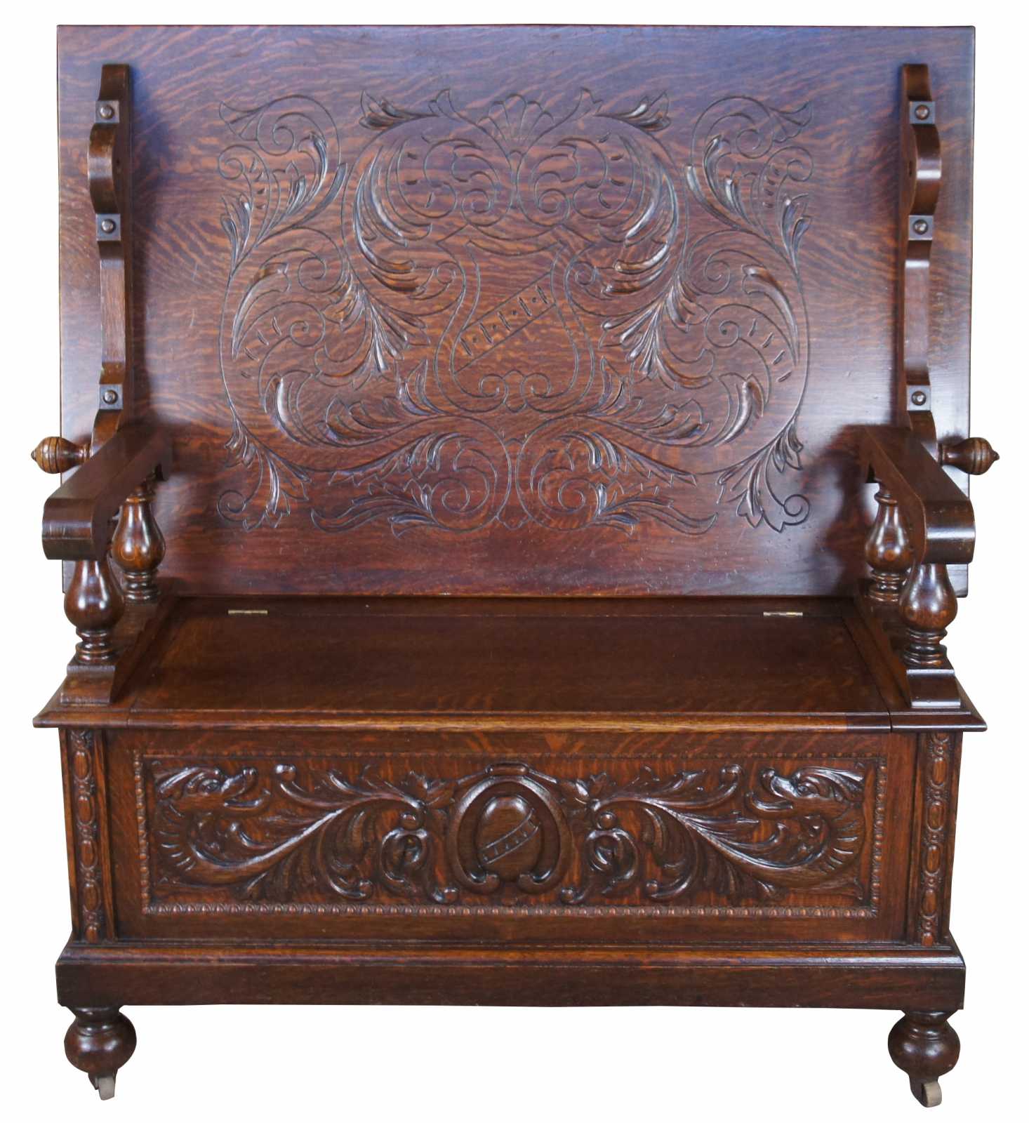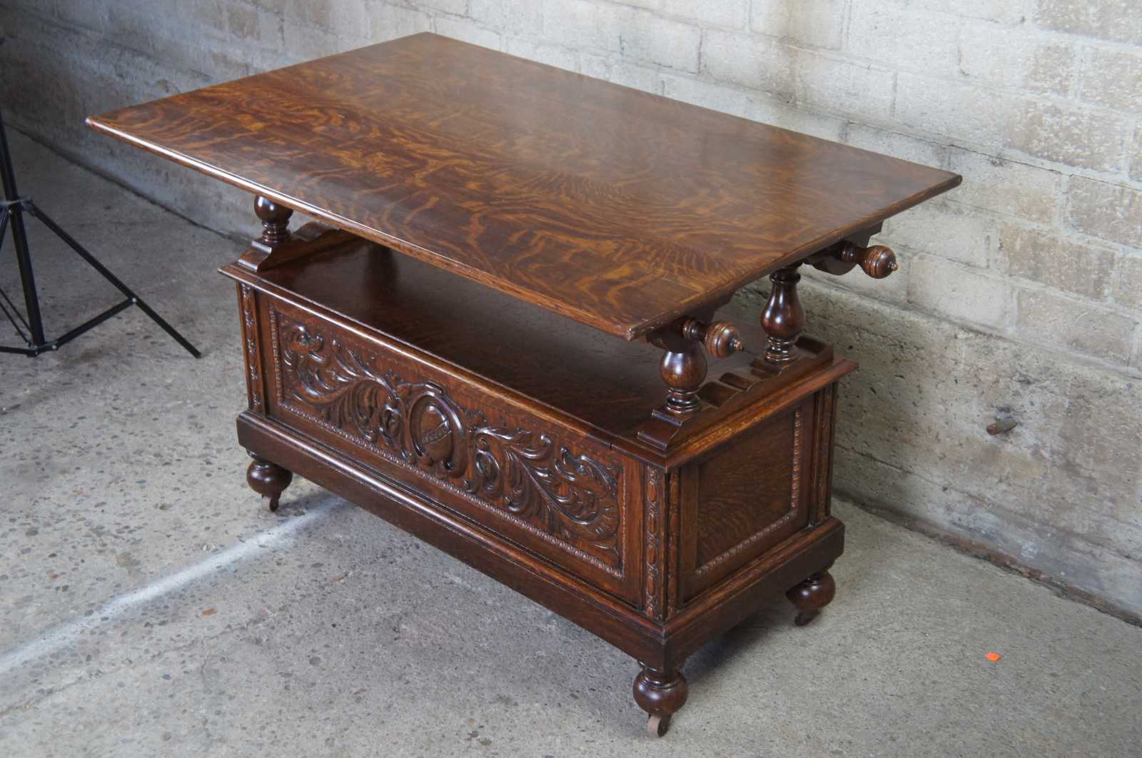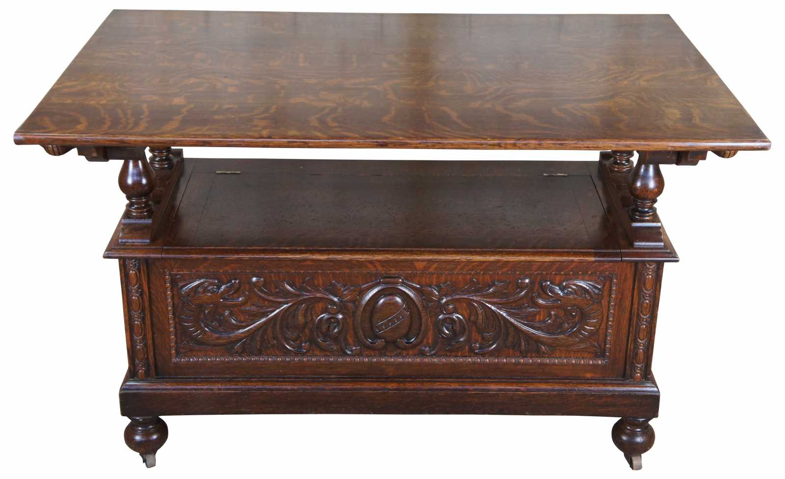 The term hutch table took form in the early 18th century when it was important to maximize storage and space. The combination of a table and a chest that could quickly be converted into a chair or settee. This beautiful example comes to us from the latter half of the 19th century. Drawing form from William & Mary styling combined with other historical English influences. Made from Quartersawn oak with a rectangular plank top that tilts upward to reveal an exquisite engraved back crest. The bench showcases a rectangular form with strong arm rest supported by turned baluster supports. The box shaped base features a beautifully carved front with mirrored serpents framed by a beaded trim. The seat lid lifts open for accessory storage. The piece is supported by bun feet with wooden casters.