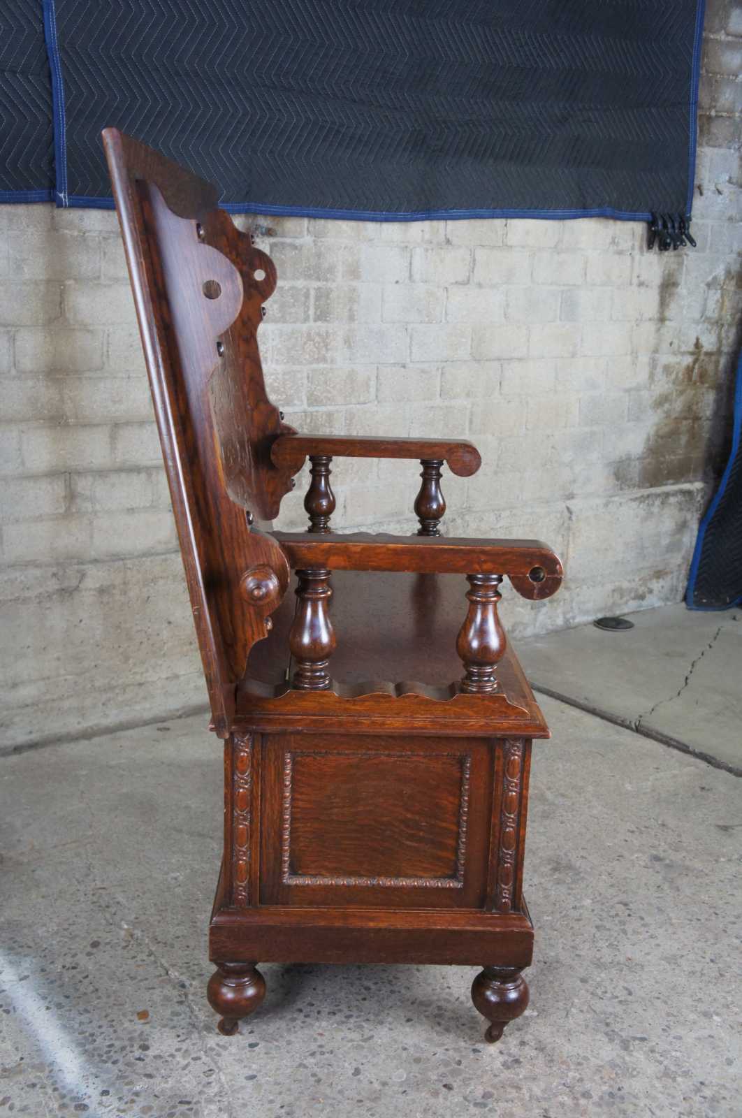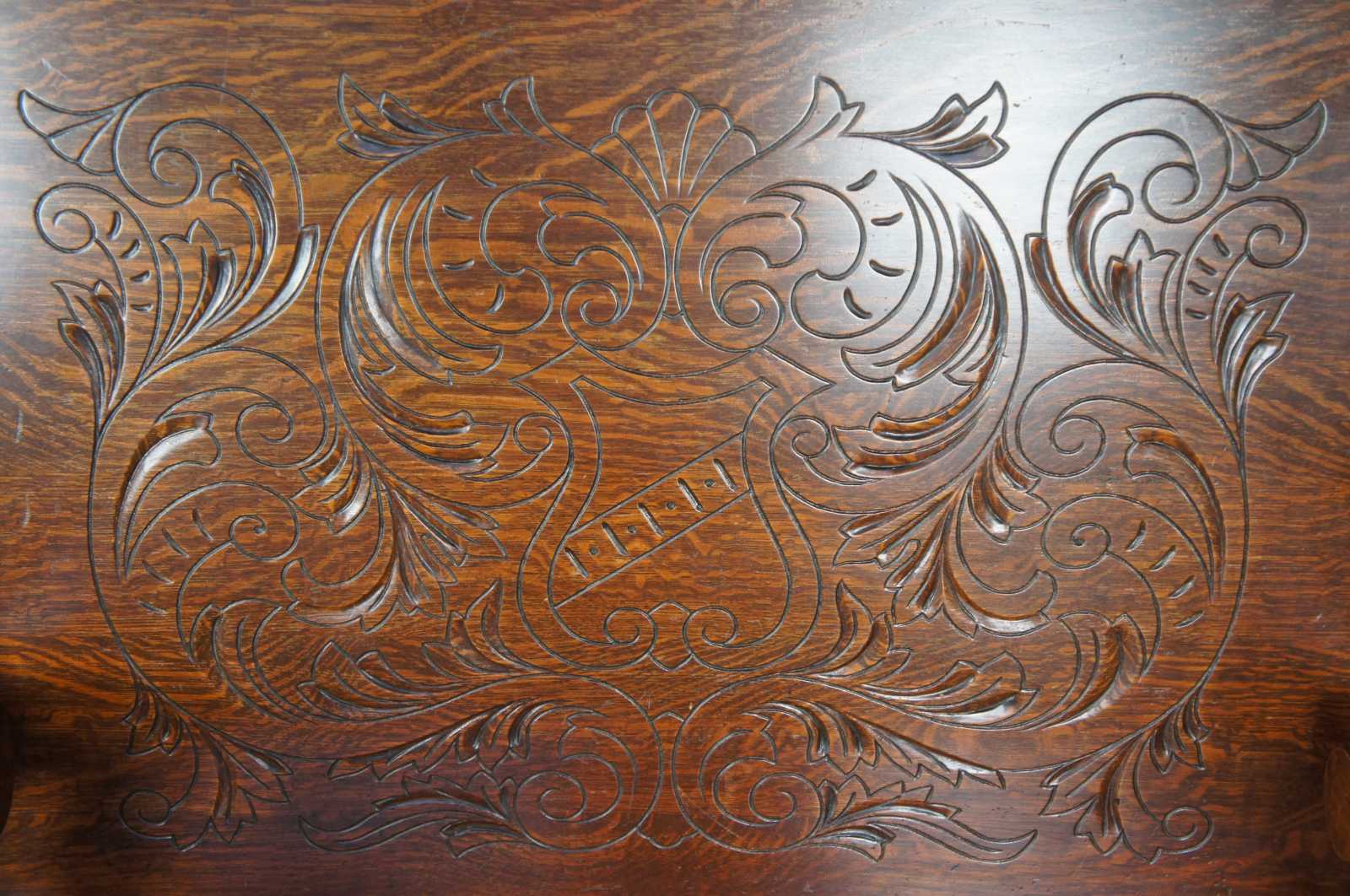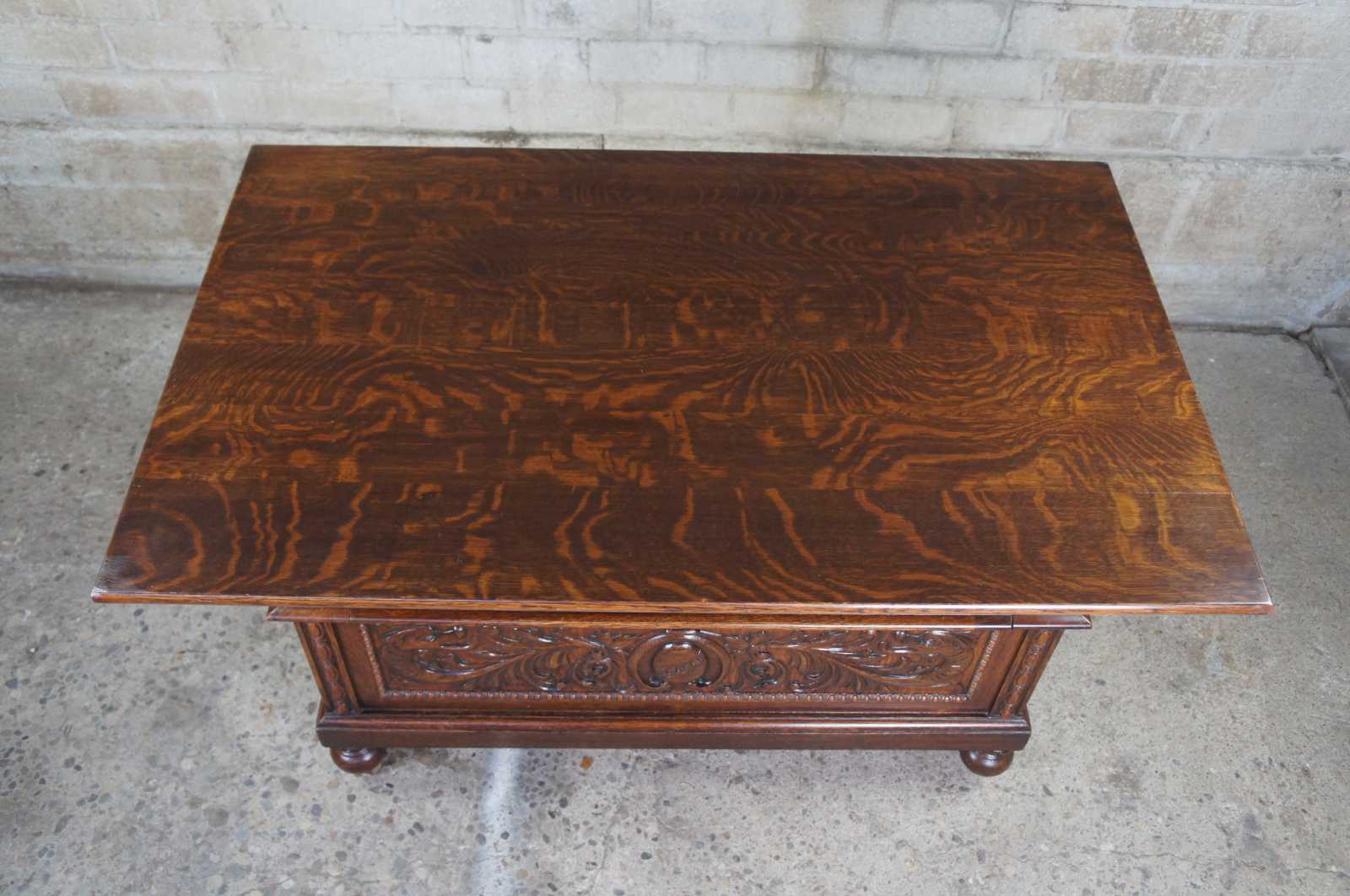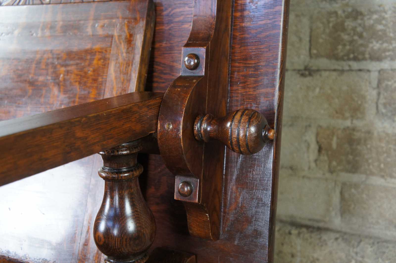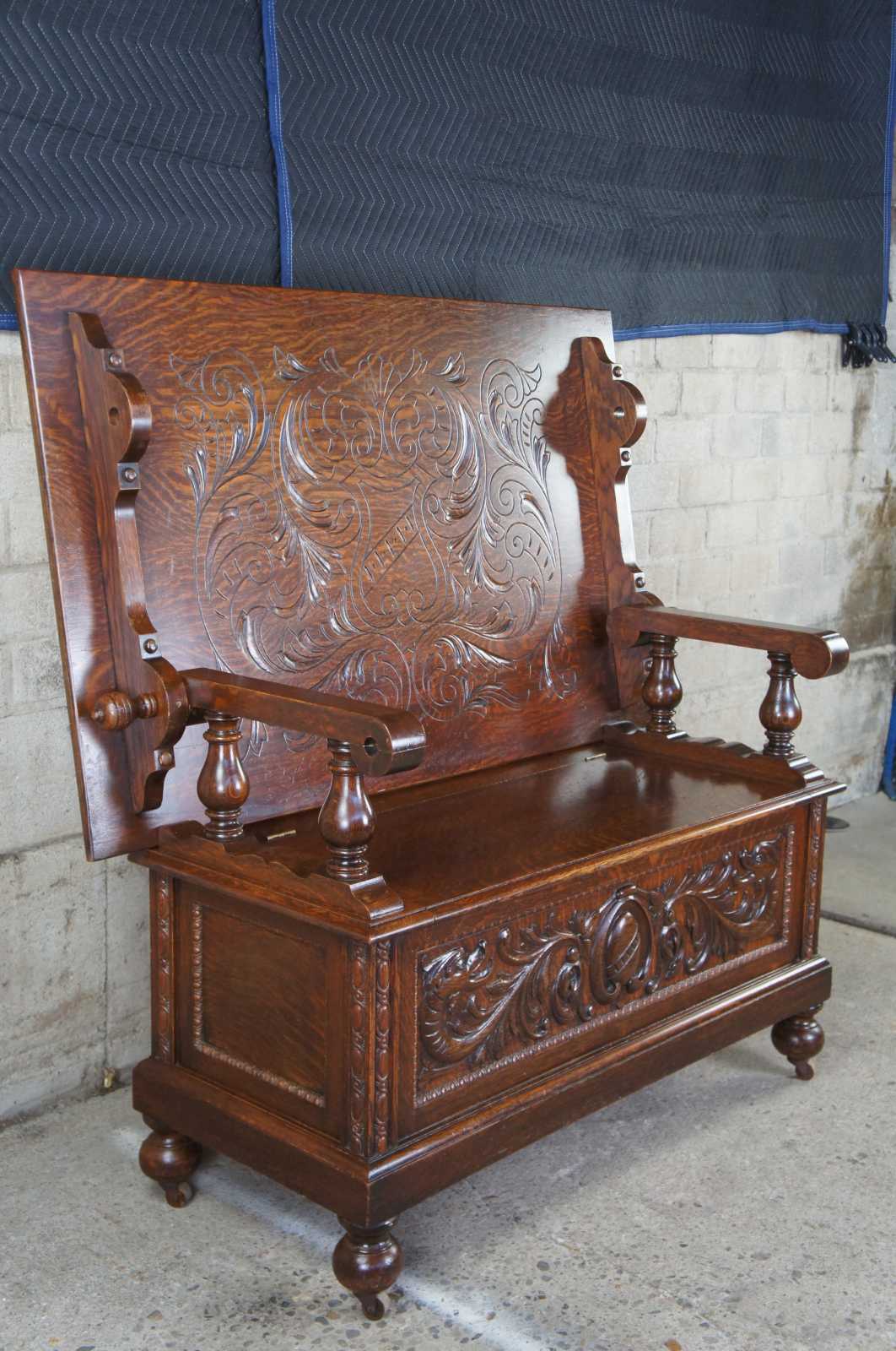 The term hutch table took form in the early 18th century when it was important to maximize storage and space. The combination of a table and a chest that could quickly be converted into a chair or settee. This beautiful example comes to us from the latter half of the 19th century. Drawing form from William & Mary styling combined with other historical English influences. Made from Quartersawn oak with a rectangular plank top that tilts upward to reveal an exquisite engraved back crest. The bench showcases a rectangular form with strong arm rest supported by turned baluster supports. The box shaped base features a beautifully carved front with mirrored serpents framed by a beaded trim. The seat lid lifts open for accessory storage. The piece is supported by bun feet with wooden casters.
