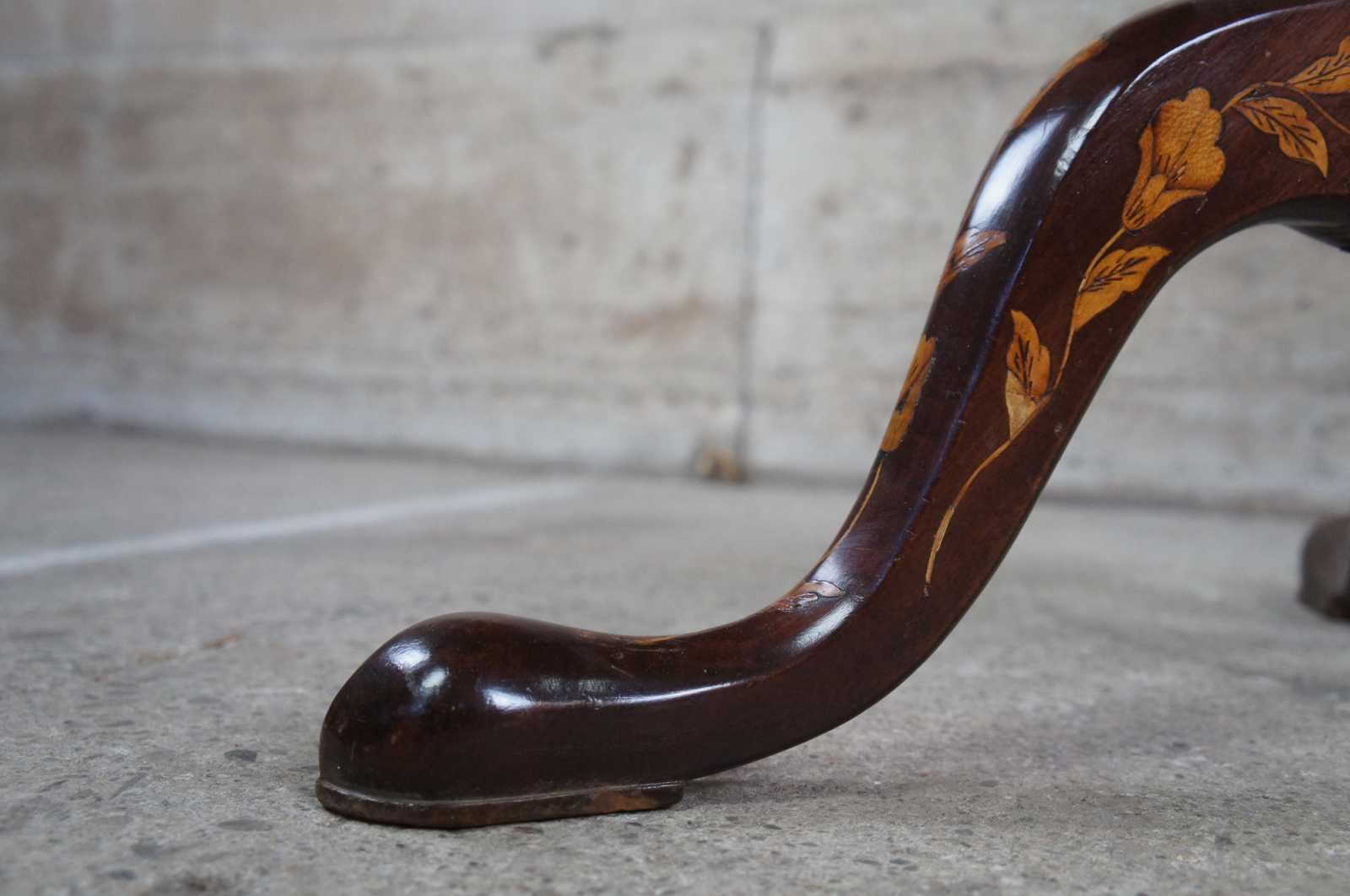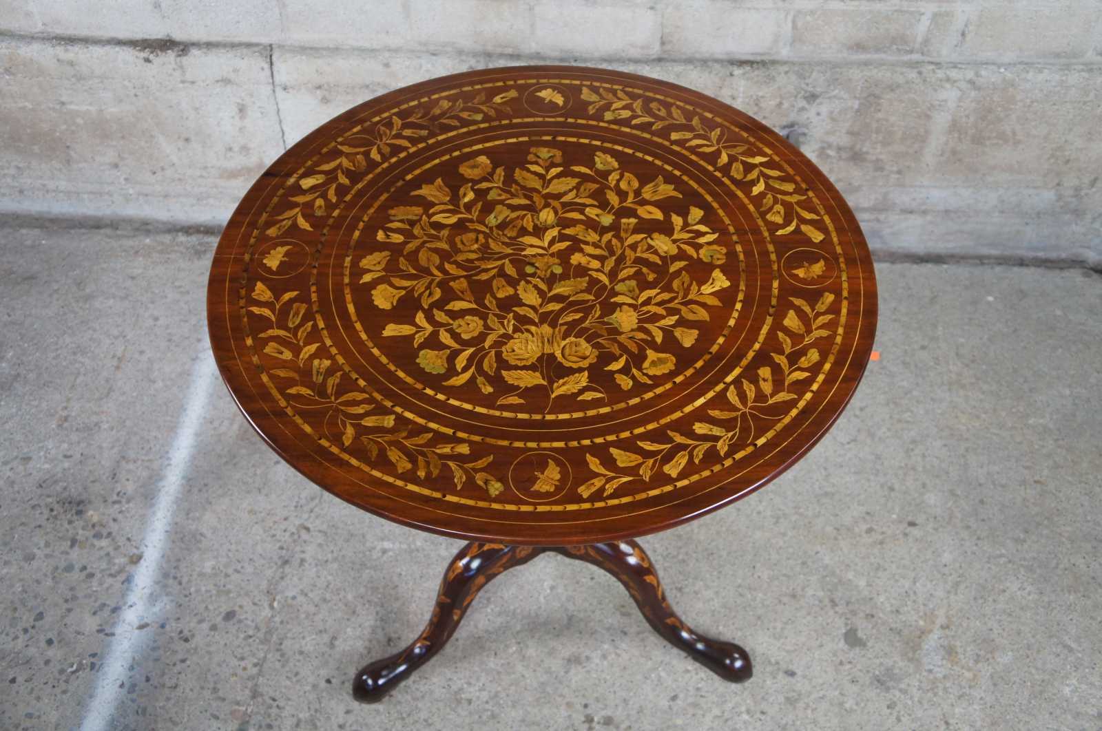 A very fine example of a mid Victorian dutch marquetry tilt top table. Made from Mahogany with beautiful floral and rose inlays. Features butterflies along each quadrant. The table is supported by a turned baluster support terminating into a tripod base with downswept legs and pad feet.