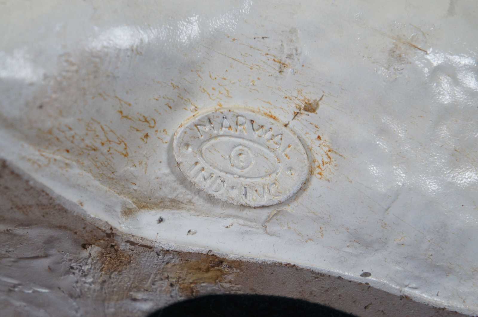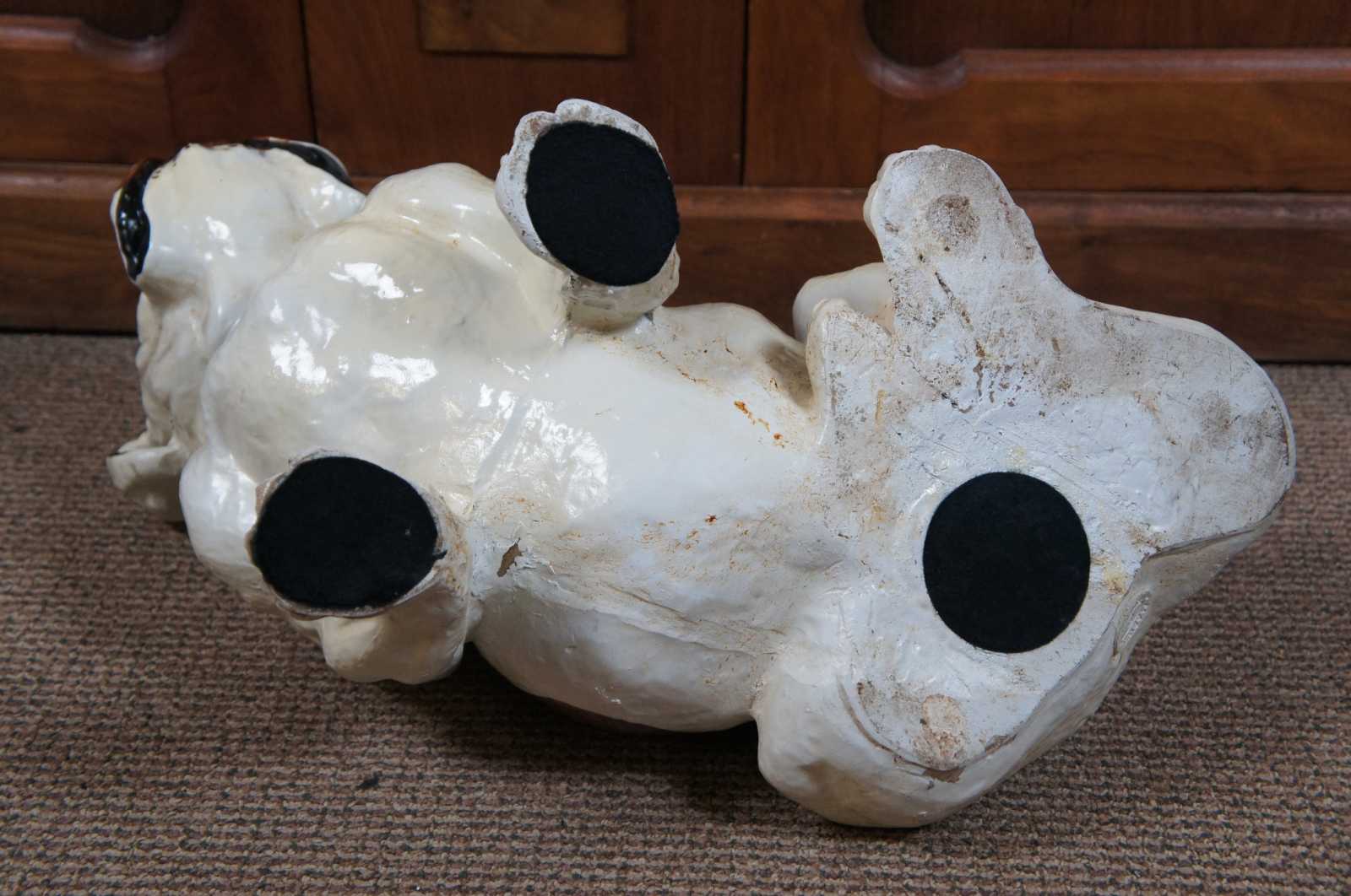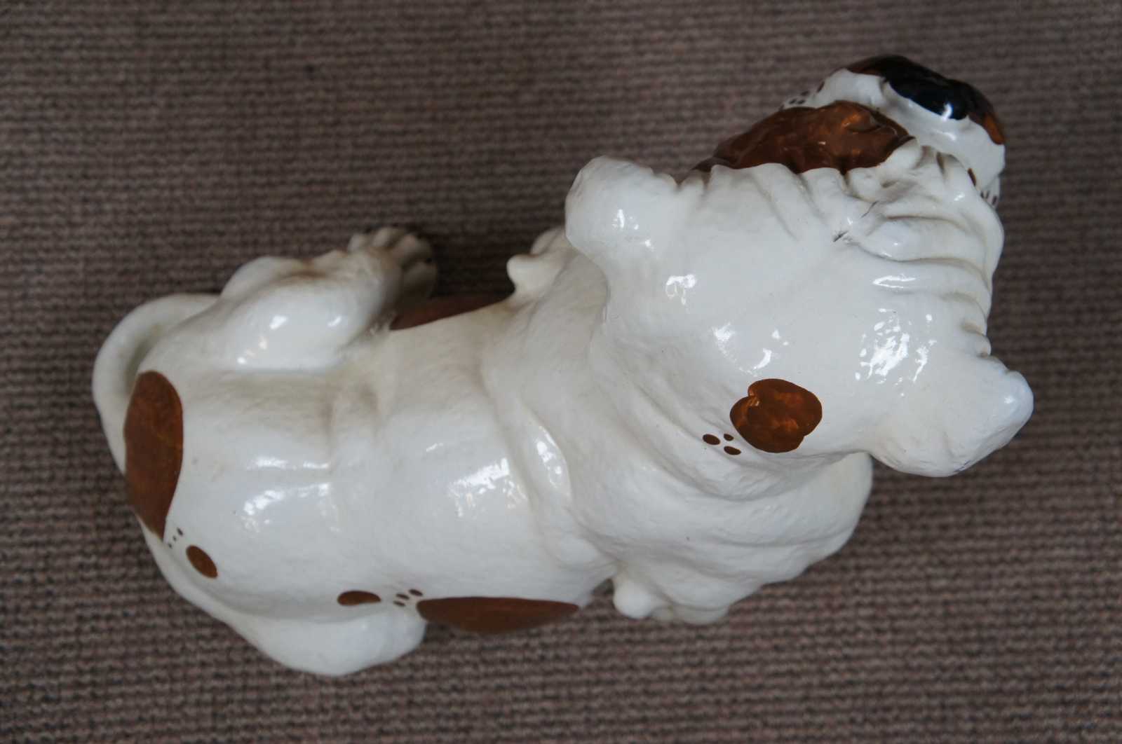 Life size vintage 1960s Marwal Ind. Inc chalkware English bulldog shaped sculpture or door stop painted in white with brown spots.