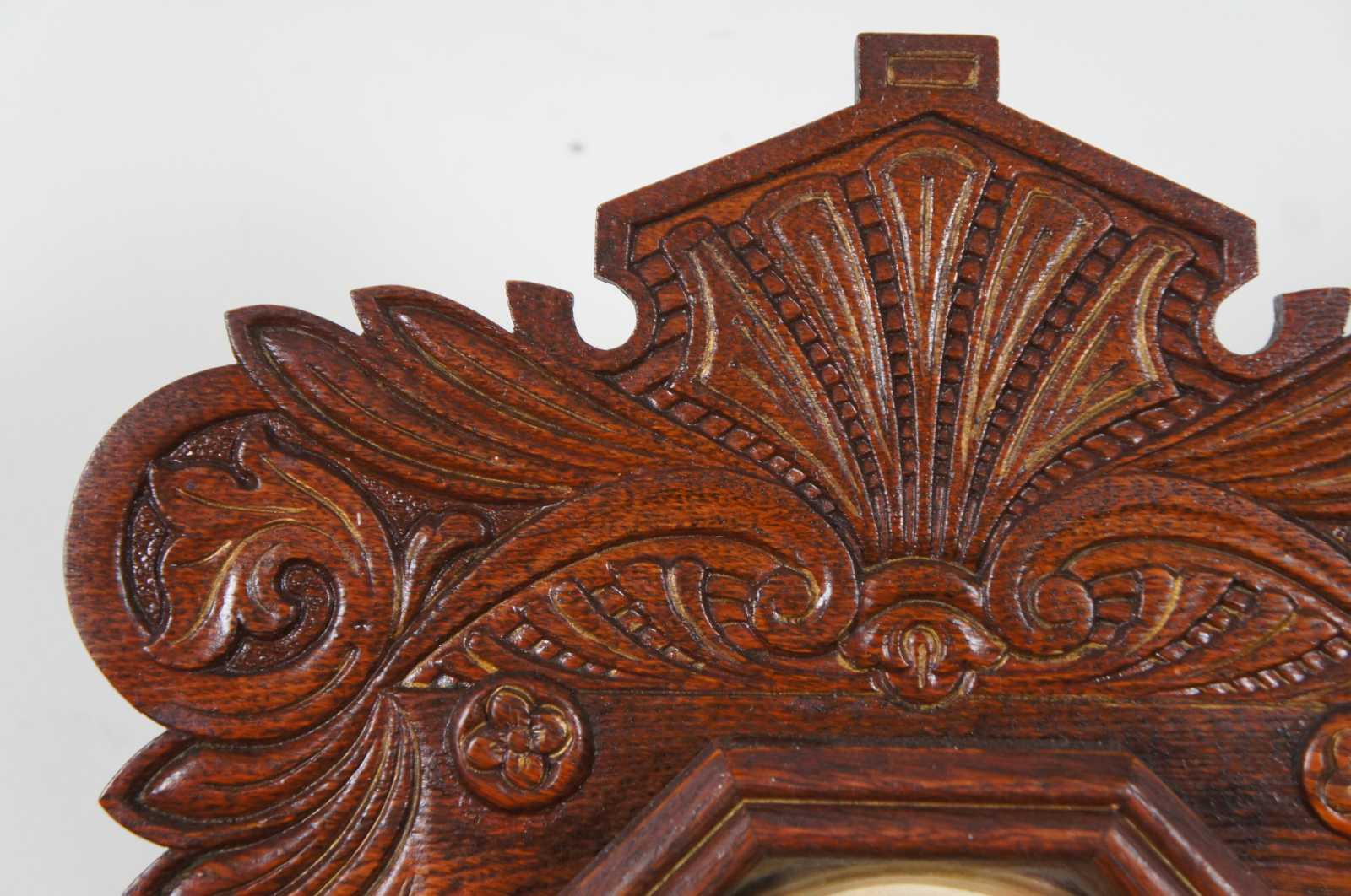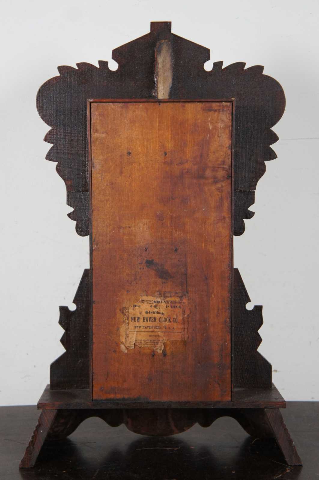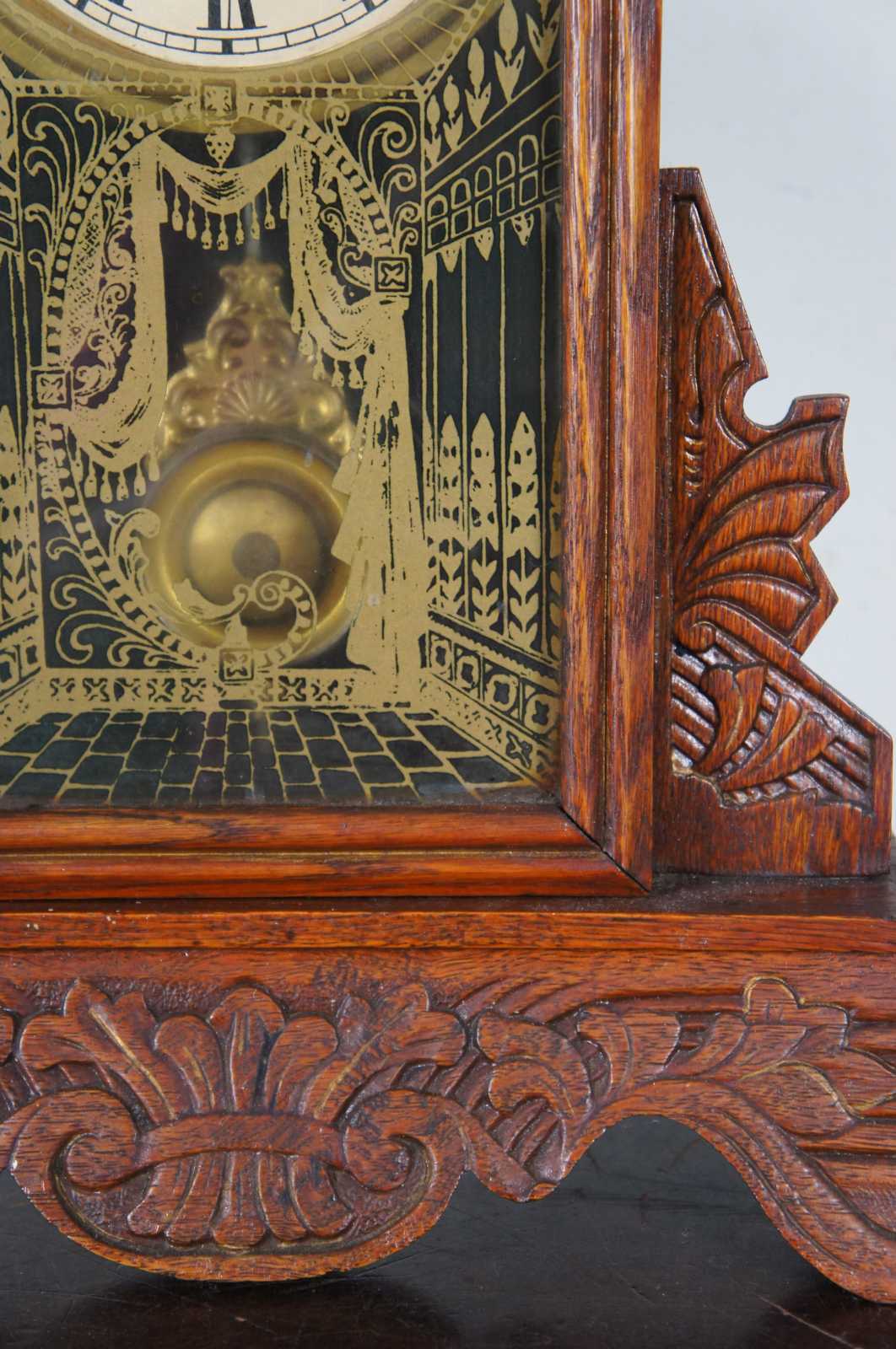 Antique 19th century New Haven “Camden” mantel clock with ornately carved body and reverse painted glass front.