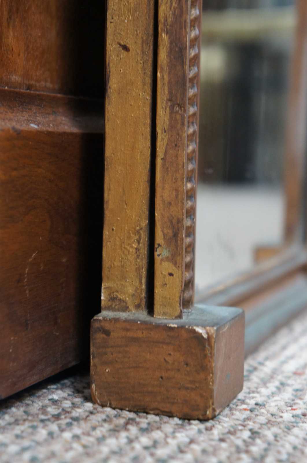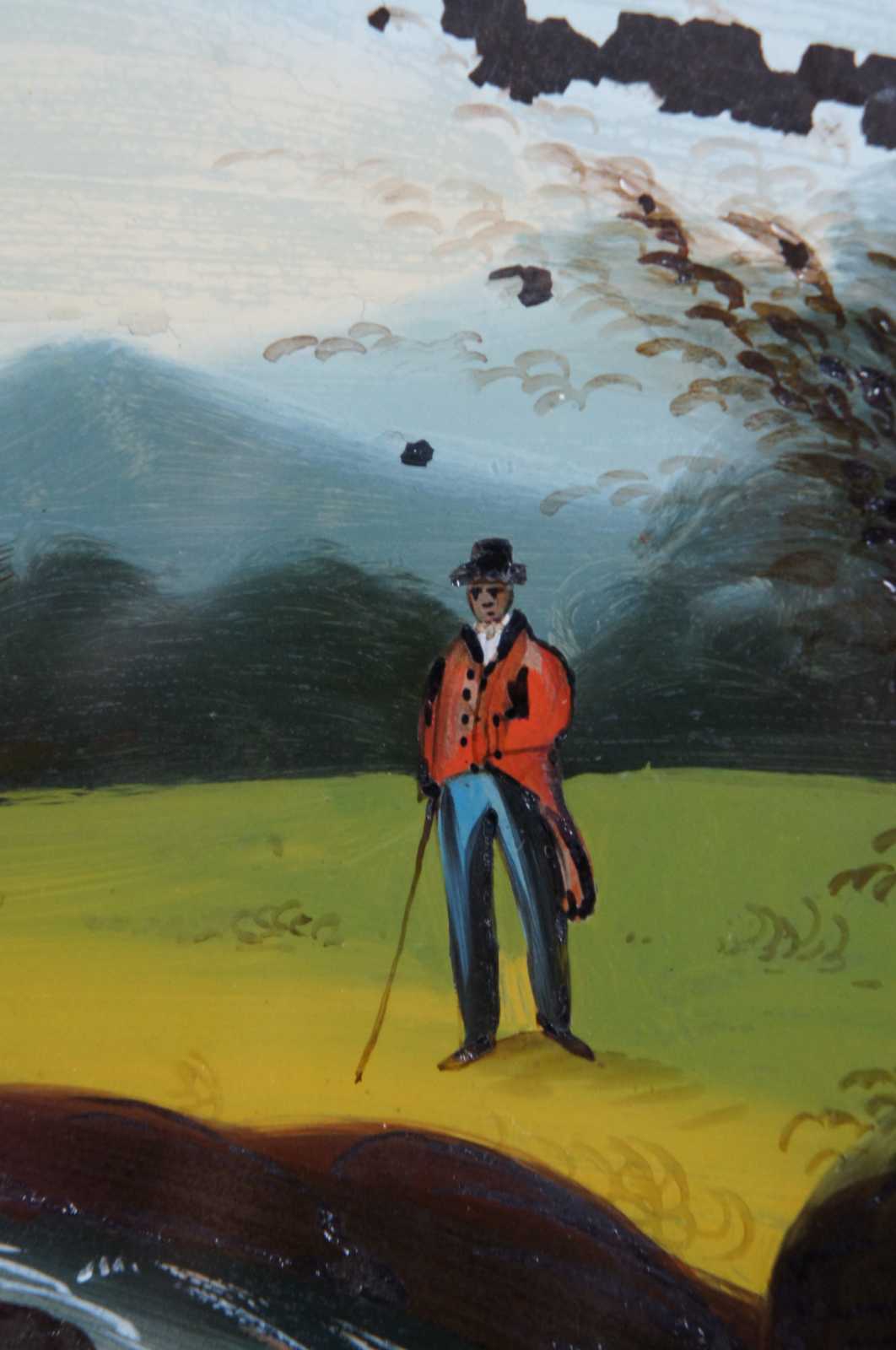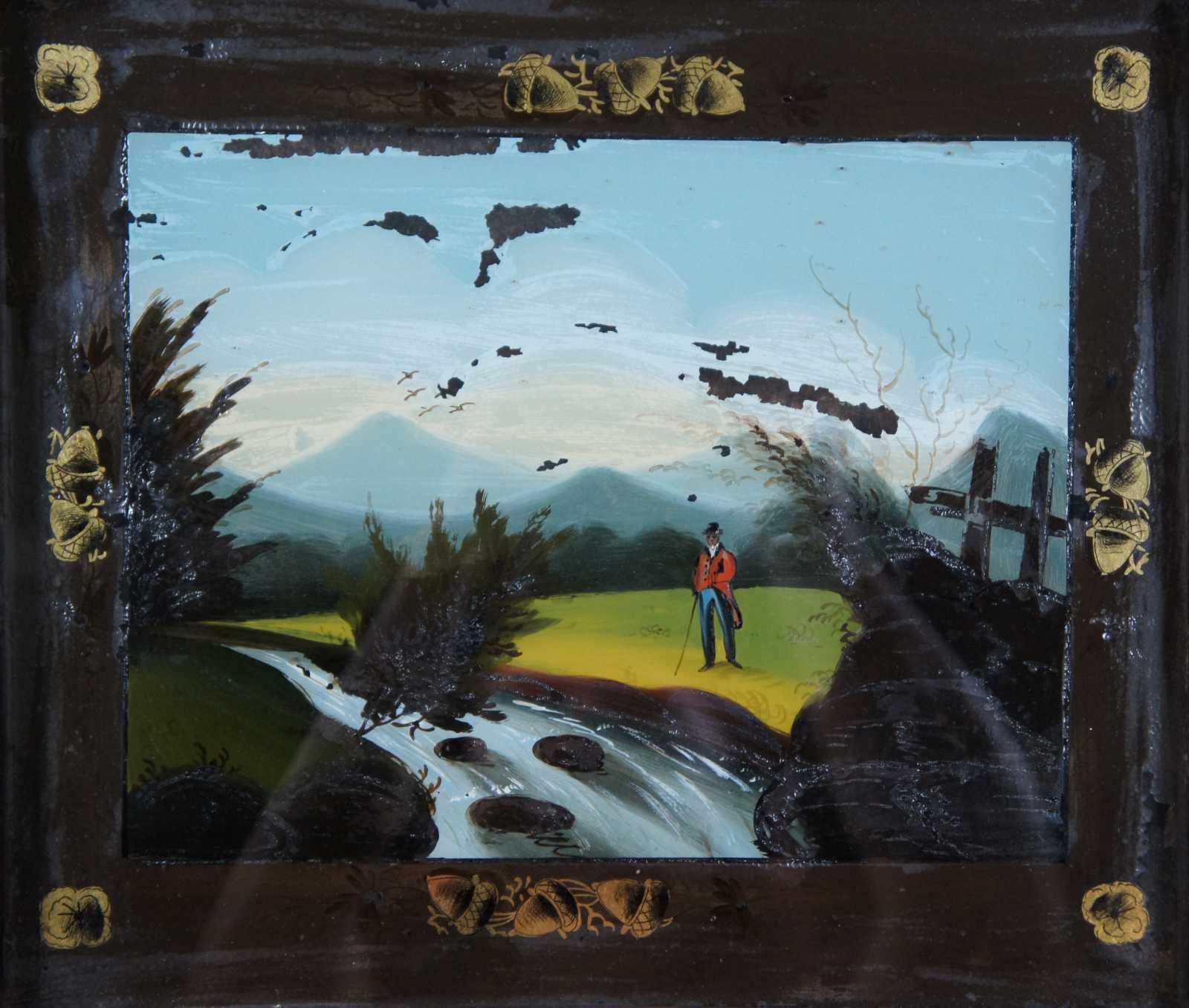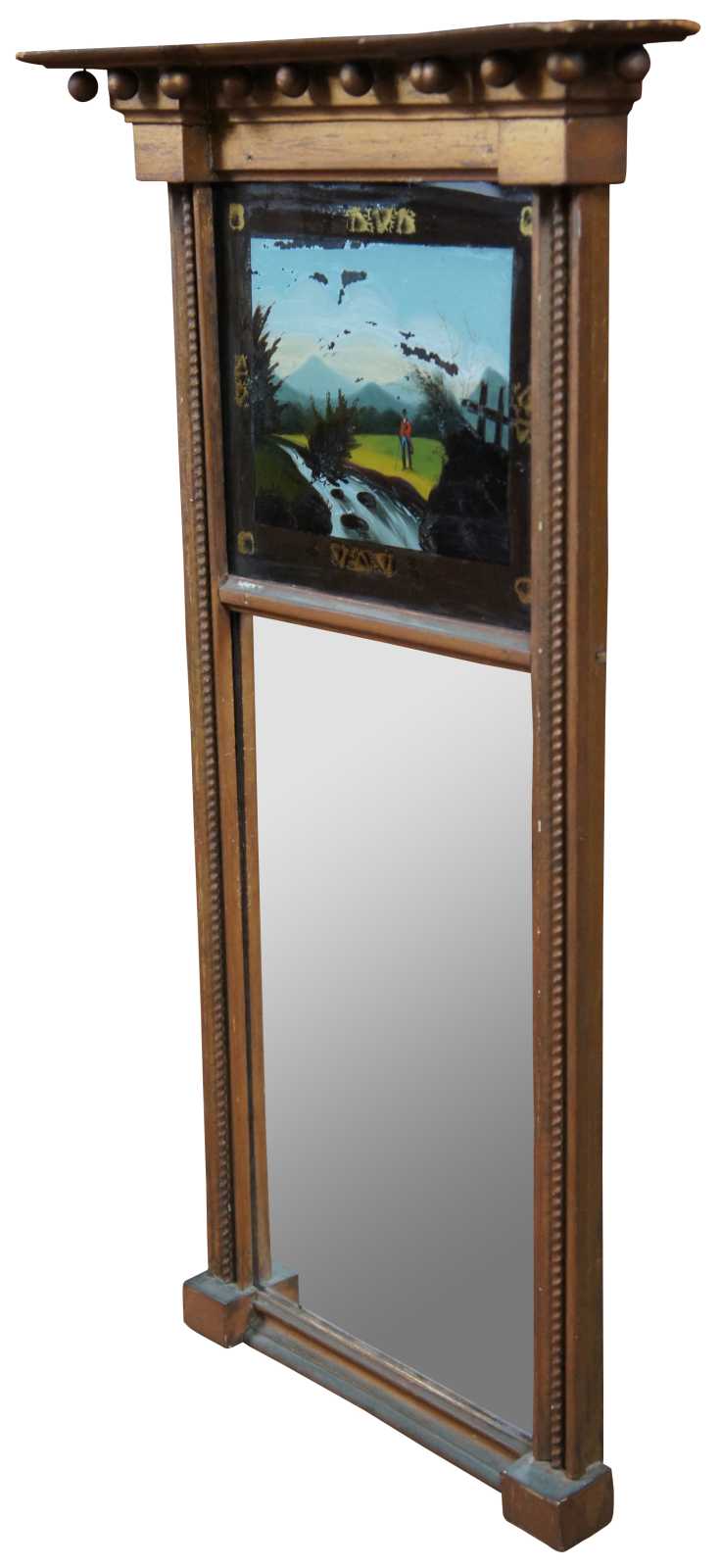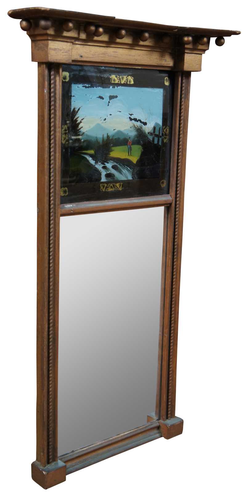 Early 19th century Federal period trumeau mirror. Features a giltwood frame with a reverse painted country landscape highlighted by a small river and a figure in a red jacket or tuxedo with a cane and top hat.