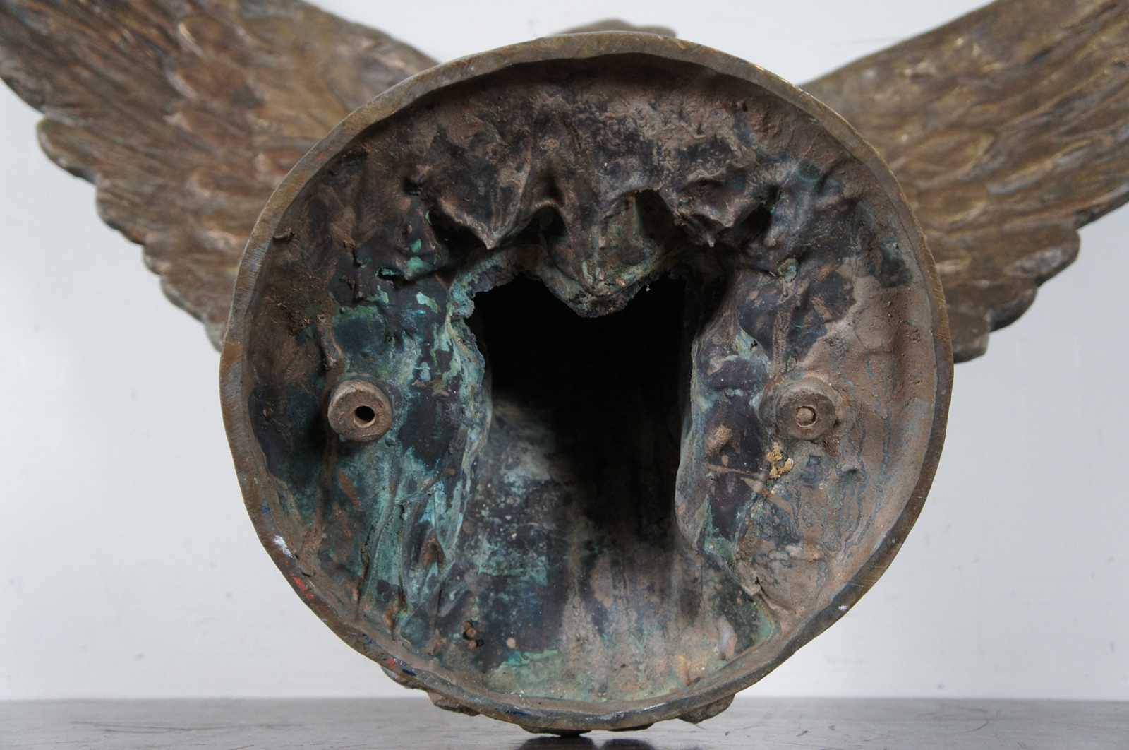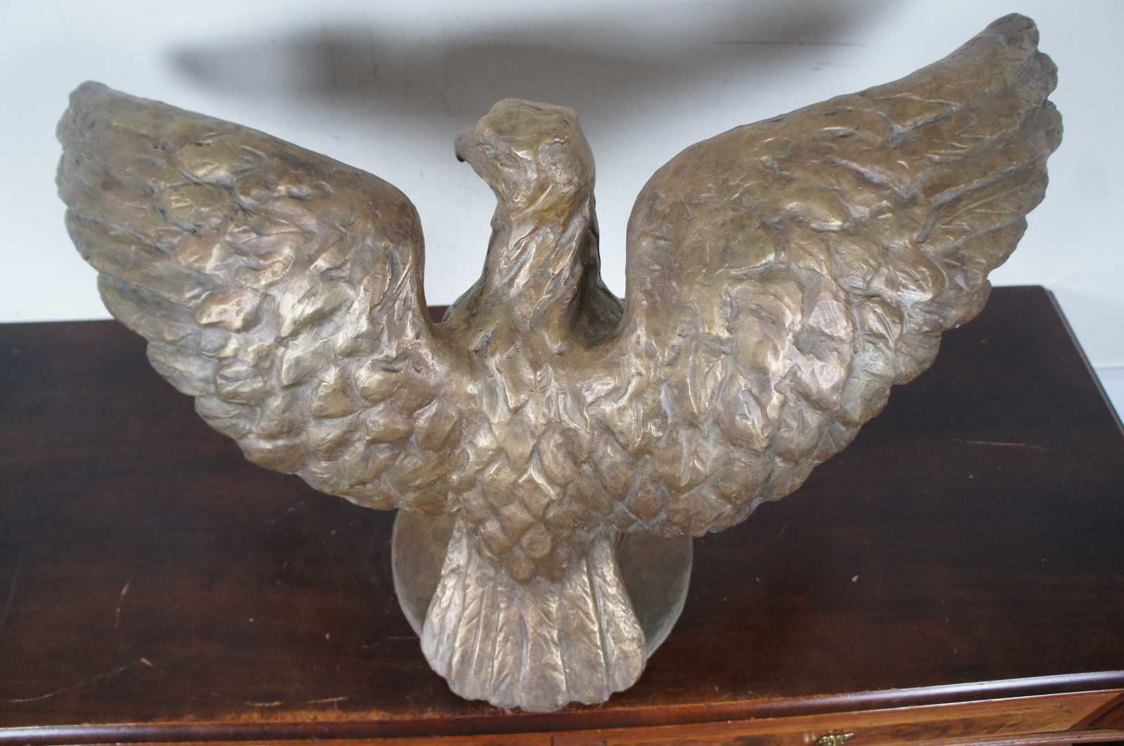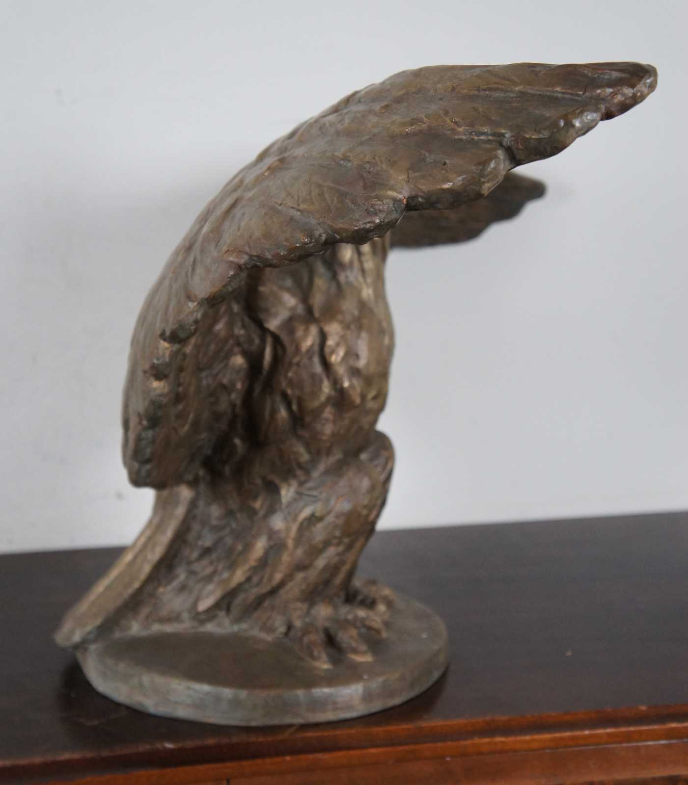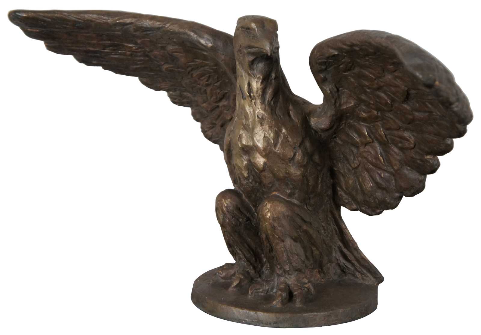 Museum quality antique solid bronze 70lb sculpture by Roman Bronze Works of an eagle seated on the base with wings outstretched. Roman Bronze Works, now operated as Roman Bronze Studios, is a bronze foundry in New York City. Established in 1897 by Riccardo Bertelli, it was the first American foundry to specialize in the lost-wax casting method, and was the country's pre-eminent art foundry during the American Renaissance. A truly impressive and rare find.