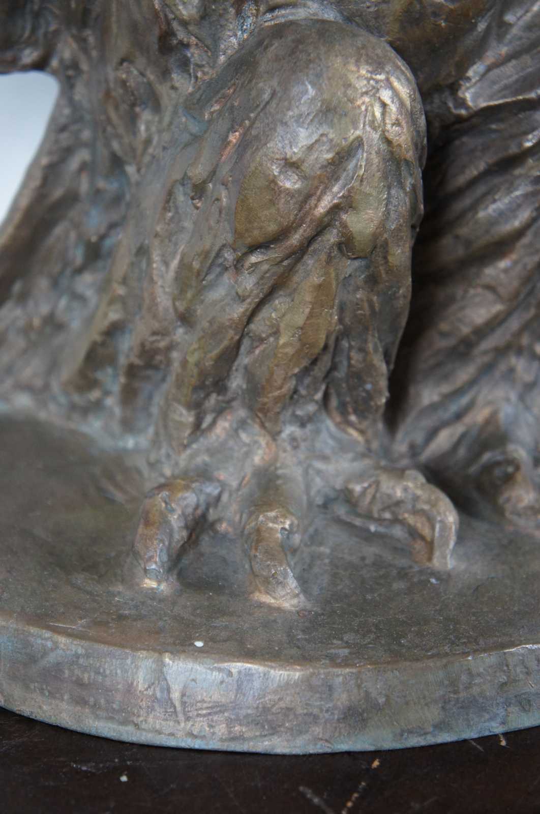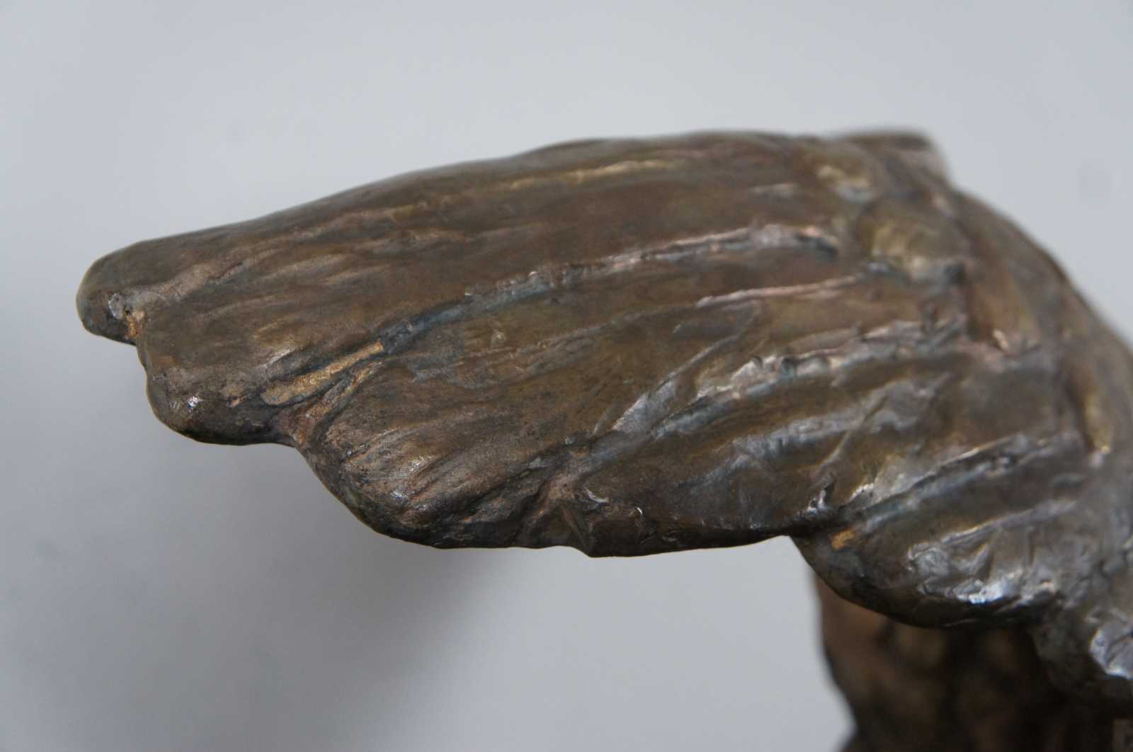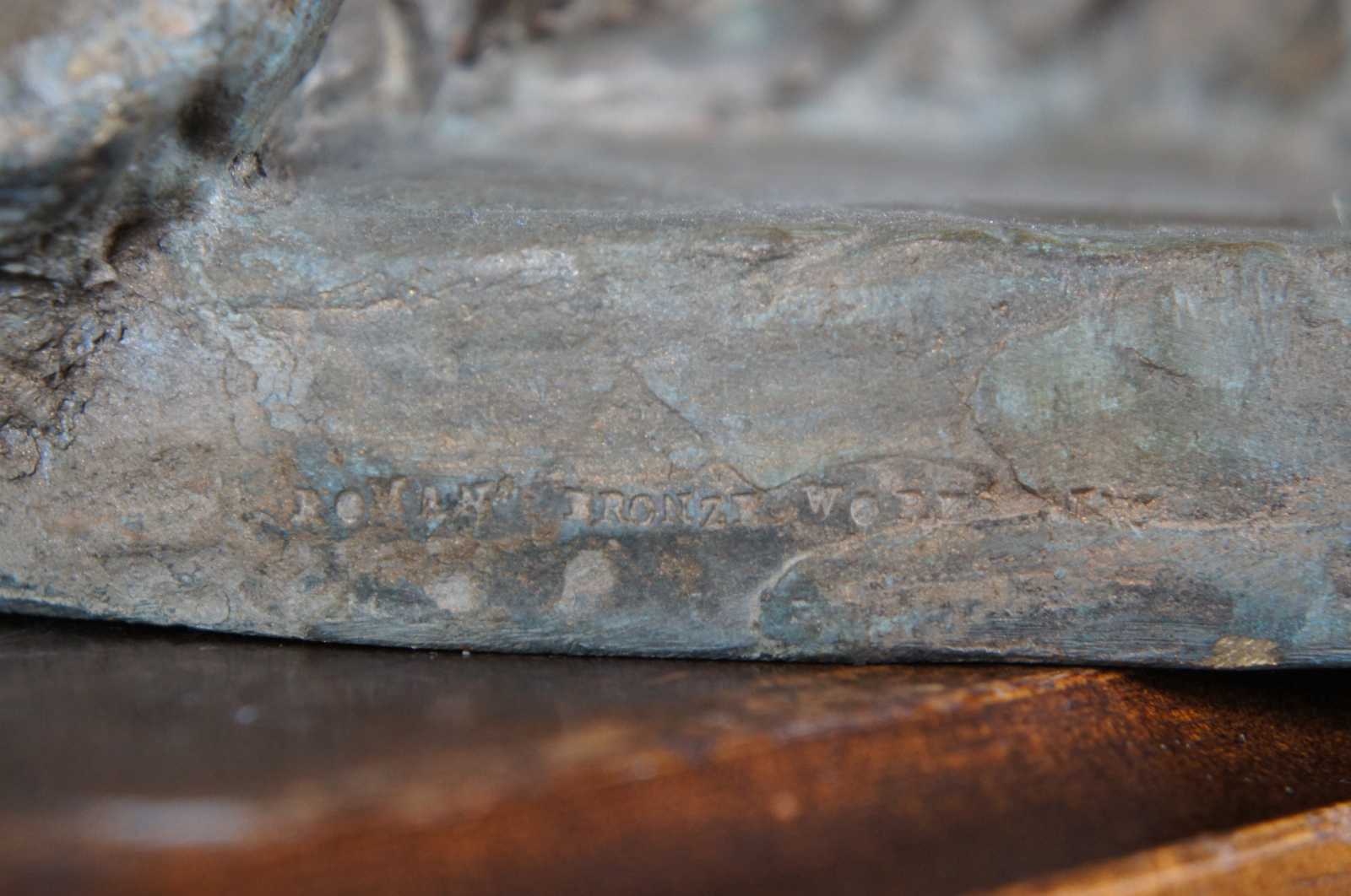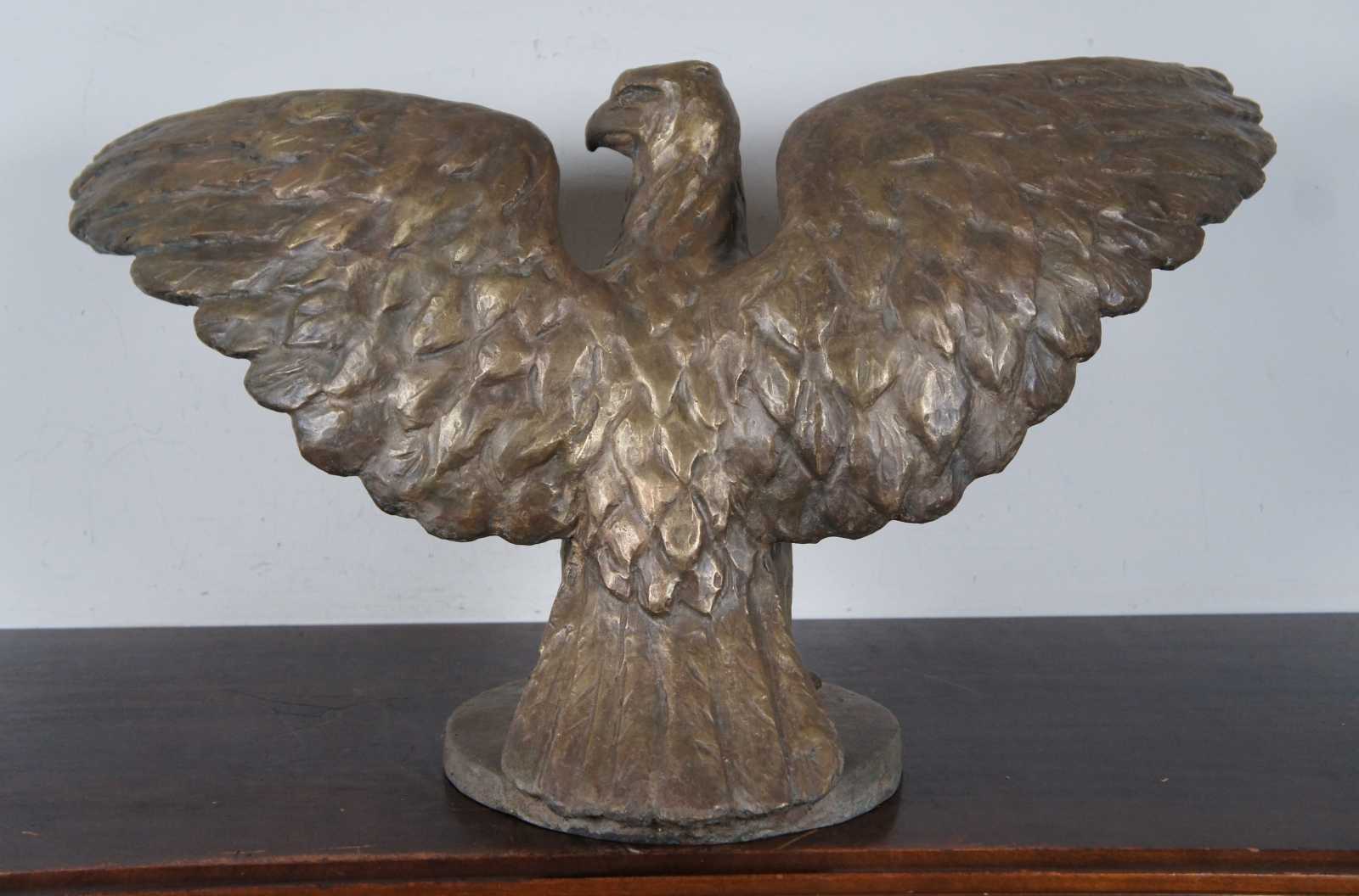 Museum quality antique solid bronze 70lb sculpture by Roman Bronze Works of an eagle seated on the base with wings outstretched. Roman Bronze Works, now operated as Roman Bronze Studios, is a bronze foundry in New York City. Established in 1897 by Riccardo Bertelli, it was the first American foundry to specialize in the lost-wax casting method, and was the country's pre-eminent art foundry during the American Renaissance. A truly impressive and rare find.