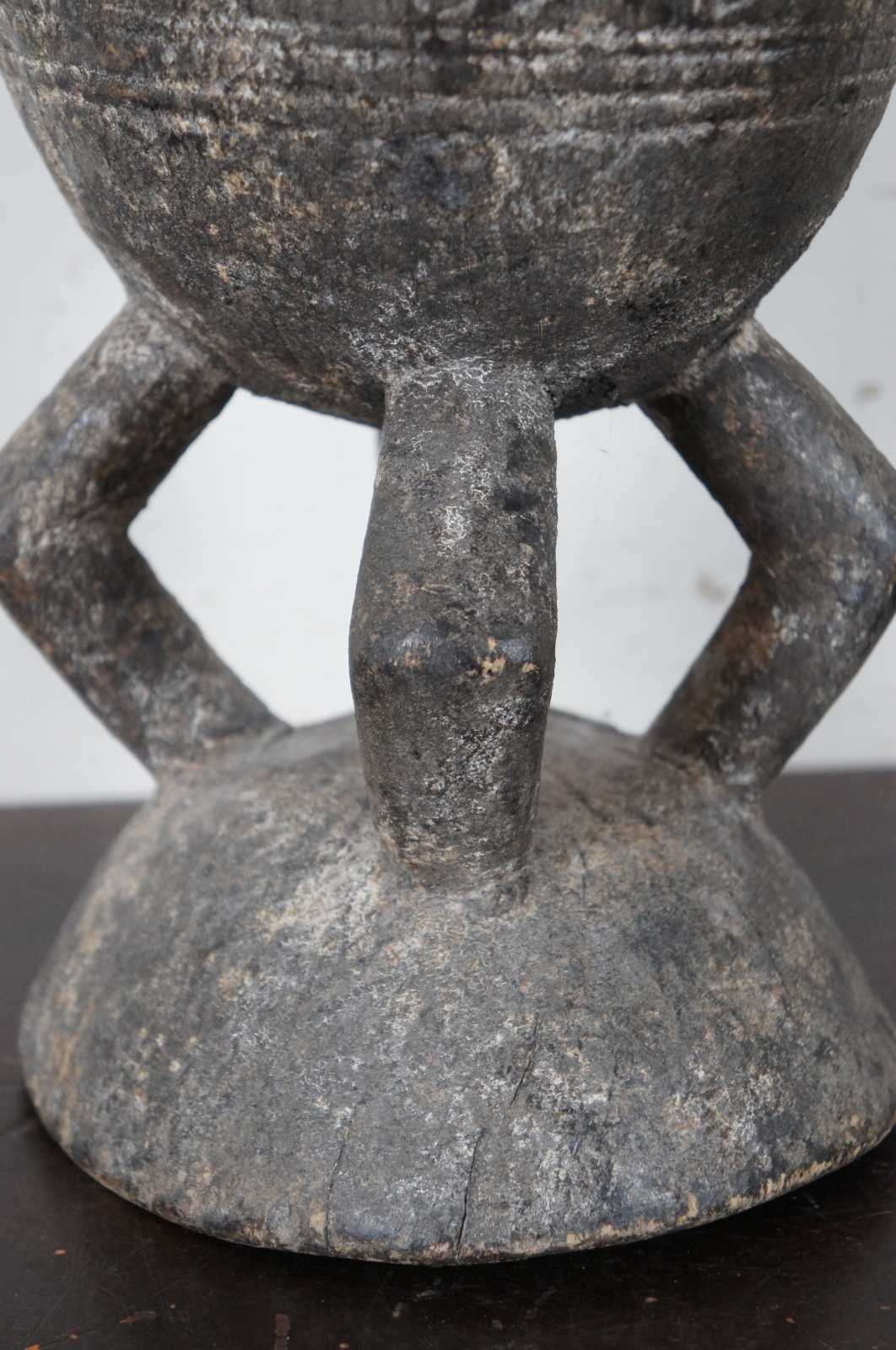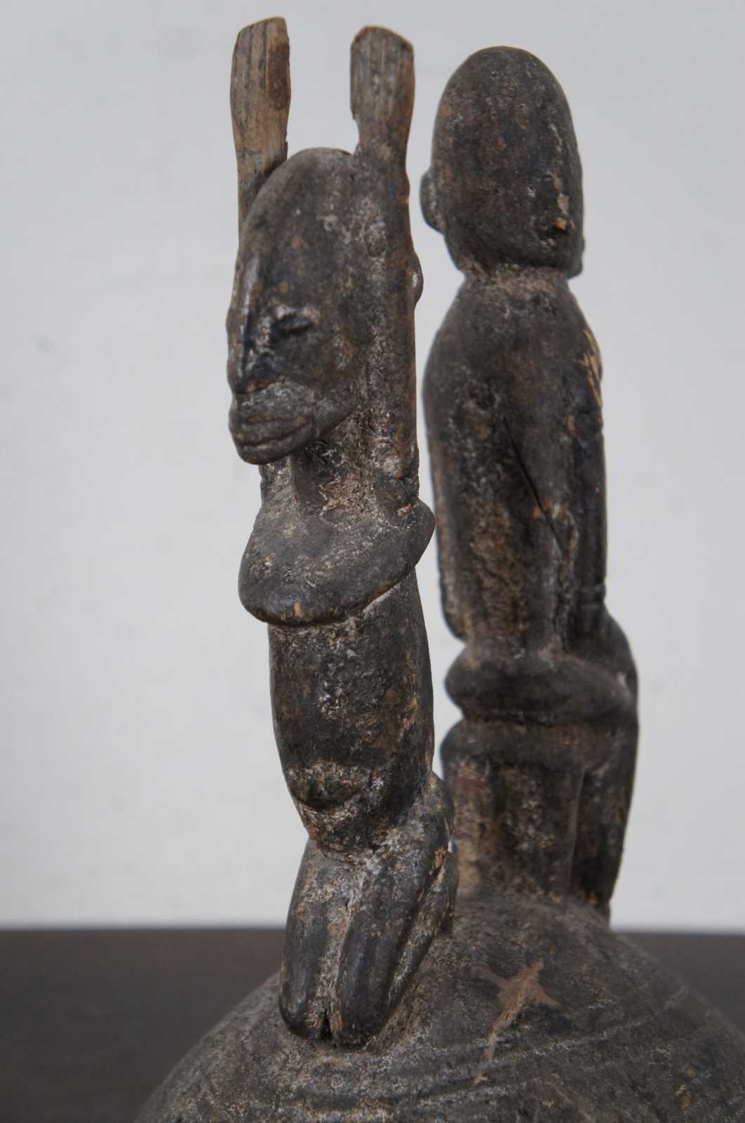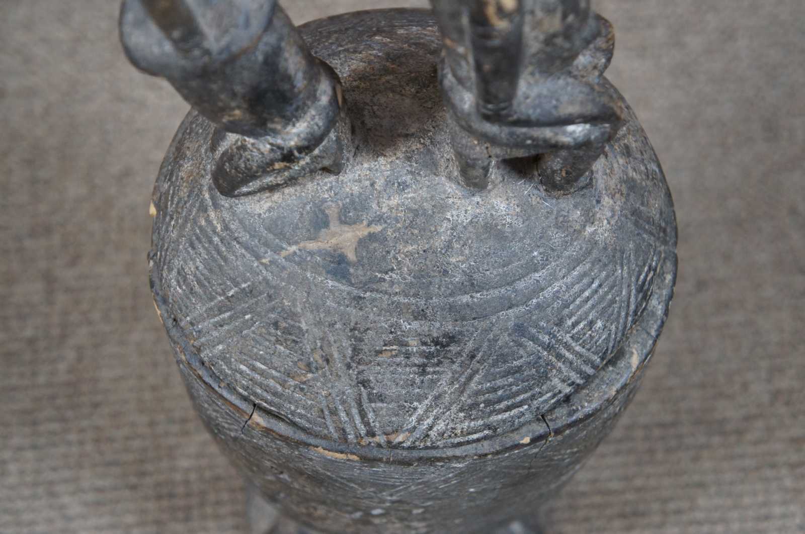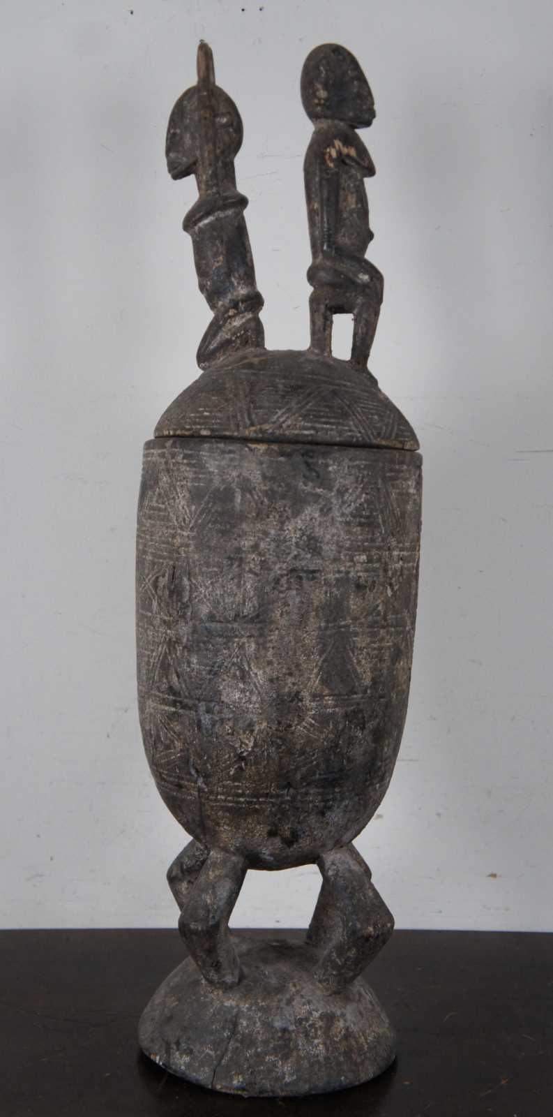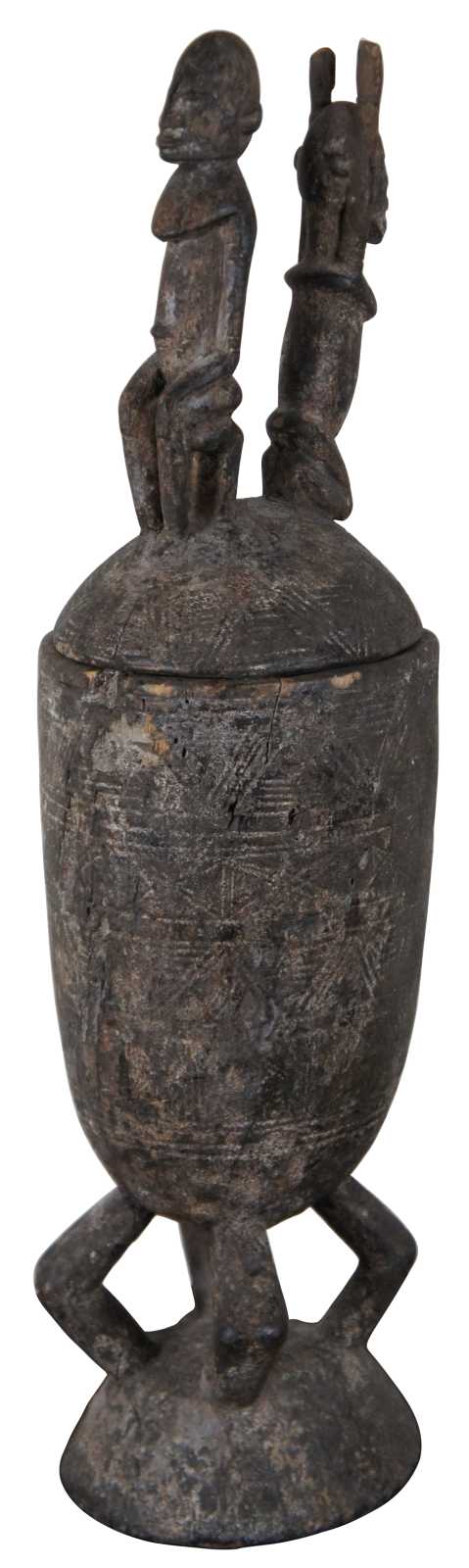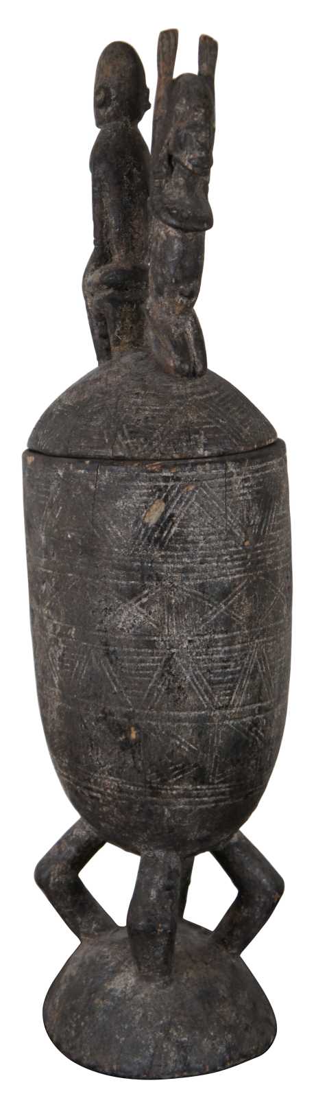 Monumental antique carved wooden Dogon ceremonial vessel consisting of an urn shaped body supported on a four legged base, carved with geometric patterns a round lid topped with a pair of nommo figures, one seated and one kneeling. An exceptional museum quality find. The Dogon (or Kaador, Kaado) are an ethnic group indigenous to the central plateau region of Mali, in West Africa, south of the Niger bend, near the city of Bandiagara, and in Burkina Faso. The population numbers between 400,000 and 800,000. Dogon containers were used to hold food consumed during the investment rituals of Dogon religious and political leaders known as hogon. Hogon are the high priests of the cult of Lebe, the first Dogon ancestor to die, whose body was miraculously transformed into a snake after his death. Associated with regeneration and renewal, the cult is charged with maintaining the earth's fertility and ensuring the protection and well-being of Dogon society.