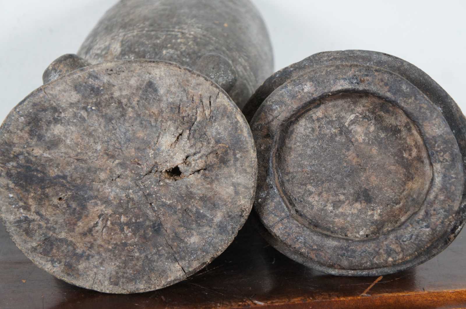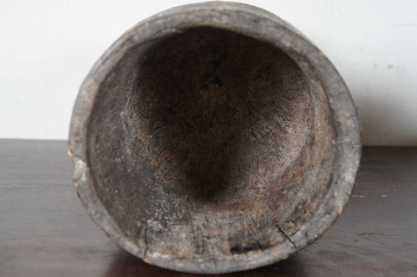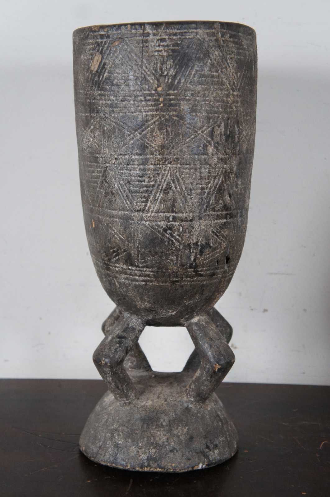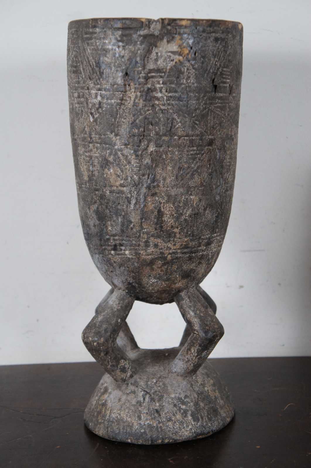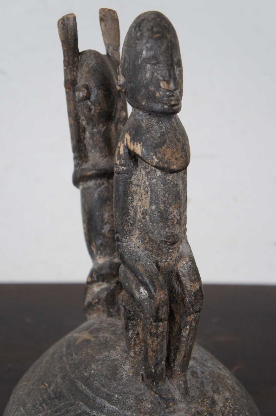 Monumental antique carved wooden Dogon ceremonial vessel consisting of an urn shaped body supported on a four legged base, carved with geometric patterns a round lid topped with a pair of nommo figures, one seated and one kneeling. An exceptional museum quality find. The Dogon (or Kaador, Kaado) are an ethnic group indigenous to the central plateau region of Mali, in West Africa, south of the Niger bend, near the city of Bandiagara, and in Burkina Faso. The population numbers between 400,000 and 800,000. Dogon containers were used to hold food consumed during the investment rituals of Dogon religious and political leaders known as hogon. Hogon are the high priests of the cult of Lebe, the first Dogon ancestor to die, whose body was miraculously transformed into a snake after his death. Associated with regeneration and renewal, the cult is charged with maintaining the earth's fertility and ensuring the protection and well-being of Dogon society.