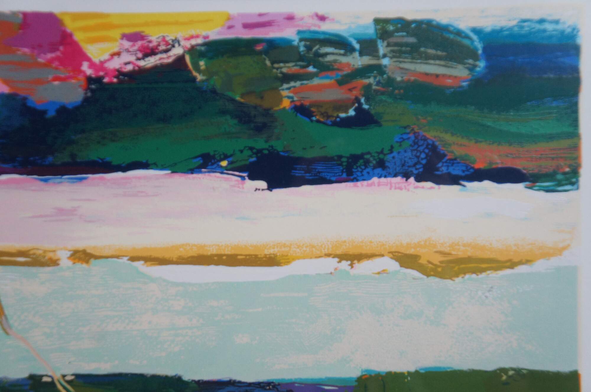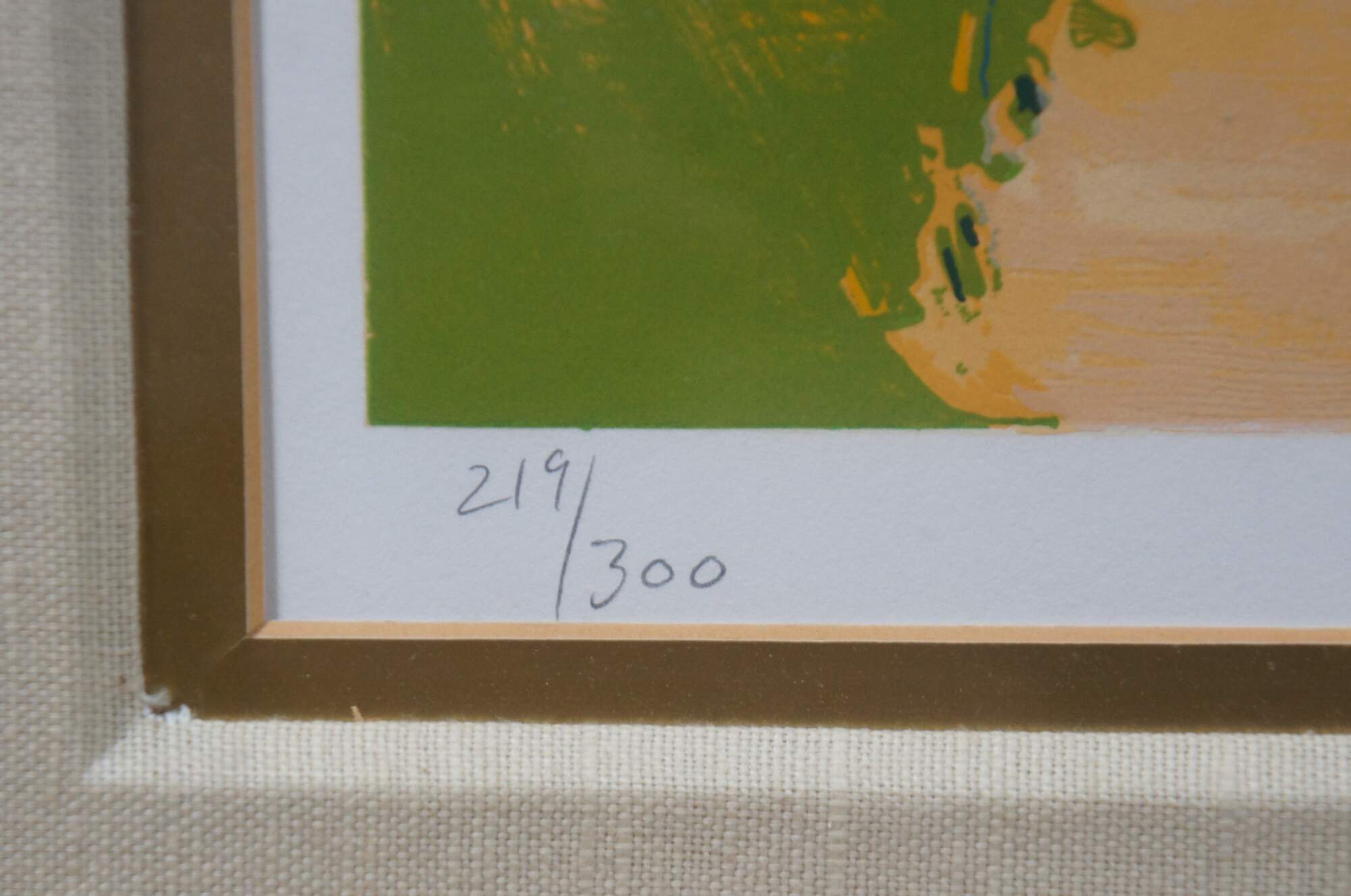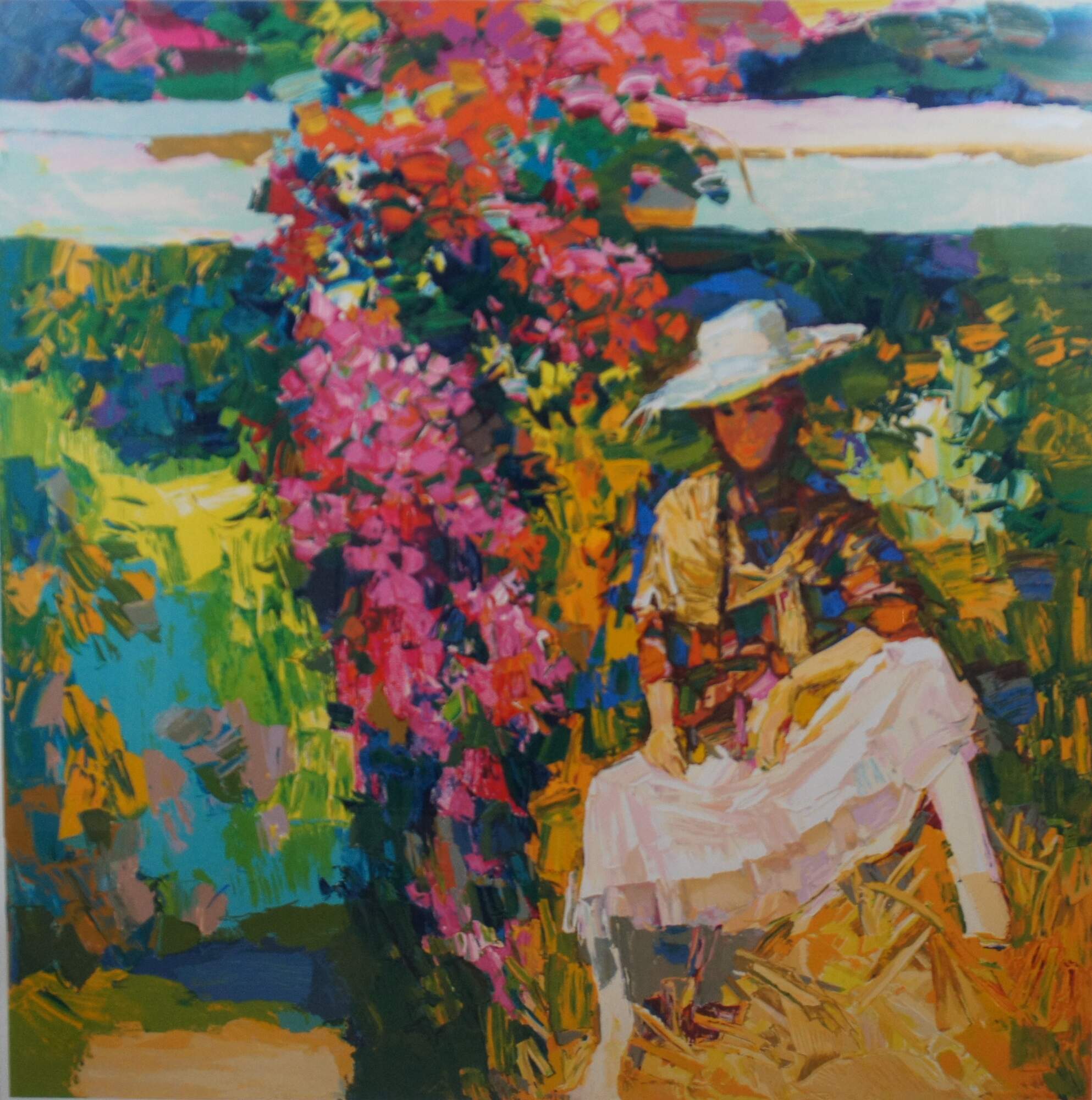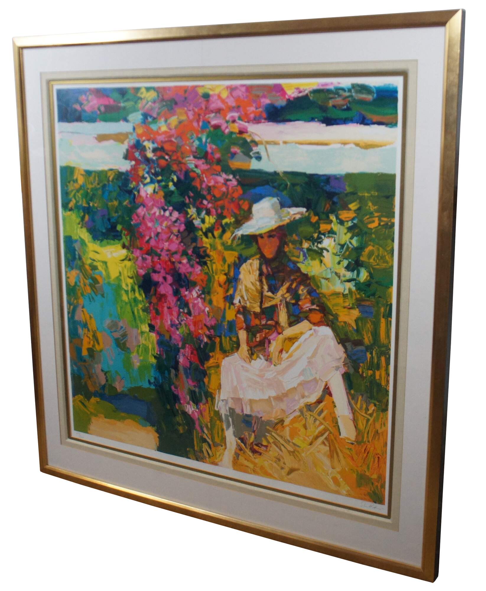 Vintage 1970s limited edition serigraph print by Nicola Simbari titled “Woman with Flowers,” showing the figure of a woman in a white skirt and hat, seated in a flowering garden; pencil signed and numbered 219/300. “Nicola Simbari is a painter of semi-abstract impressionist works. He is a colorist who favors brilliant tones, richly layered with a palette knife. Simbari paints to convey light and energy and provide new definition through intensity of vision and technique.