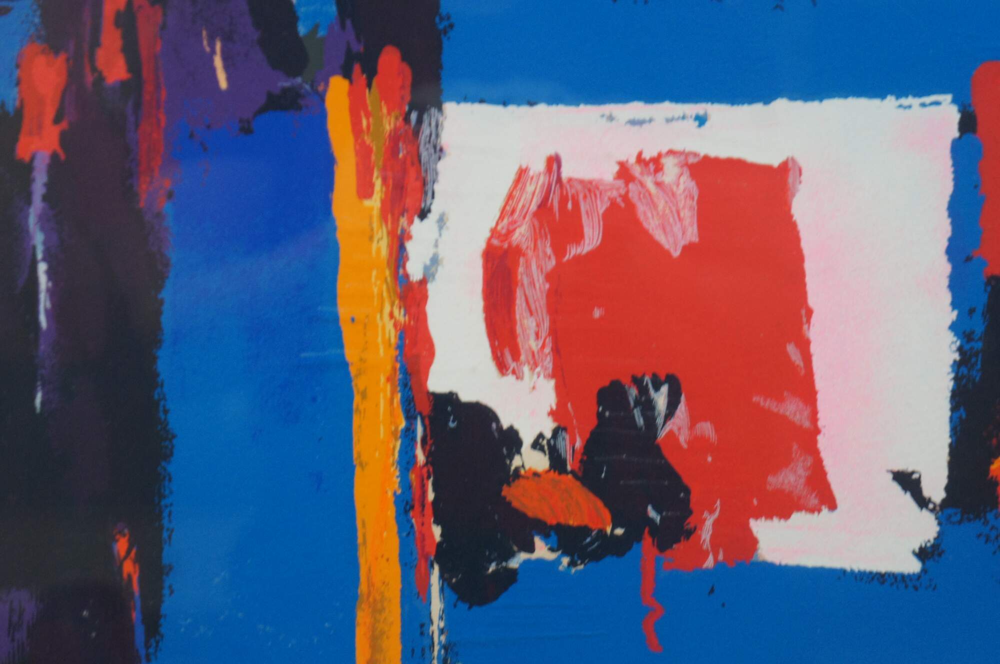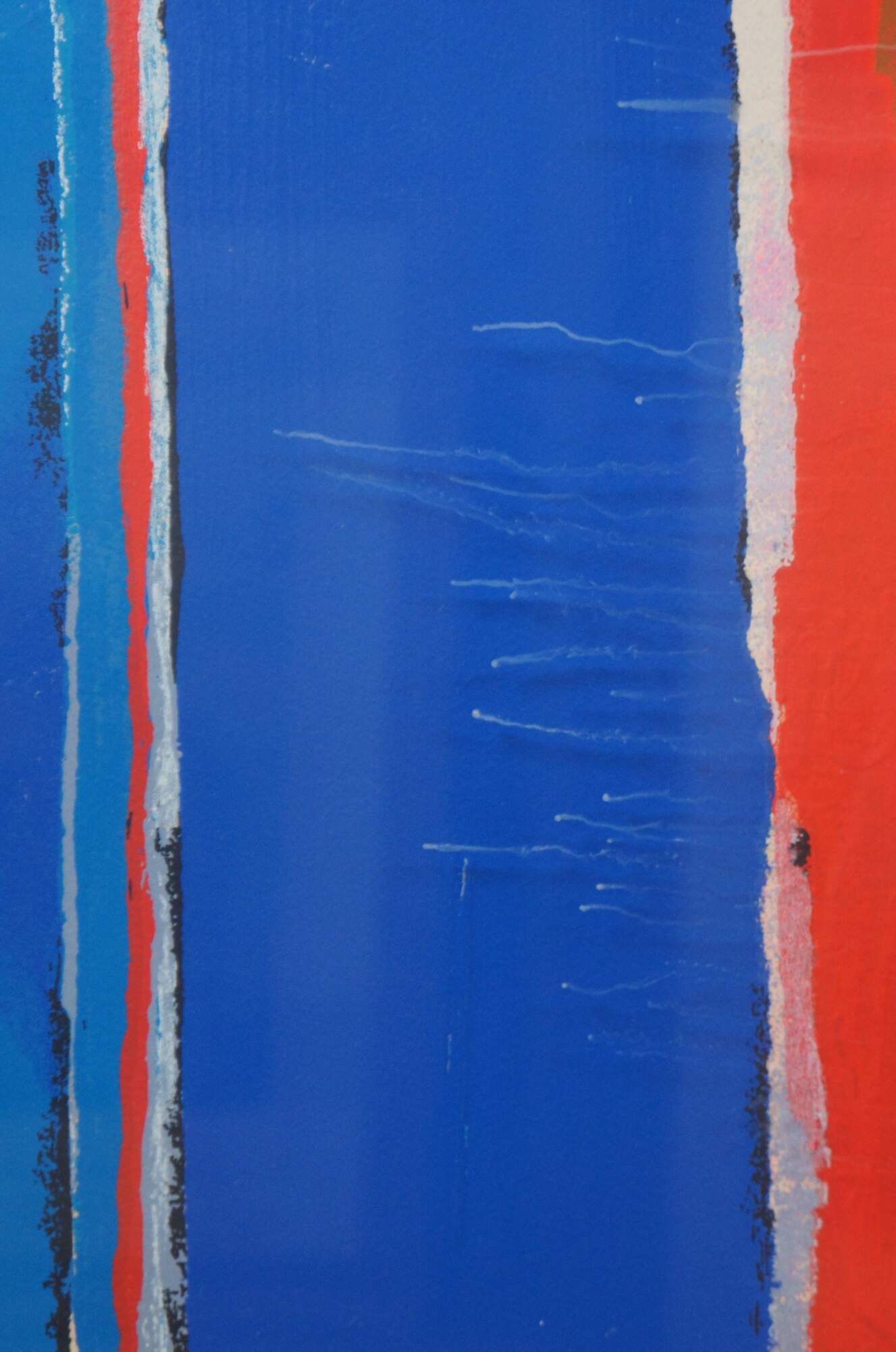 Vintage 1976 limited edition serigraph print by Nicola Simbari titled “Nanette,” showing a blonde woman posed in front of a red, white and blue backdrop; pencil signed and numbered 243/300. “Nicola Simbari is a painter of semi-abstract impressionist works. He is a colorist who favors brilliant tones, richly layered with a palette knife. Simbari paints to convey light and energy and provide new definition through intensity of vision and technique.