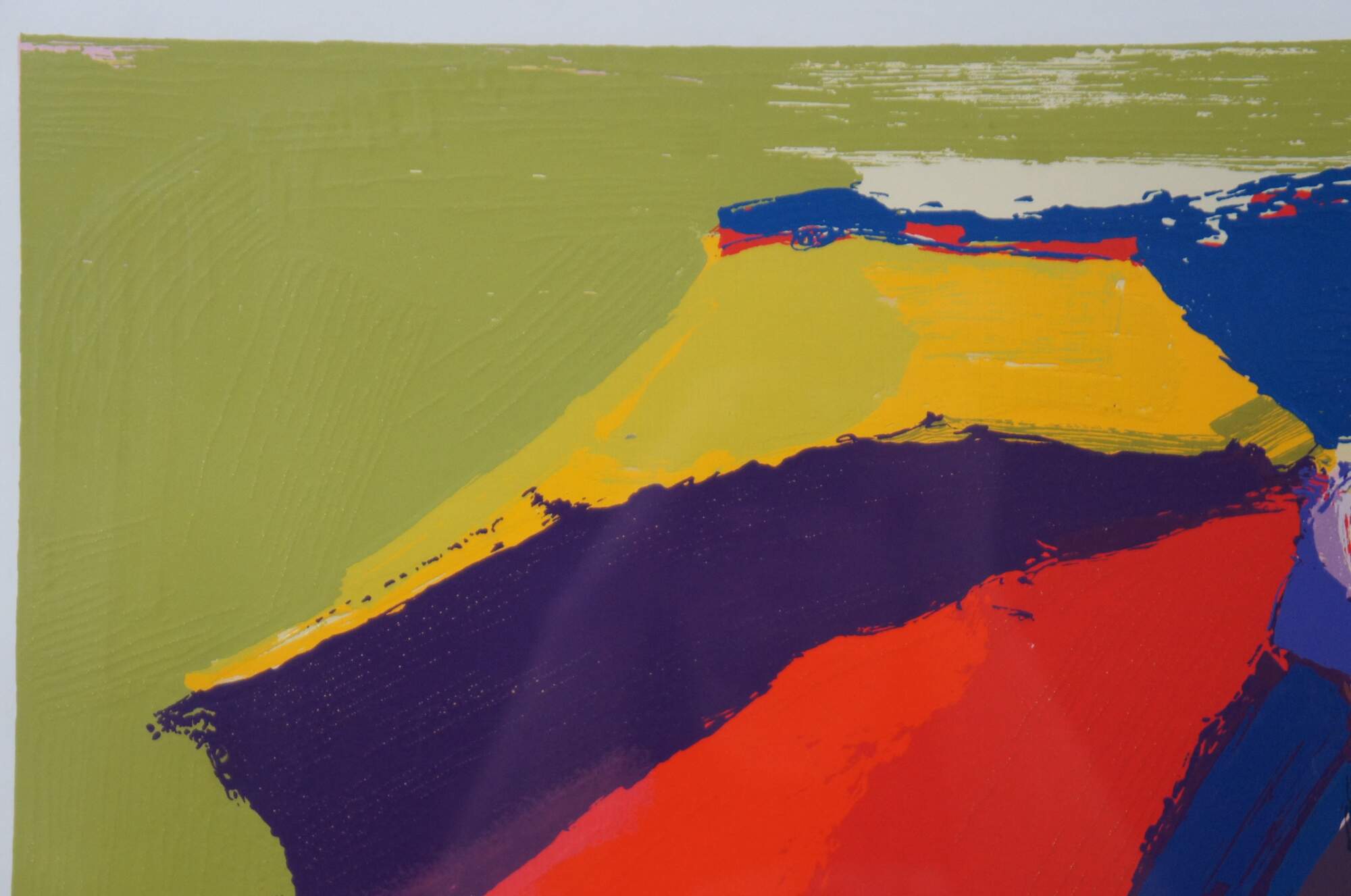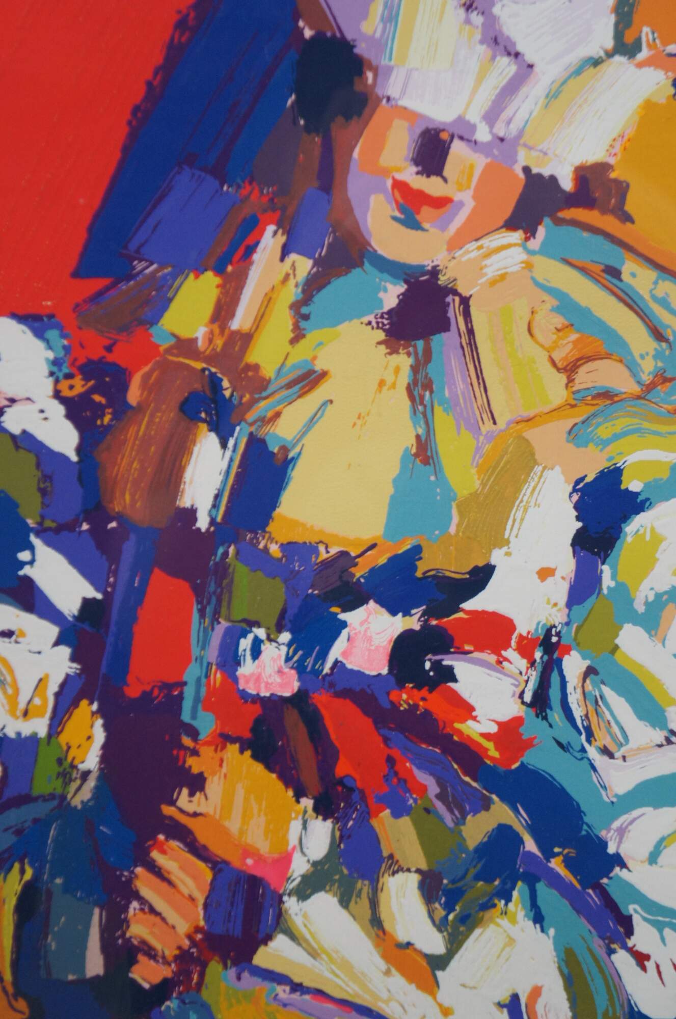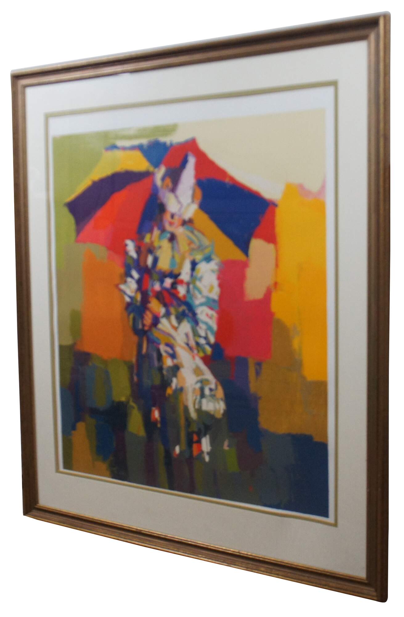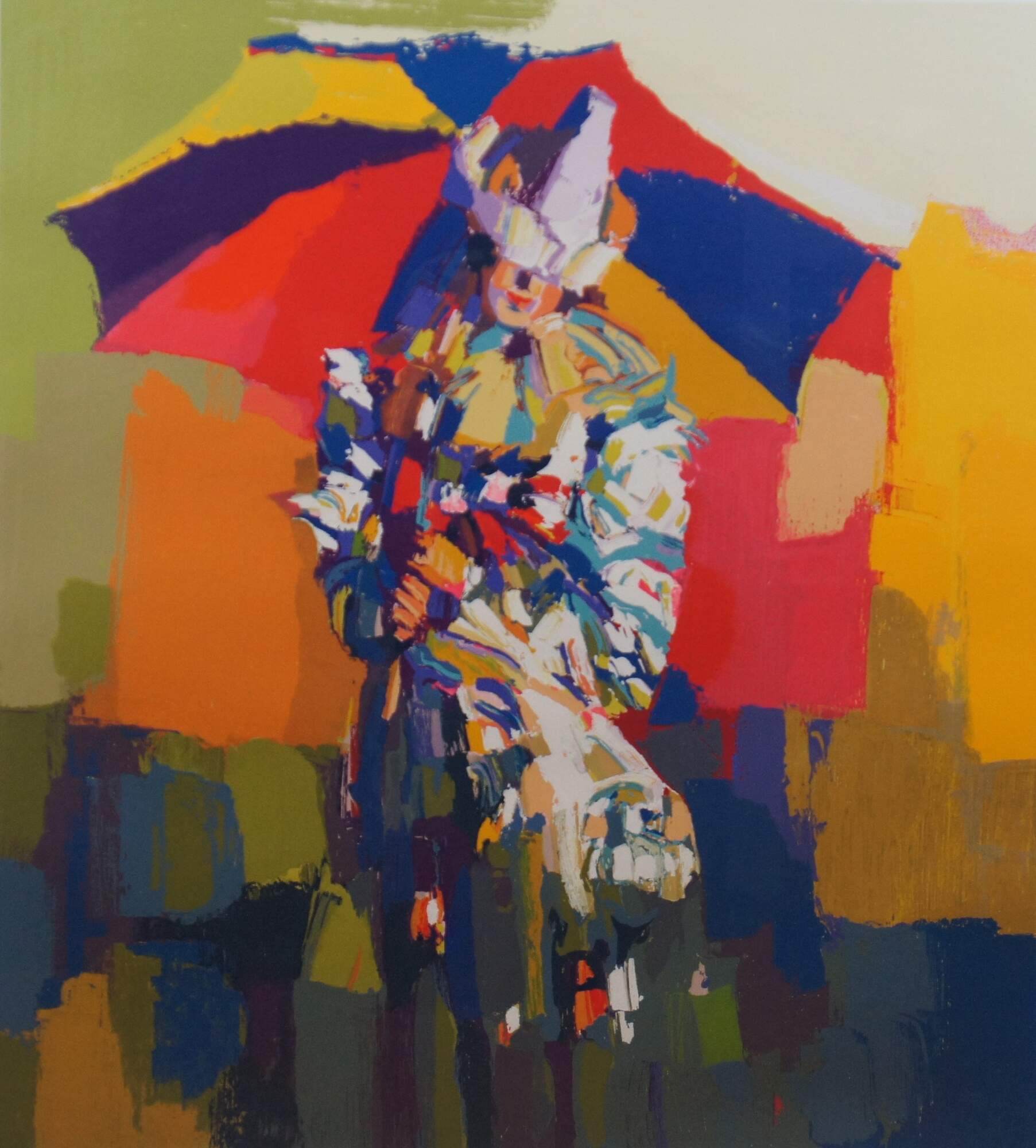 Vintage 1979 limited edition serigraph print by Nicola Simbari titled “Clown a l’ombelle,” showing a Commedia del Arte style clown holding a brightly colored umbrella; pencil signed and numbered but obscured by mat. “Nicola Simbari is a painter of semi-abstract impressionist works. He is a colorist who favors brilliant tones, richly layered with a palette knife. Simbari paints to convey light and energy and provide new definition through intensity of vision and technique.