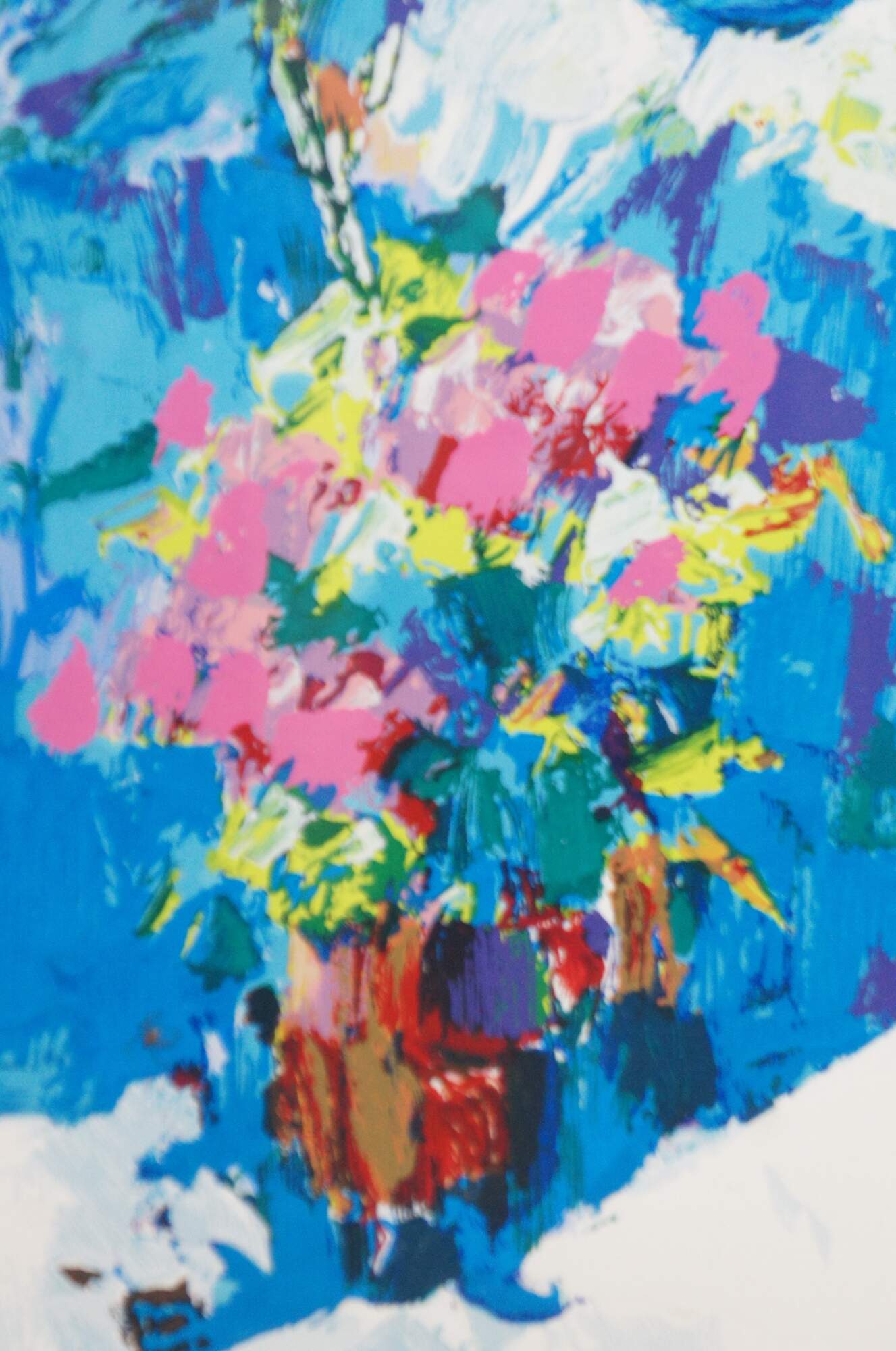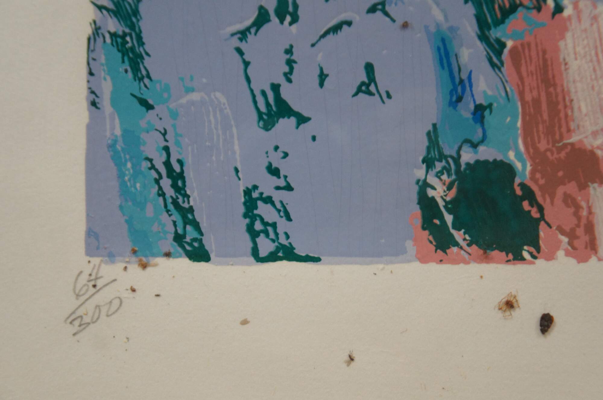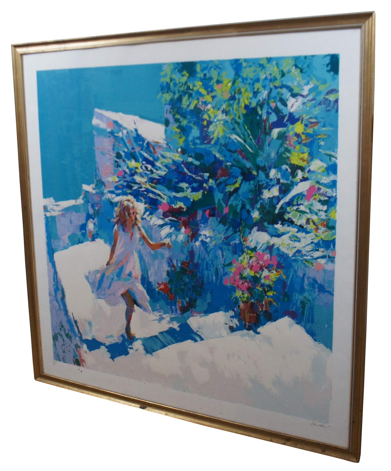 Vintage 1977-1978 limited edition serigraph print by Nicola Simbari titled “Taormina,” showing a young woman or girl in white dress ascending a stairs lined with flowers; pencil signed and numbered 64/300. “Nicola Simbari is a painter of semi-abstract impressionist works. He is a colorist who favors brilliant tones, richly layered with a palette knife. Simbari paints to convey light and energy and provide new definition through intensity of vision and technique.