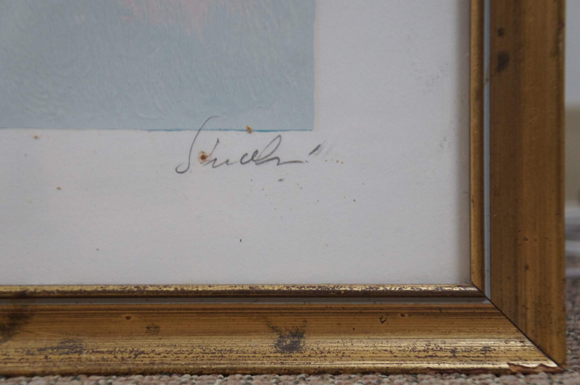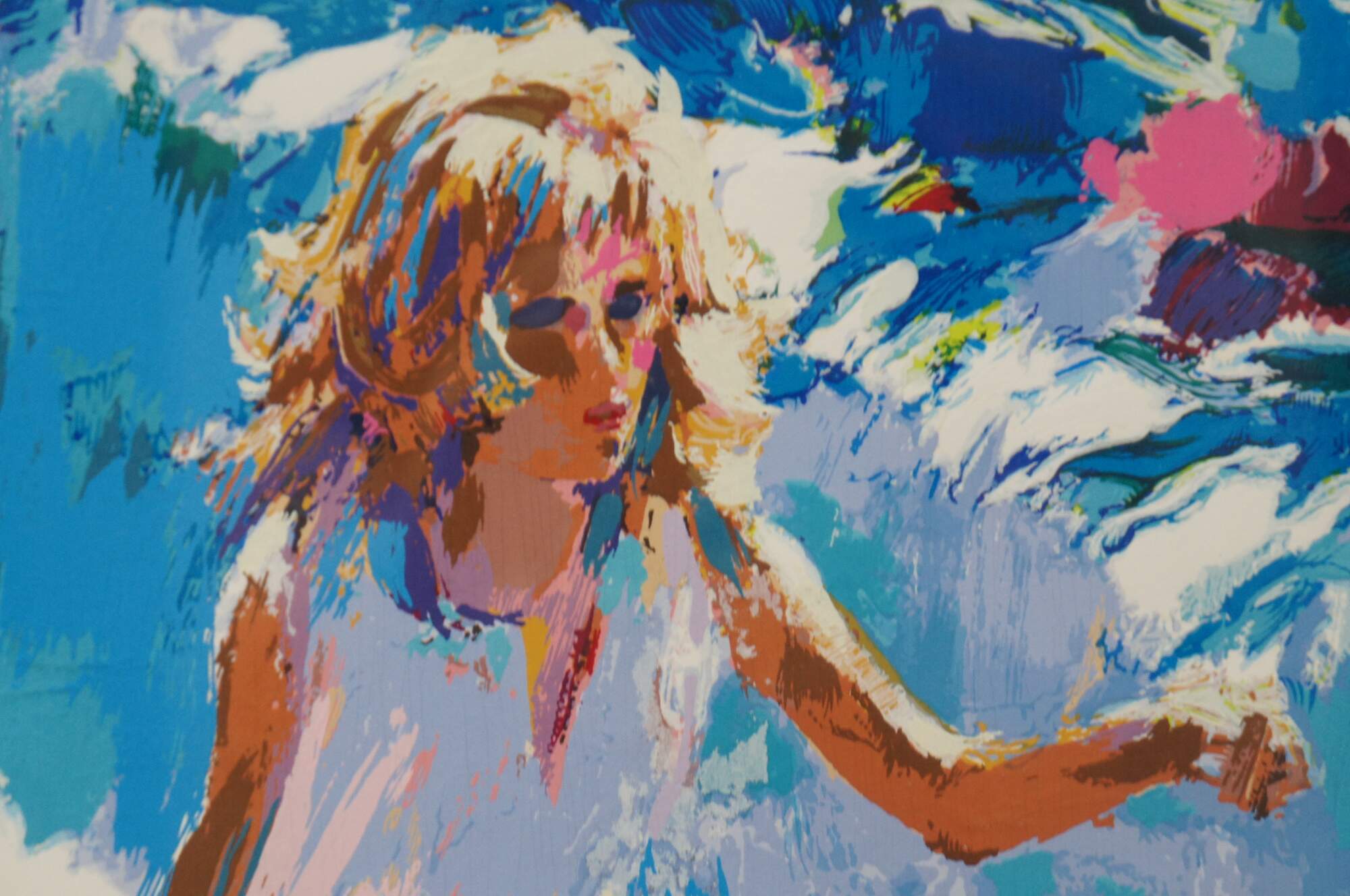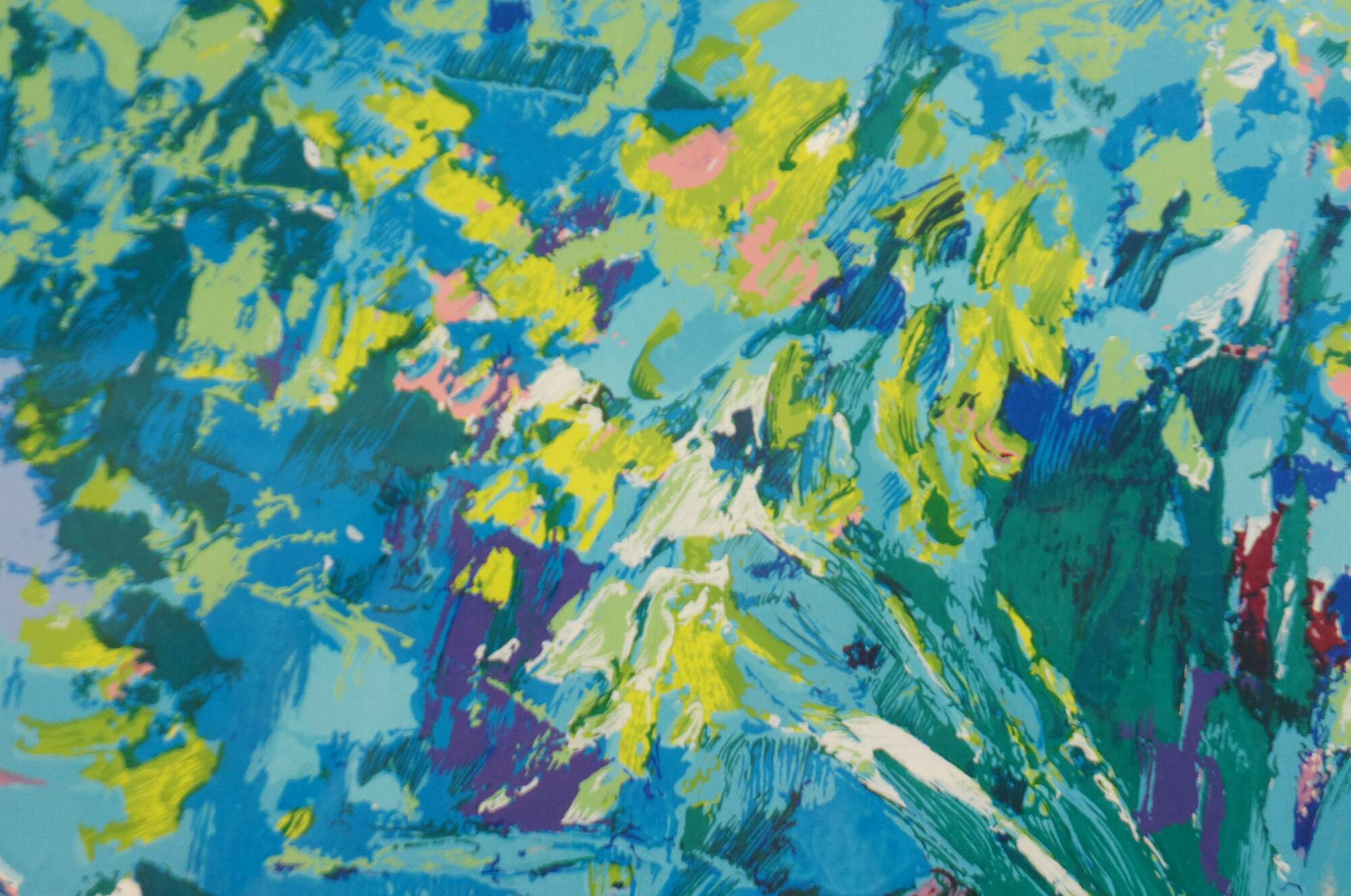Vintage 1977-1978 limited edition serigraph print by Nicola Simbari titled “Taormina,” showing a young woman or girl in white dress ascending a stairs lined with flowers; pencil signed and numbered 64/300. “Nicola Simbari is a painter of semi-abstract impressionist works. He is a colorist who favors brilliant tones, richly layered with a palette knife. Simbari paints to convey light and energy and provide new definition through intensity of vision and technique.