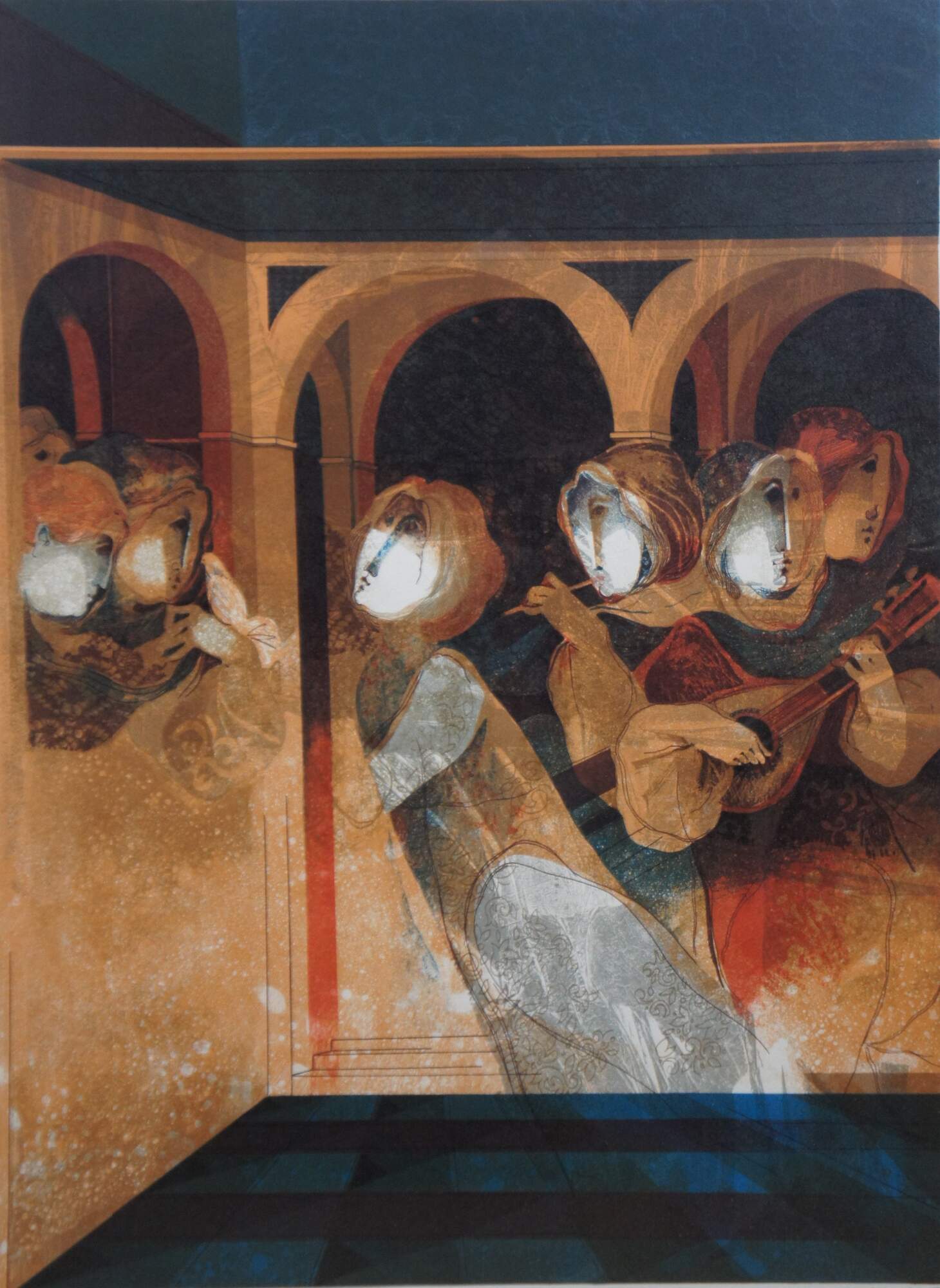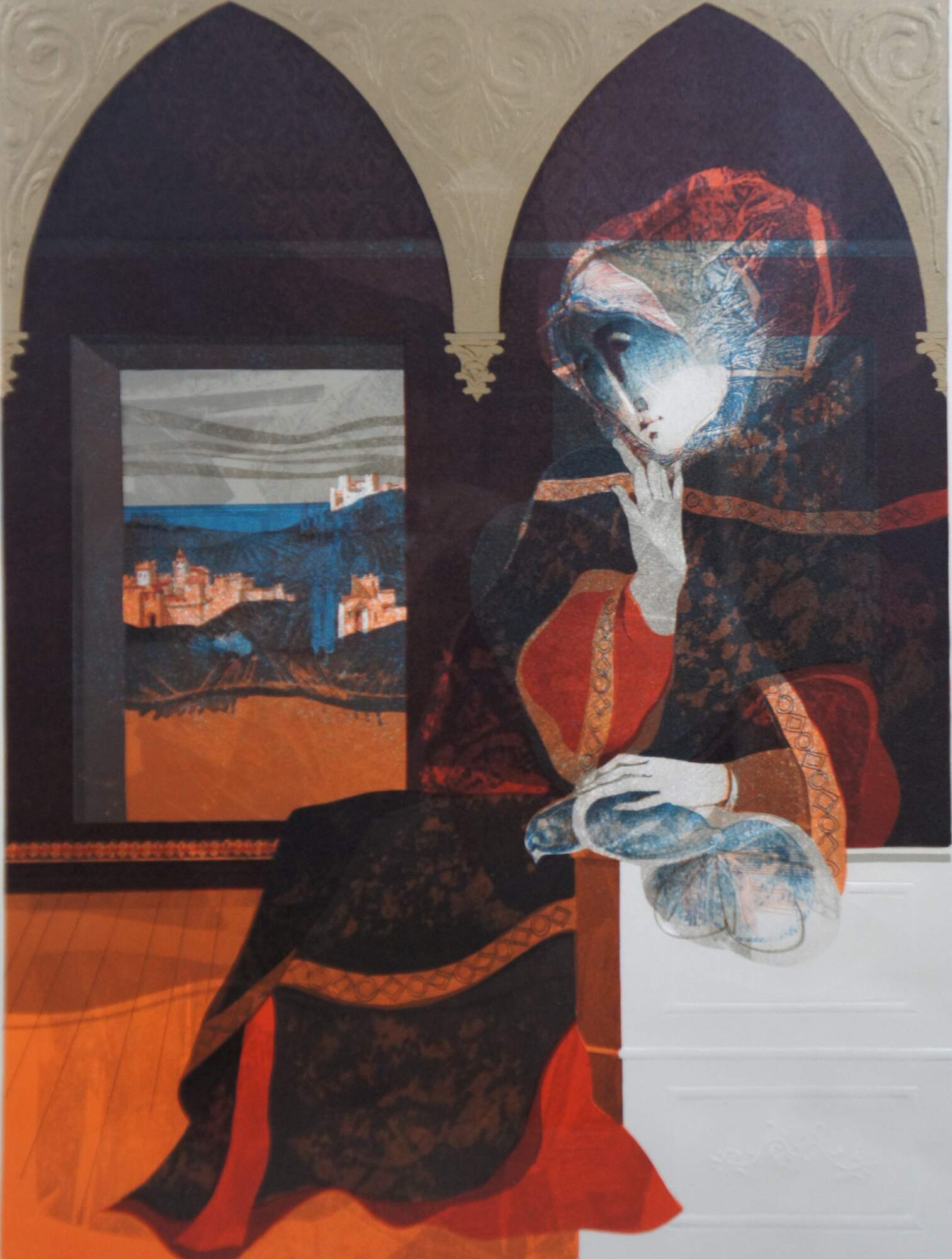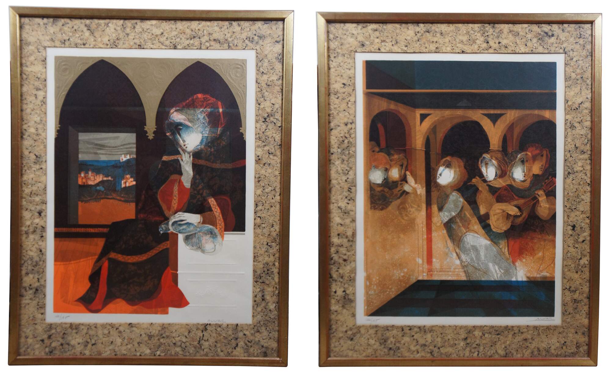 Suite titled “Renaixant” (Renaissance) of four framed, original and embossed lithograph prints on Arches by Alvar Sunol Munoz-Ramos, pencil signed and numbered 122/185. circa 1977. Featuring surrealist scenes with gothic architecture and ghosts / angels / muses / musicians and doves.