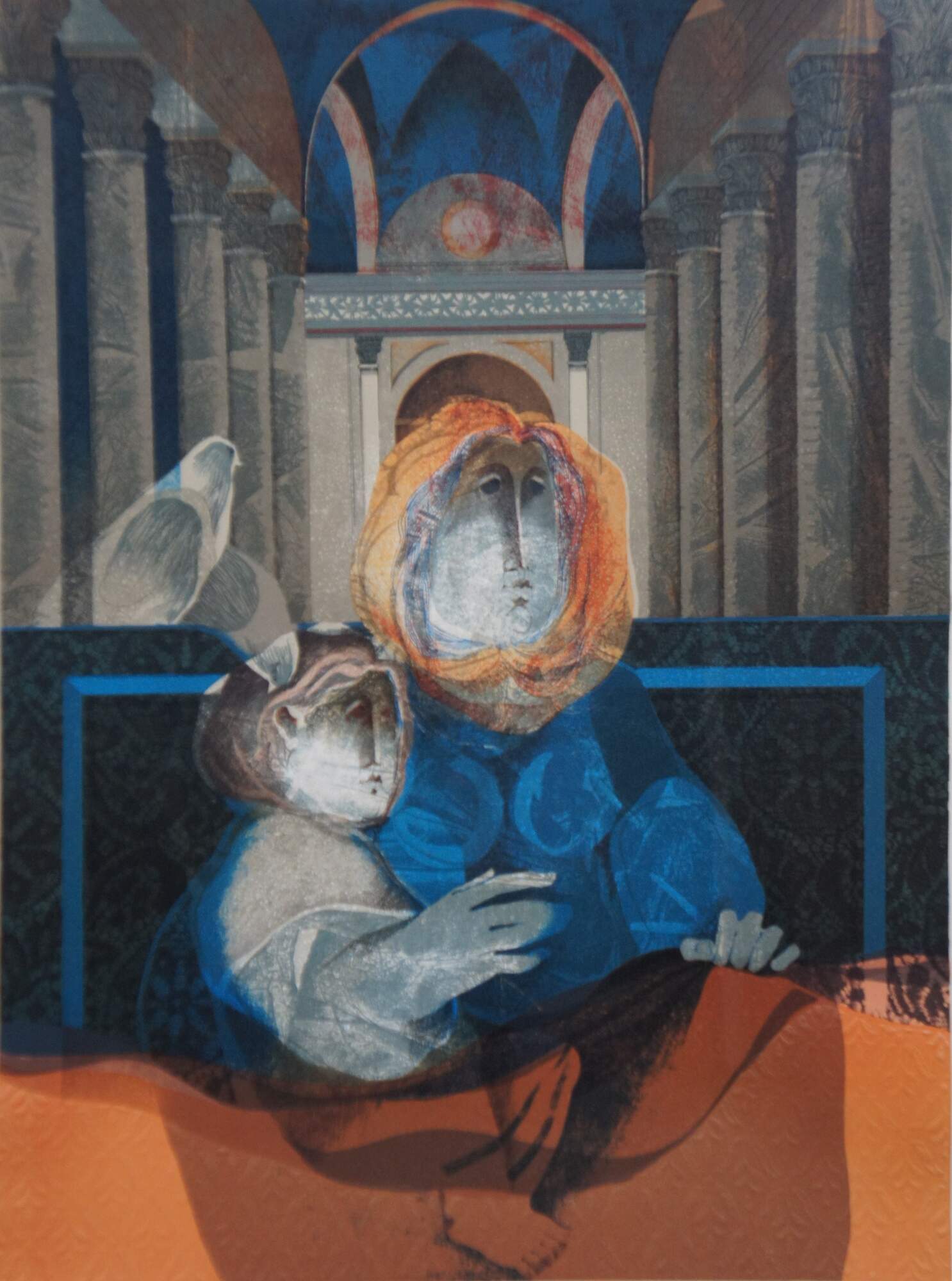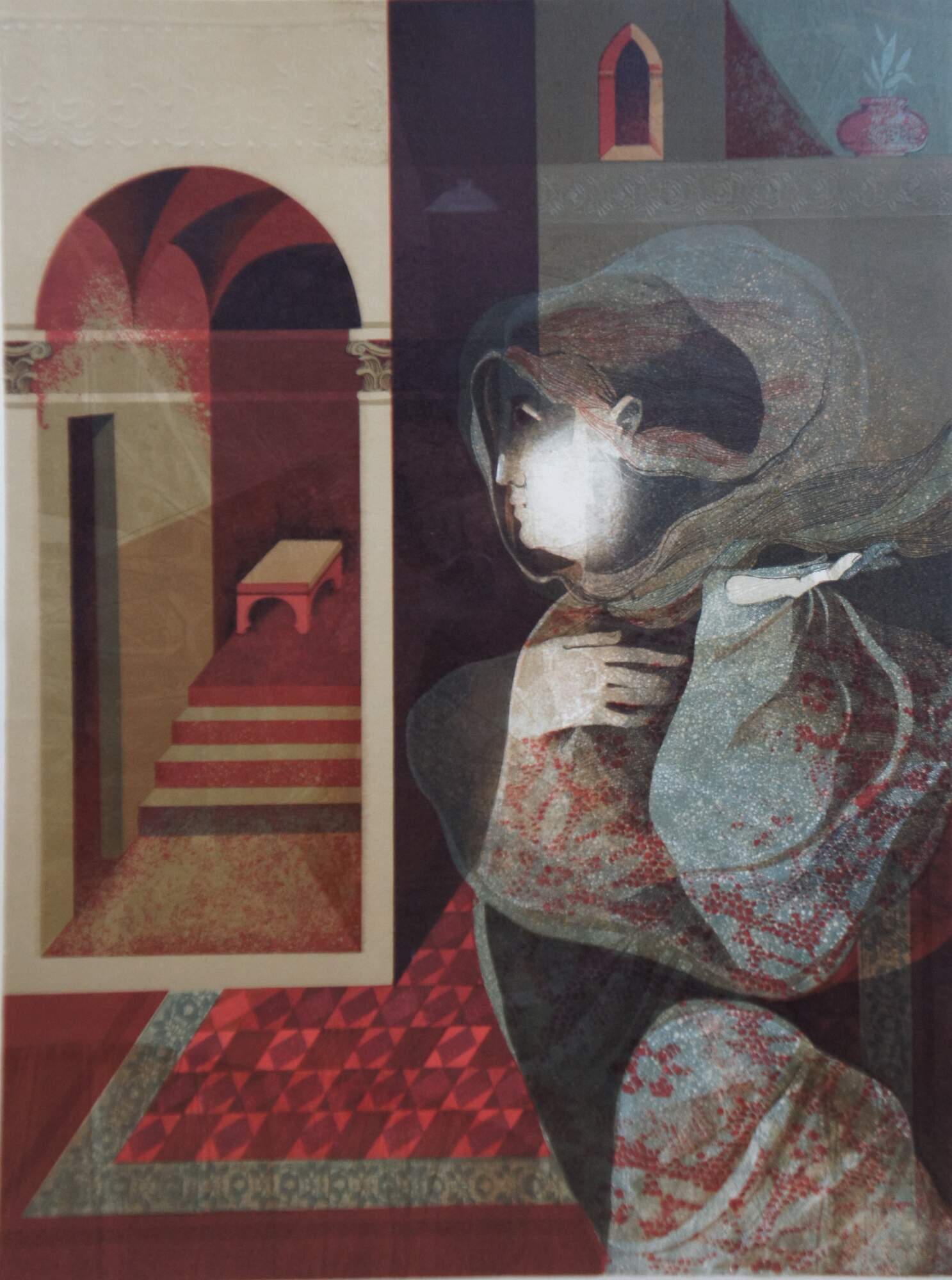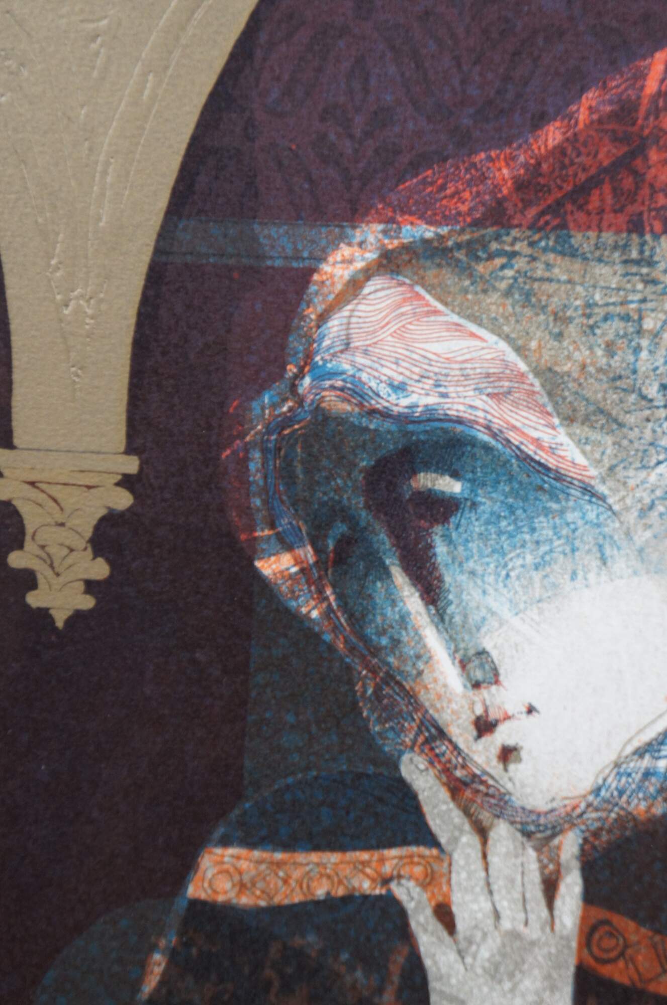 Suite titled “Renaixant” (Renaissance) of four framed, original and embossed lithograph prints on Arches by Alvar Sunol Munoz-Ramos, pencil signed and numbered 122/185. circa 1977. Featuring surrealist scenes with gothic architecture and ghosts / angels / muses / musicians and doves.