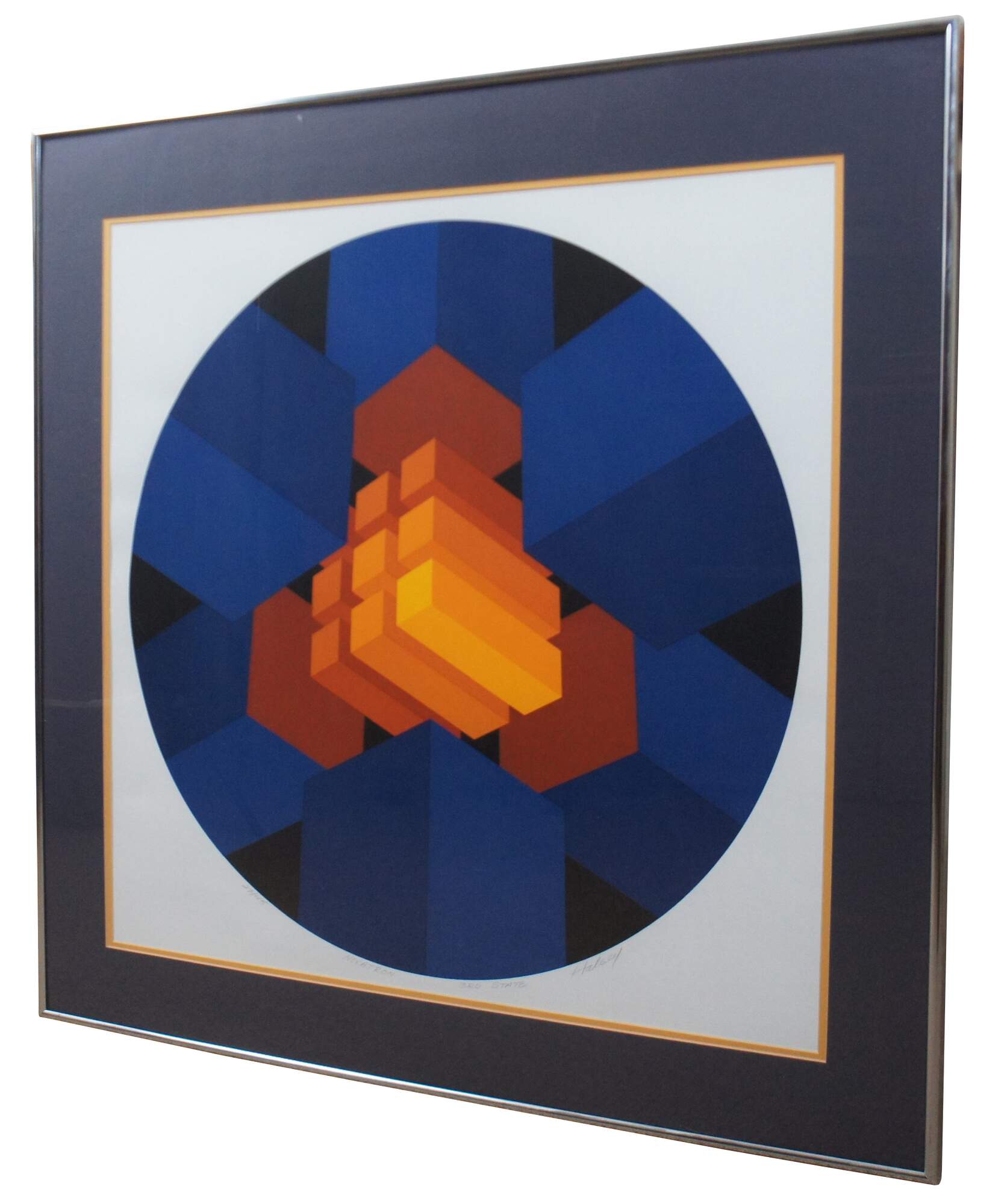 Vintage 1979 original orange and blue circular geometric supergraphic op art serigraph print by Brian Halsey titled “Novatron 3rd State” from the Mandalas suite of works, pencil signed by the artist.