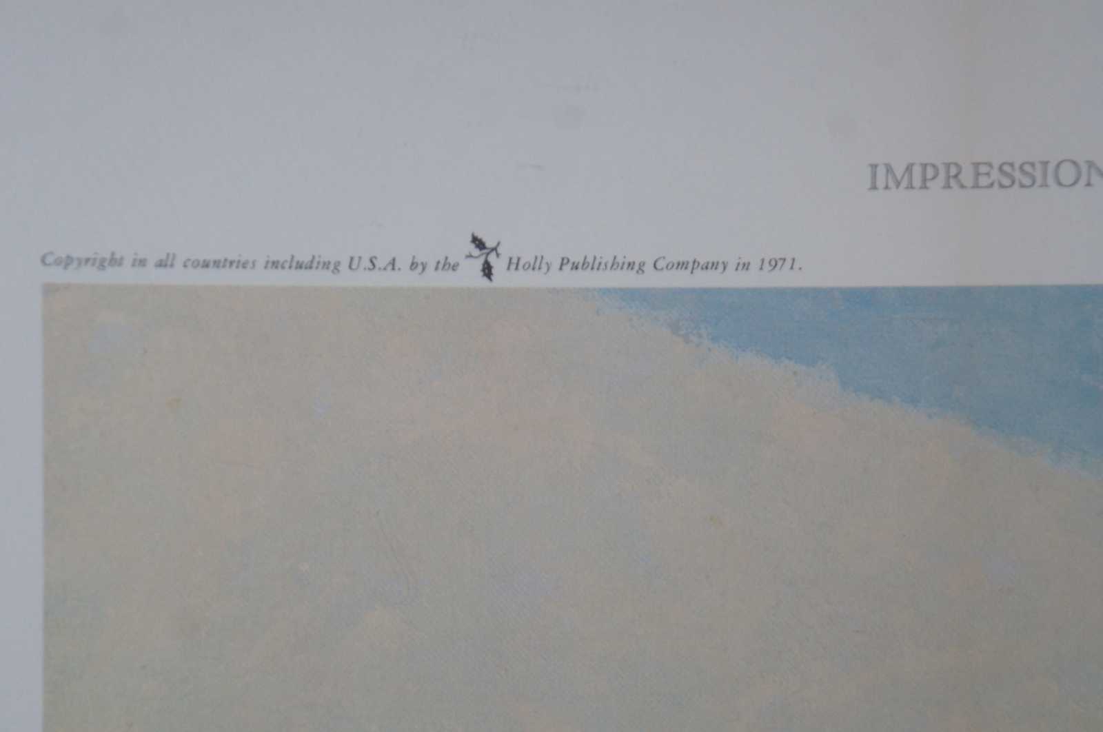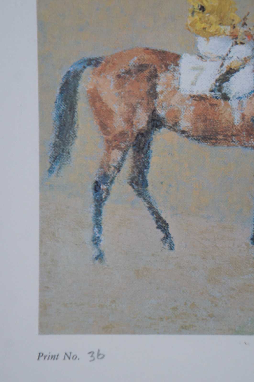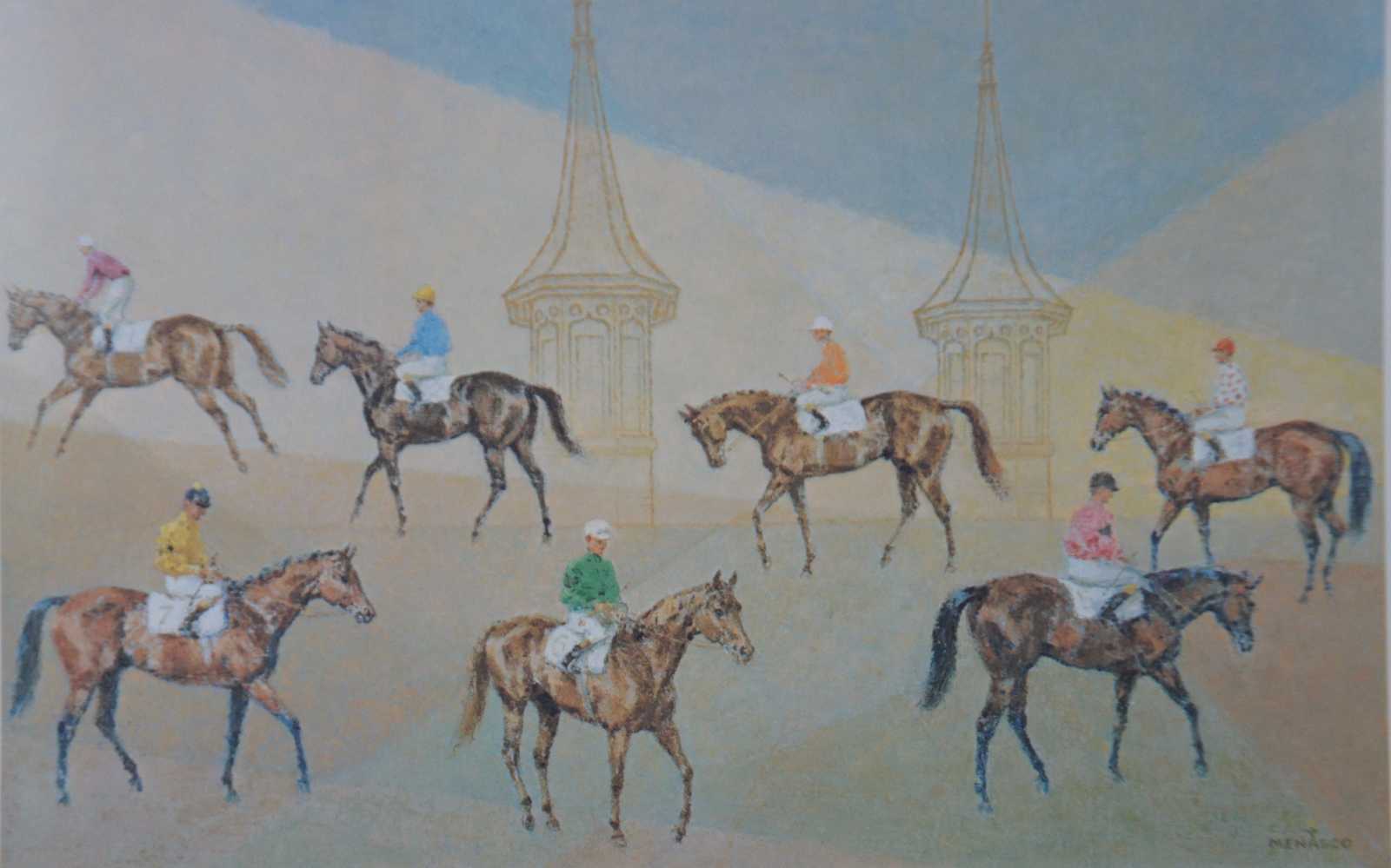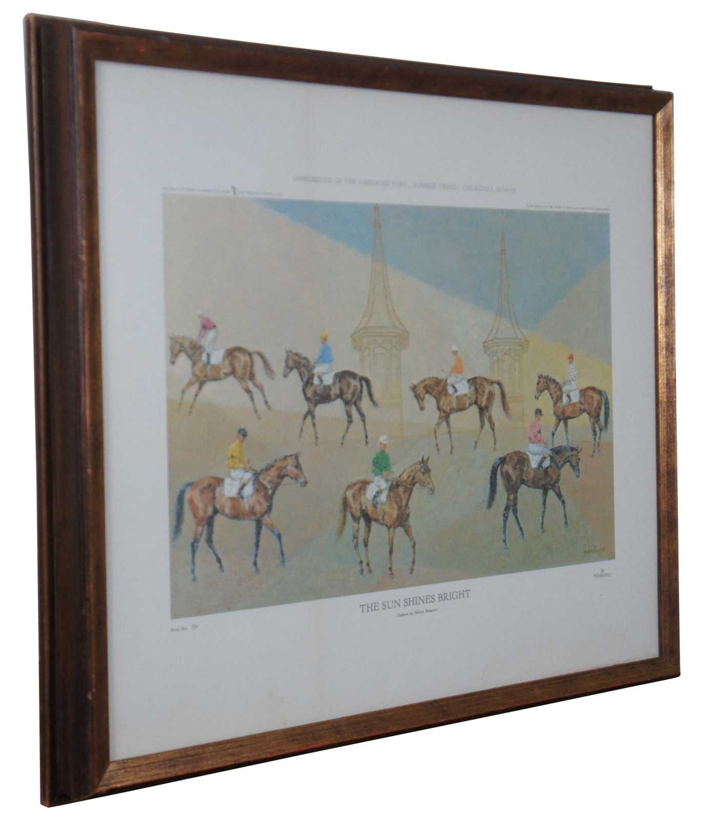 Vintage 1971 pencil signed lithograph print supertitled “Impressions of the American Turf...Number Three...Churchill Downs” featuring the horse race painting “The Sun Shines Bright” by Milton Menasco. Copyright by the Holly Publishing Company, Print No. 36, pencil signed by the artist. “Born in Los Angeles, California in 1890, Menasco became a painter of equestrian subject, after working in Los Angeles and having a successful career in New York City with an advertising agency.