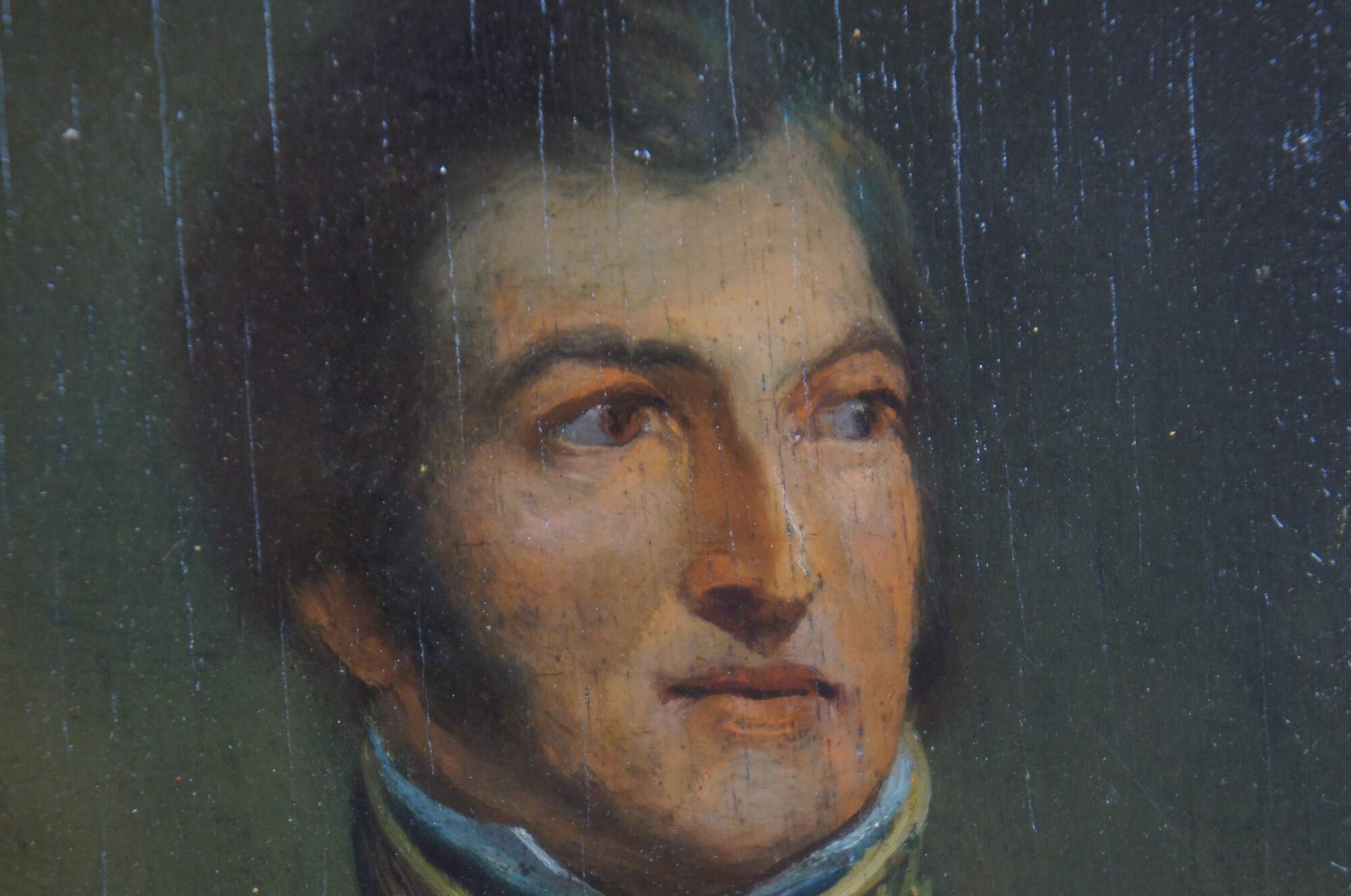 Antique portrait oil painting on board of a Napoleonic man / general / officer / nobleman / aristocrat with long sideburns in French military uniform with high collar and red sash. Possibly a young Jean-Baptiste Bernadotte or Auguste Frederic Louis Viesse de Marmont.