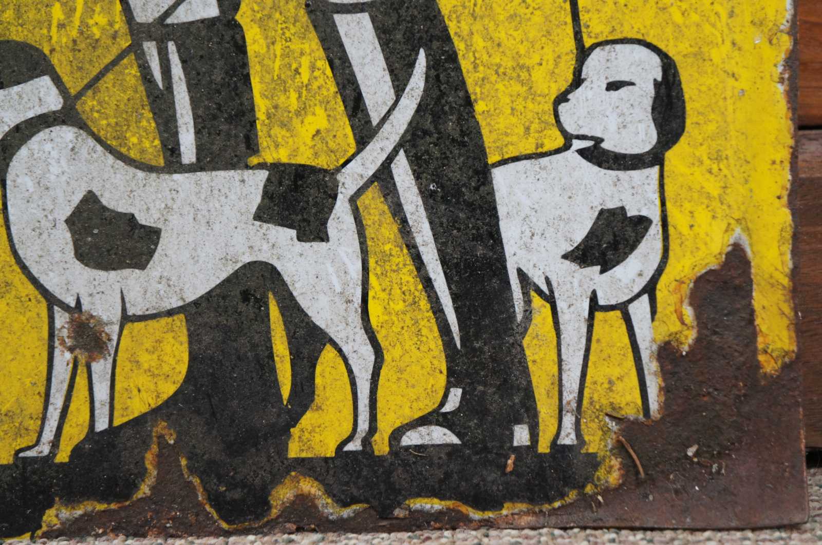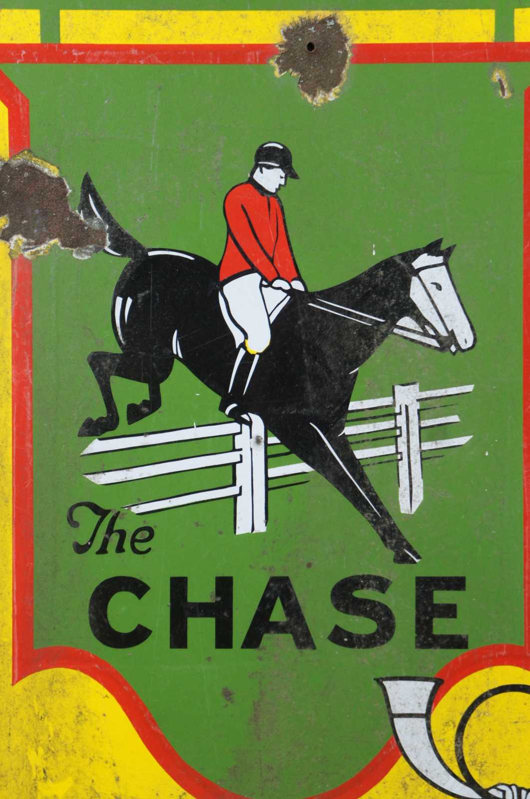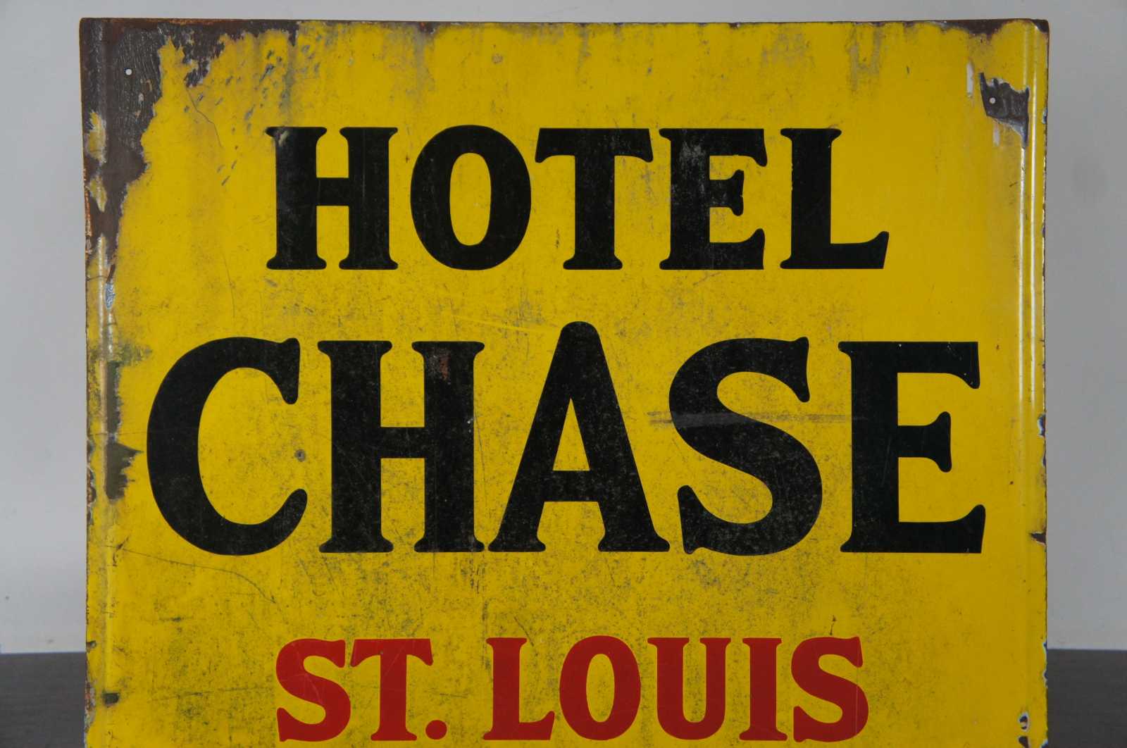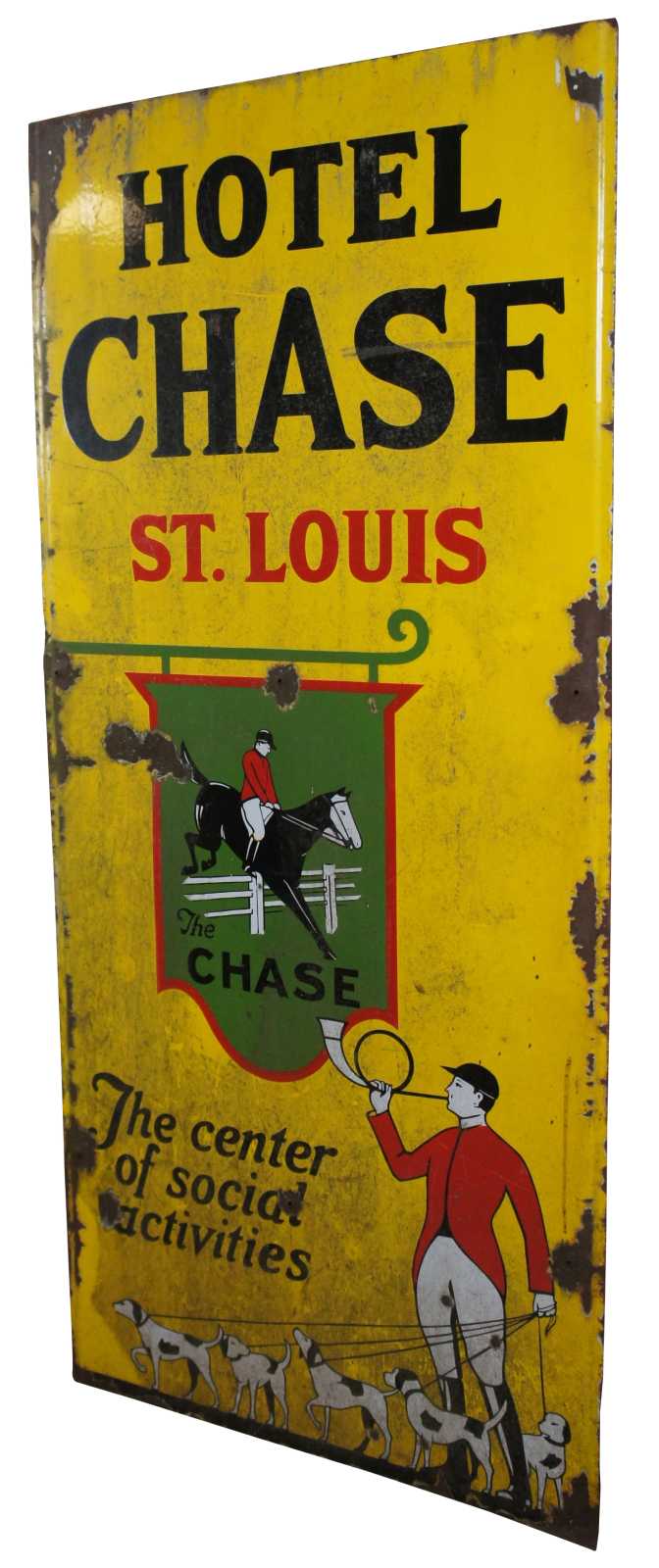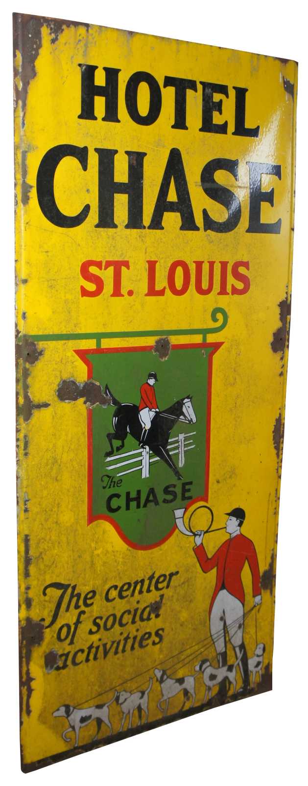 Art Deco era antique enameled metal sign advertising the Hotel Chase of St Louis, Missouri. Features a bold yellow backround with Fox Hunt and Riding Scene. Lettered in black and red. Attributed to what is now the Chase Park Plaza Royal Sonesta Hotel. Originally the Chase Hotel built in 1922 by Chase Ullman. The ground-floor Chase Club was a popular venue for nationally known entertainers.