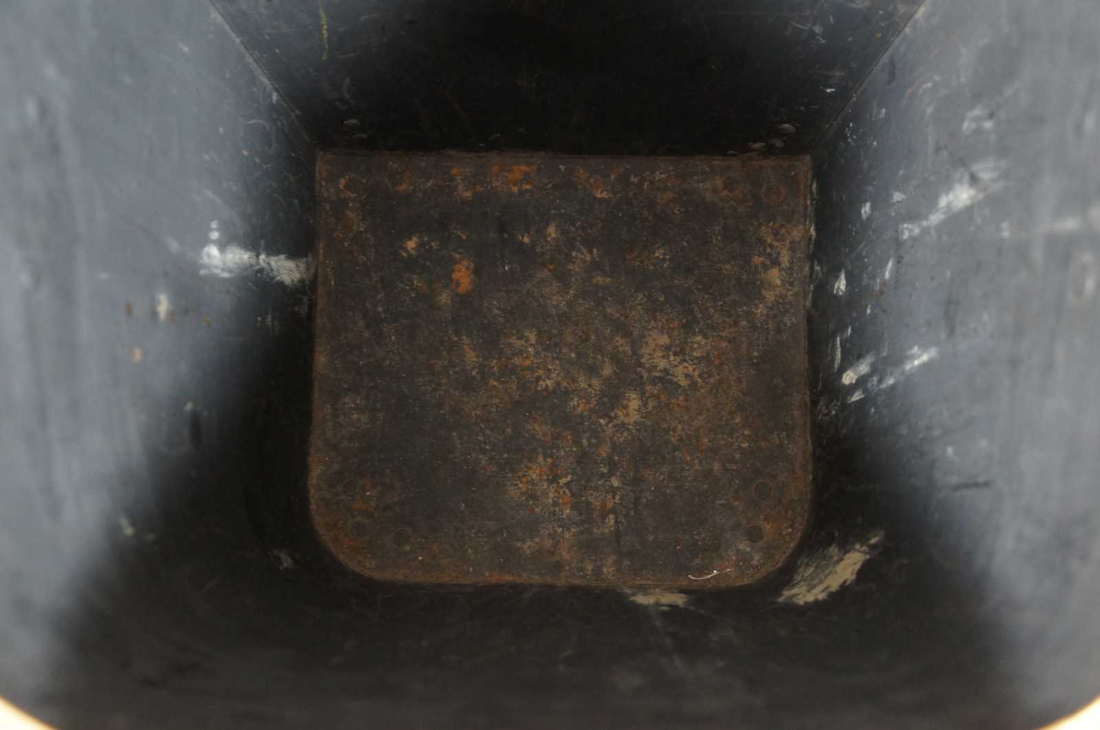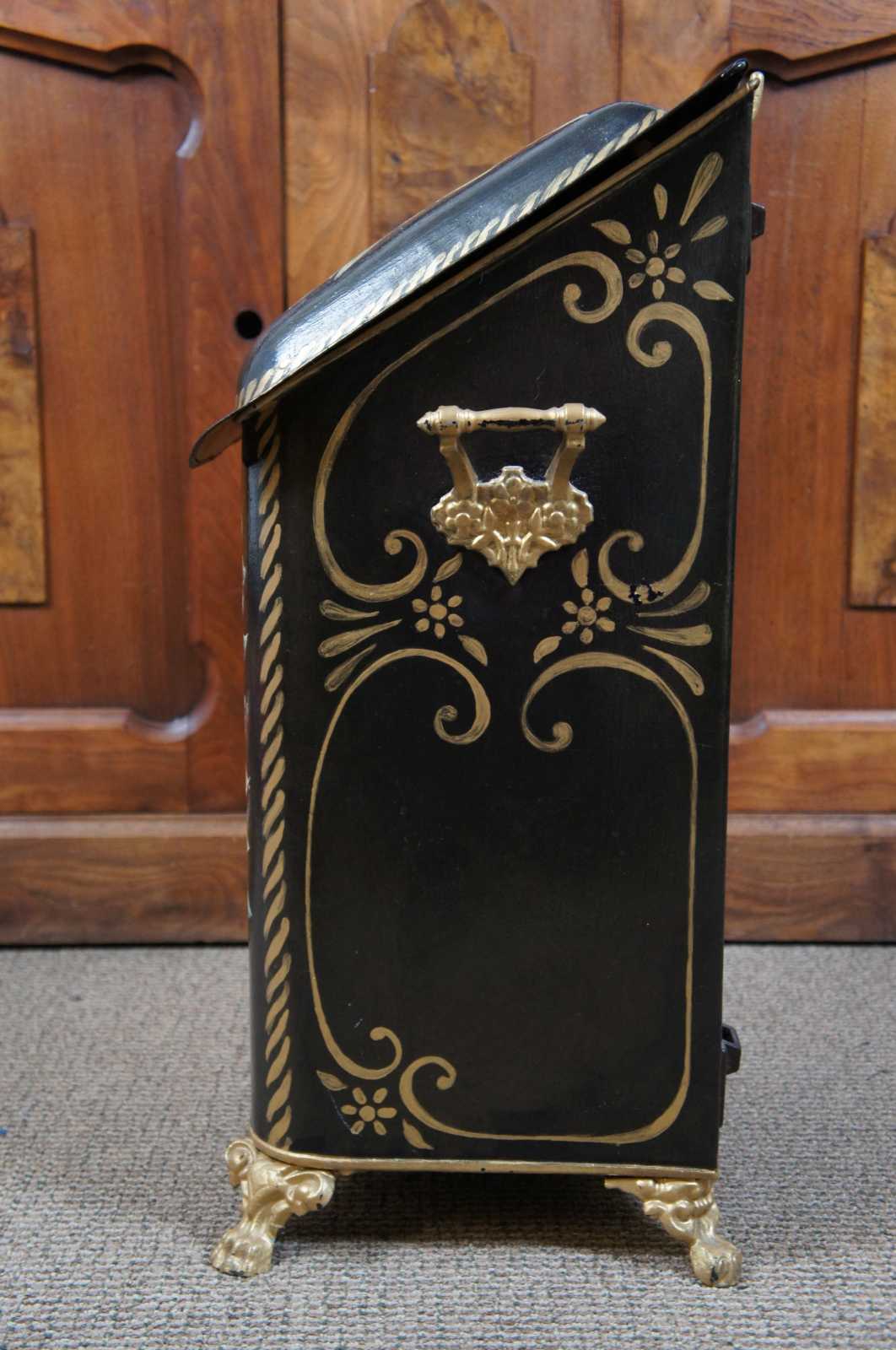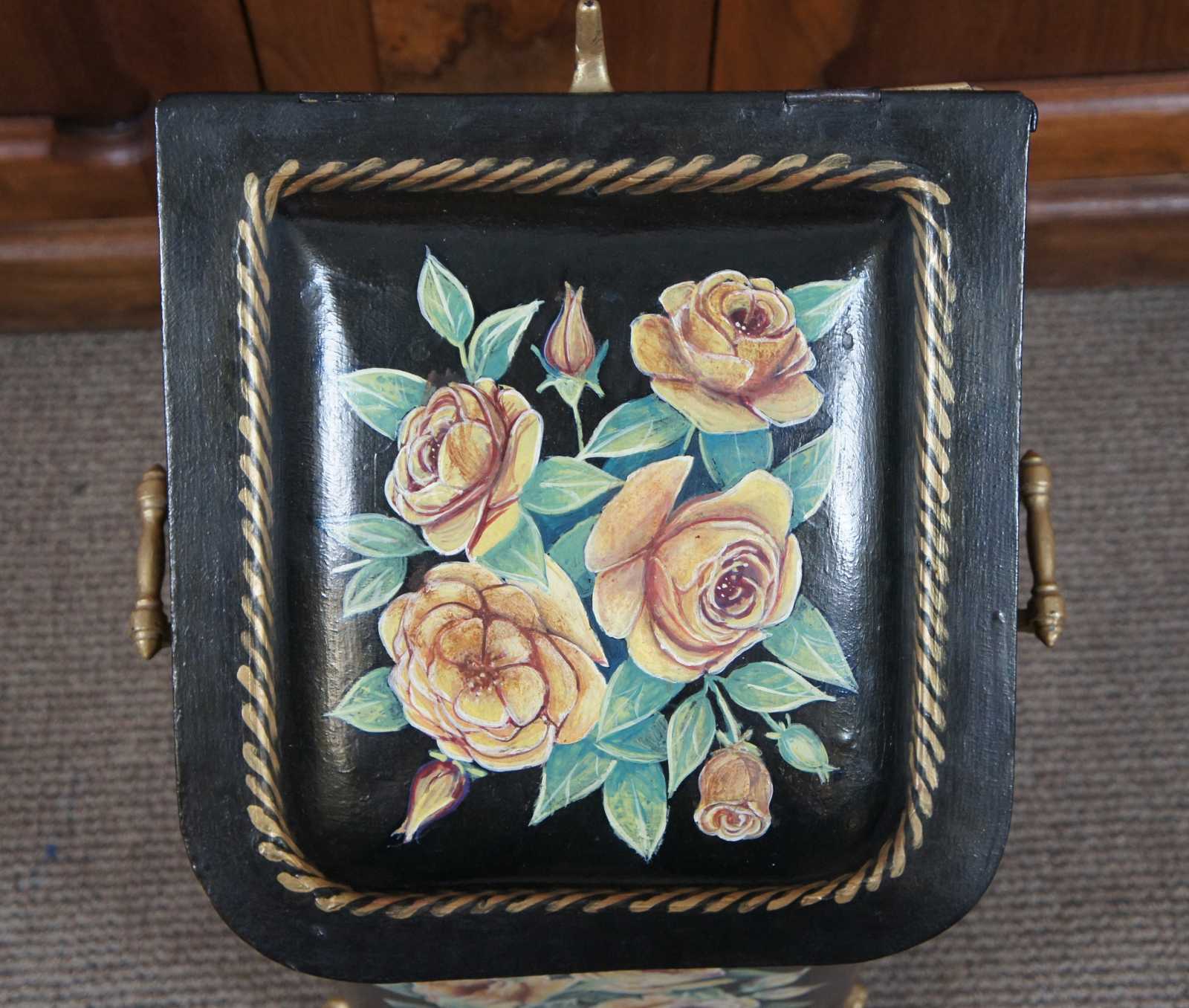 Antique Victorian toleware metal coal bin or heartherware hod with lid, painted floral motif in black with yellow and pink roses, accented with gilded feet, handles, and rear hook for a shovel.
