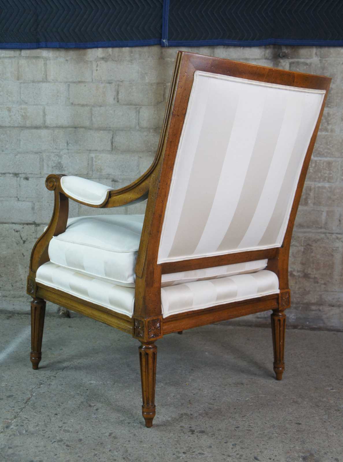 Vintage Baker Furniture Crown & Tulip collection Fauteuil armchair. Made of walnut featuring Louis XVI form with carved floral and acanthus accents with tapered fluted legs and striped down filled silk fabric.