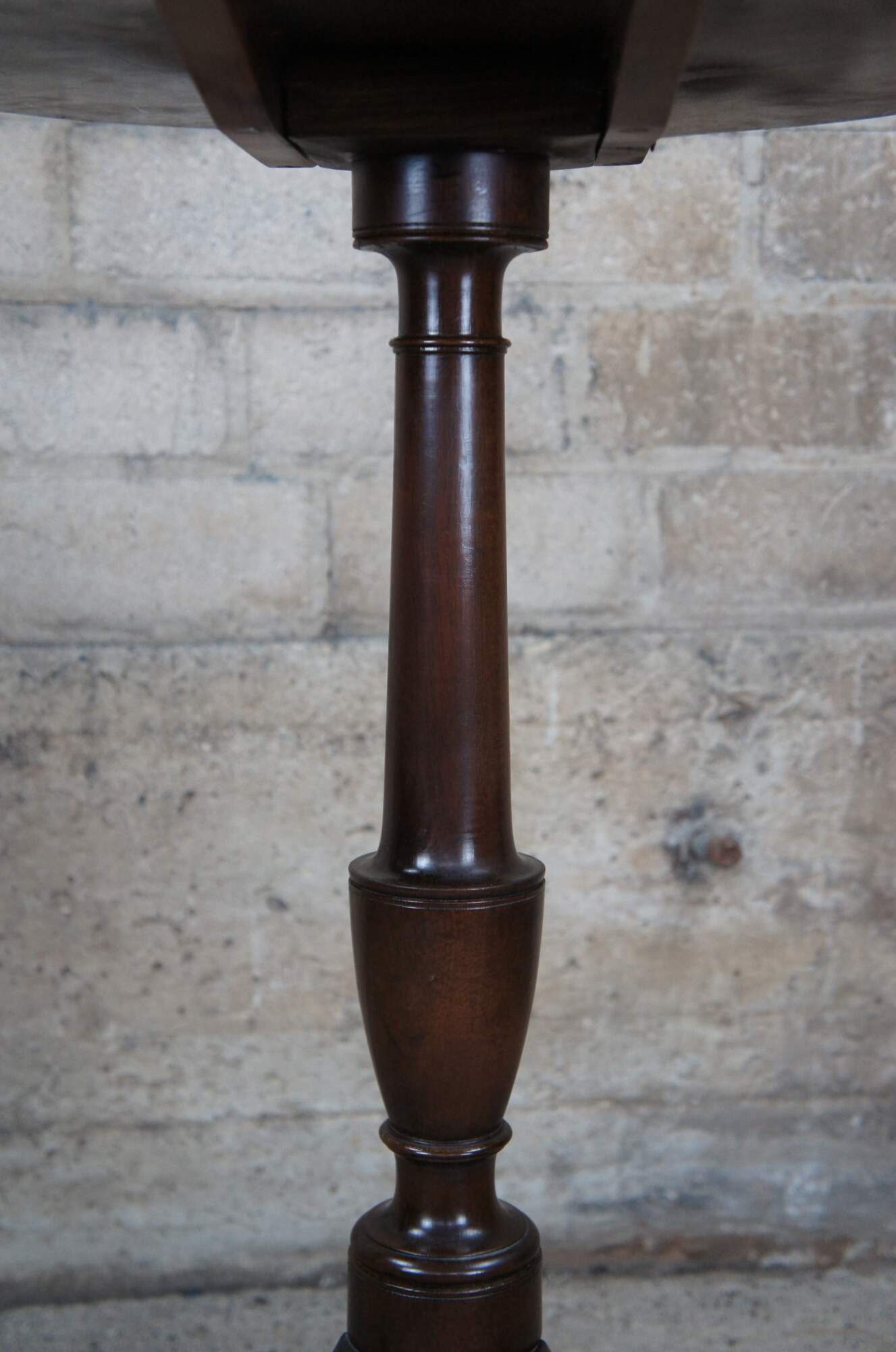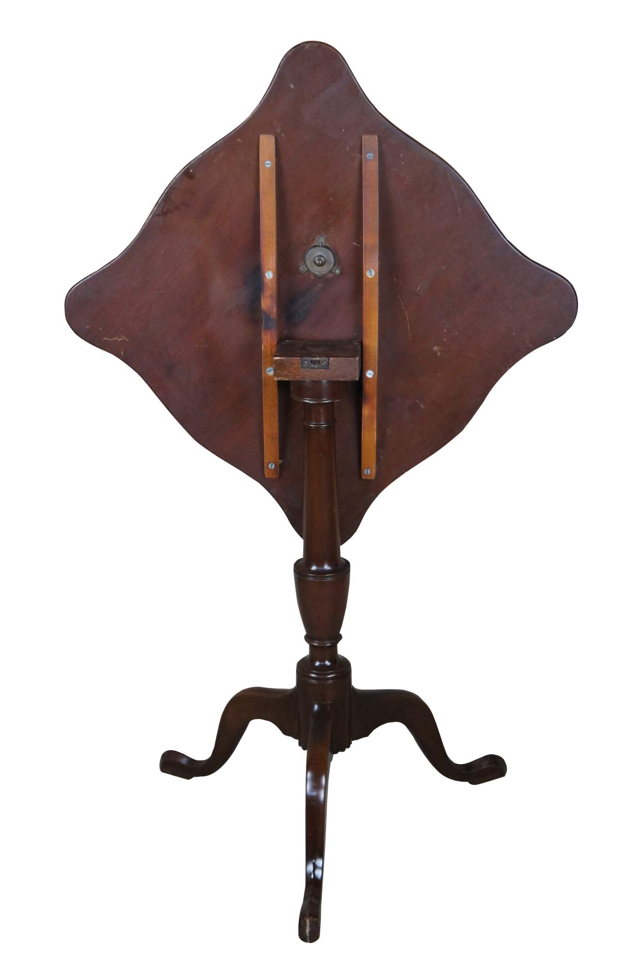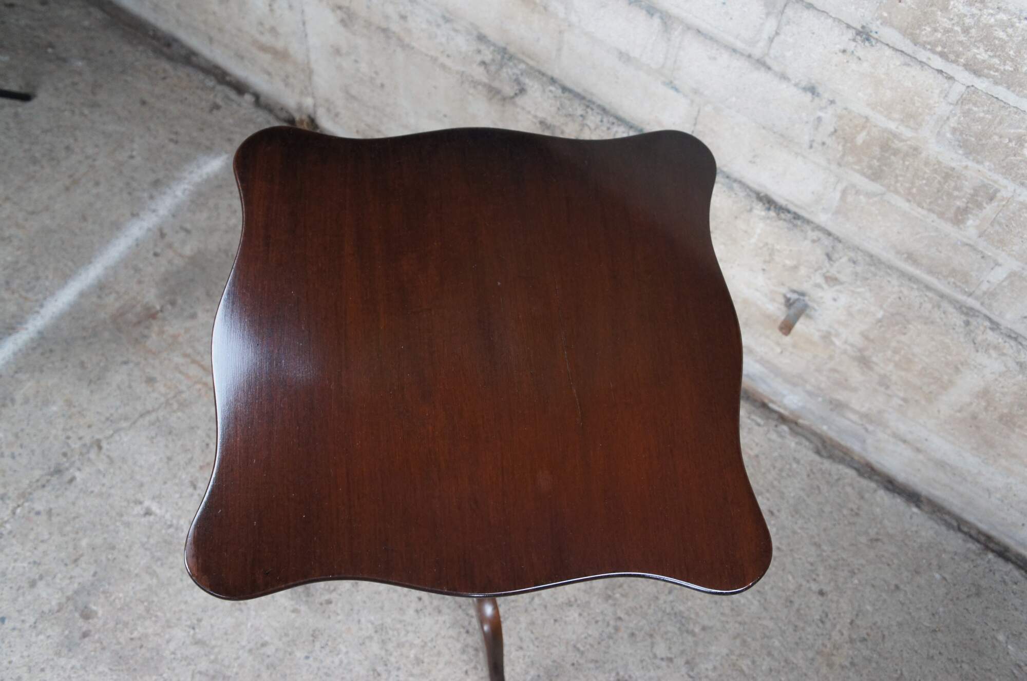 A Federal style mahogany candlestand by Kittinger, circa 1970s. Williamburg Restoration Line. Features a rectangular top with serpentine edge over a baluster turned base with cabriole legs leading to pad feet.