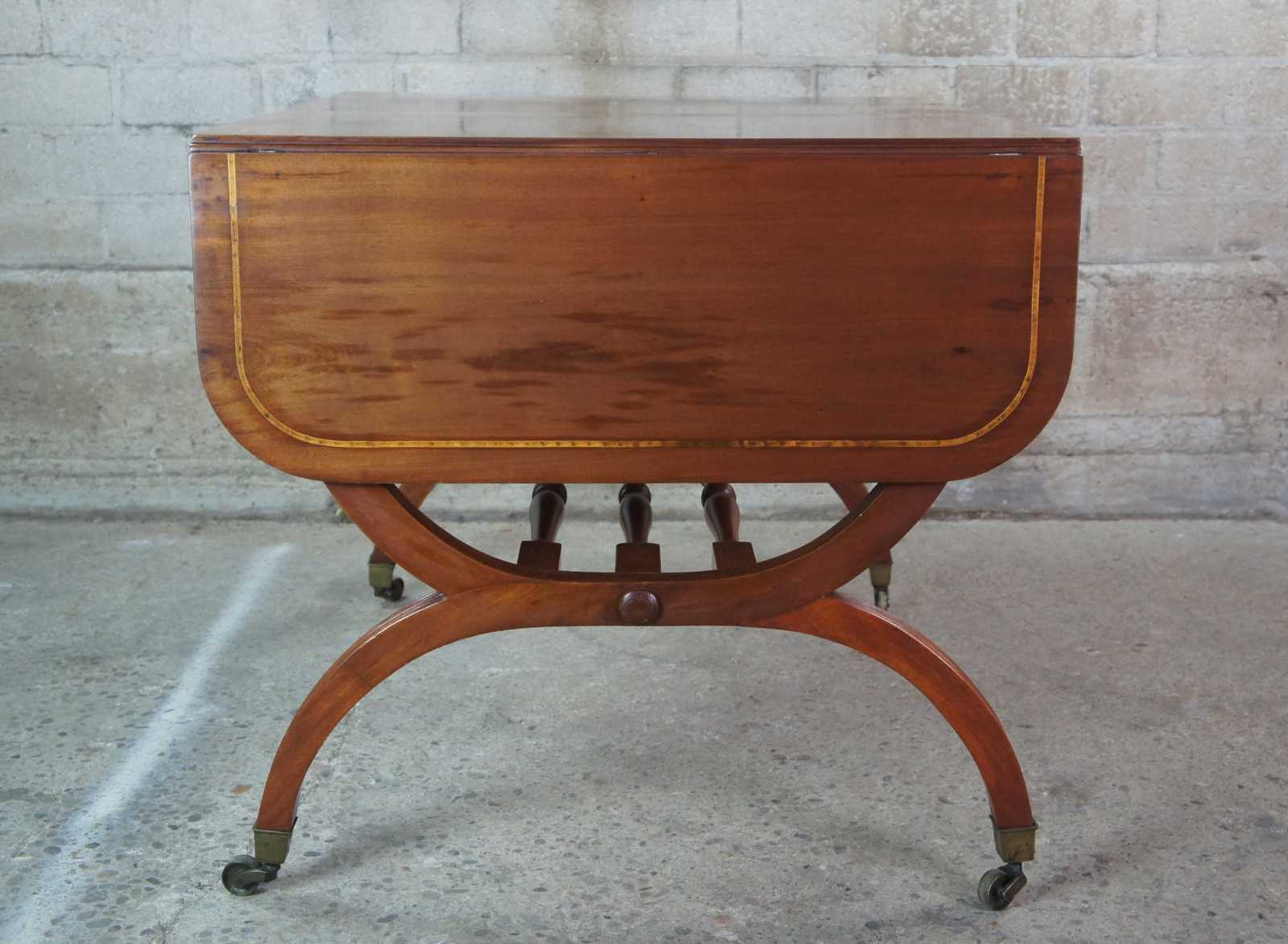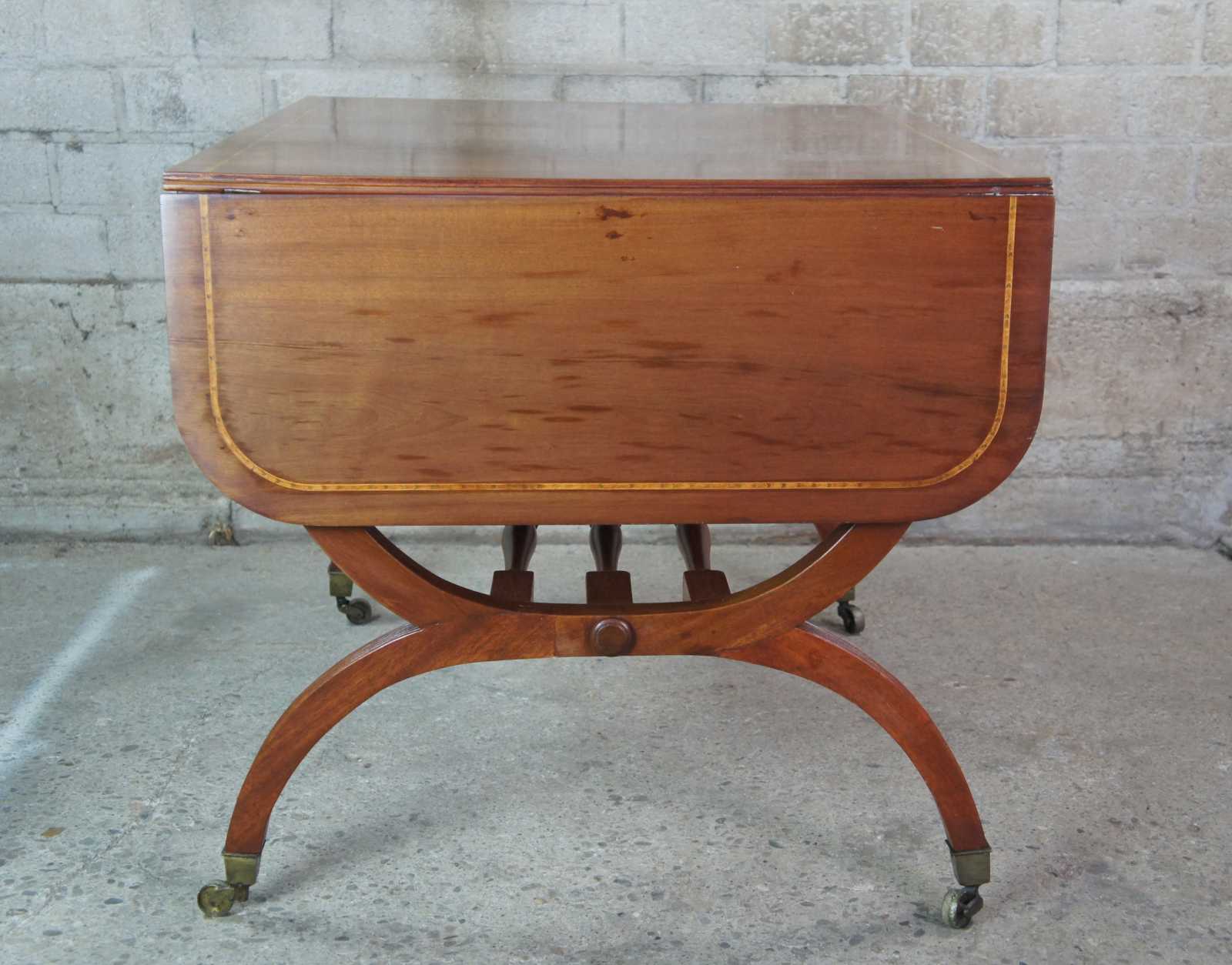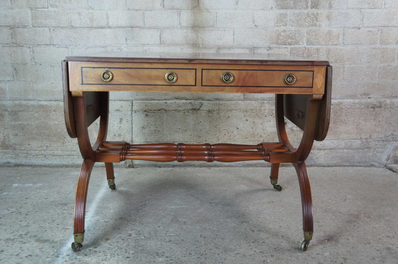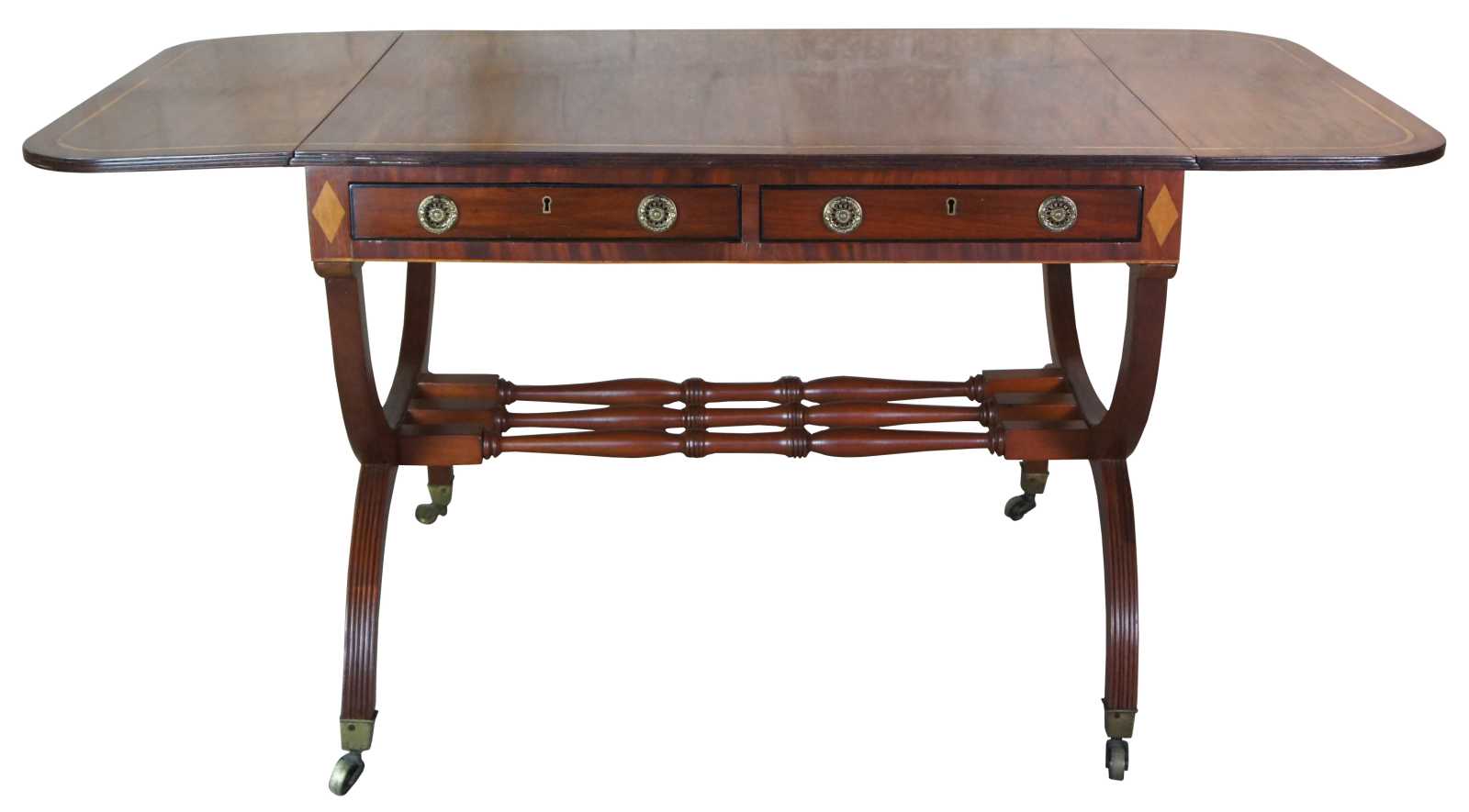 A fine English Regency drop leaf library desk or sofa table, circa early 19th century. Rectangular in form featuring diamond shaped inlay, yew banding, ebonized drawer fronts and brass hardware. Includes two long hand dovetailed drawers with brass knocker pulls. The desk is supported by an X shaped frame along each side connected by three hand turned posts. Lower legs are fluted leading to square capped feet with casters.