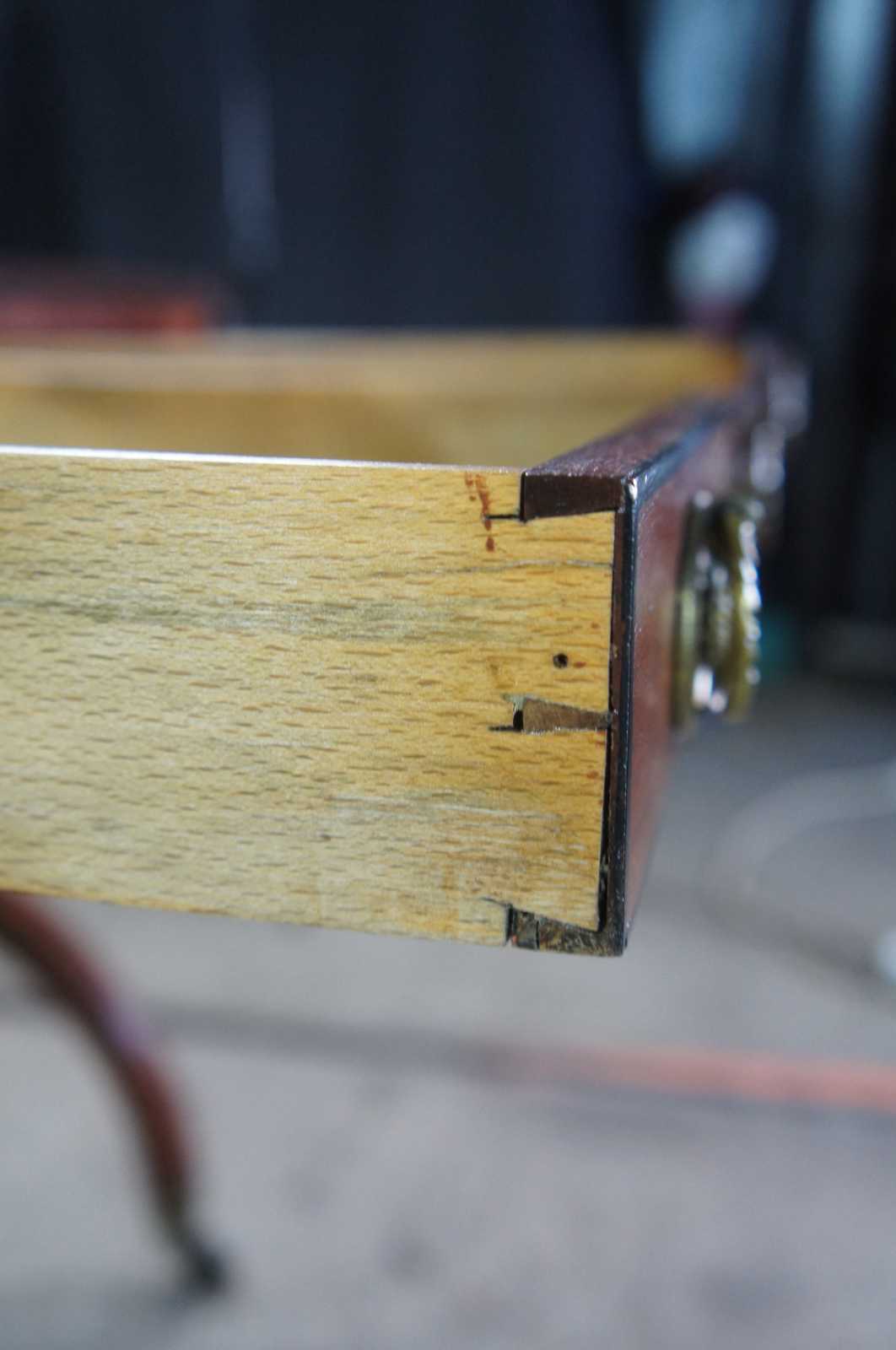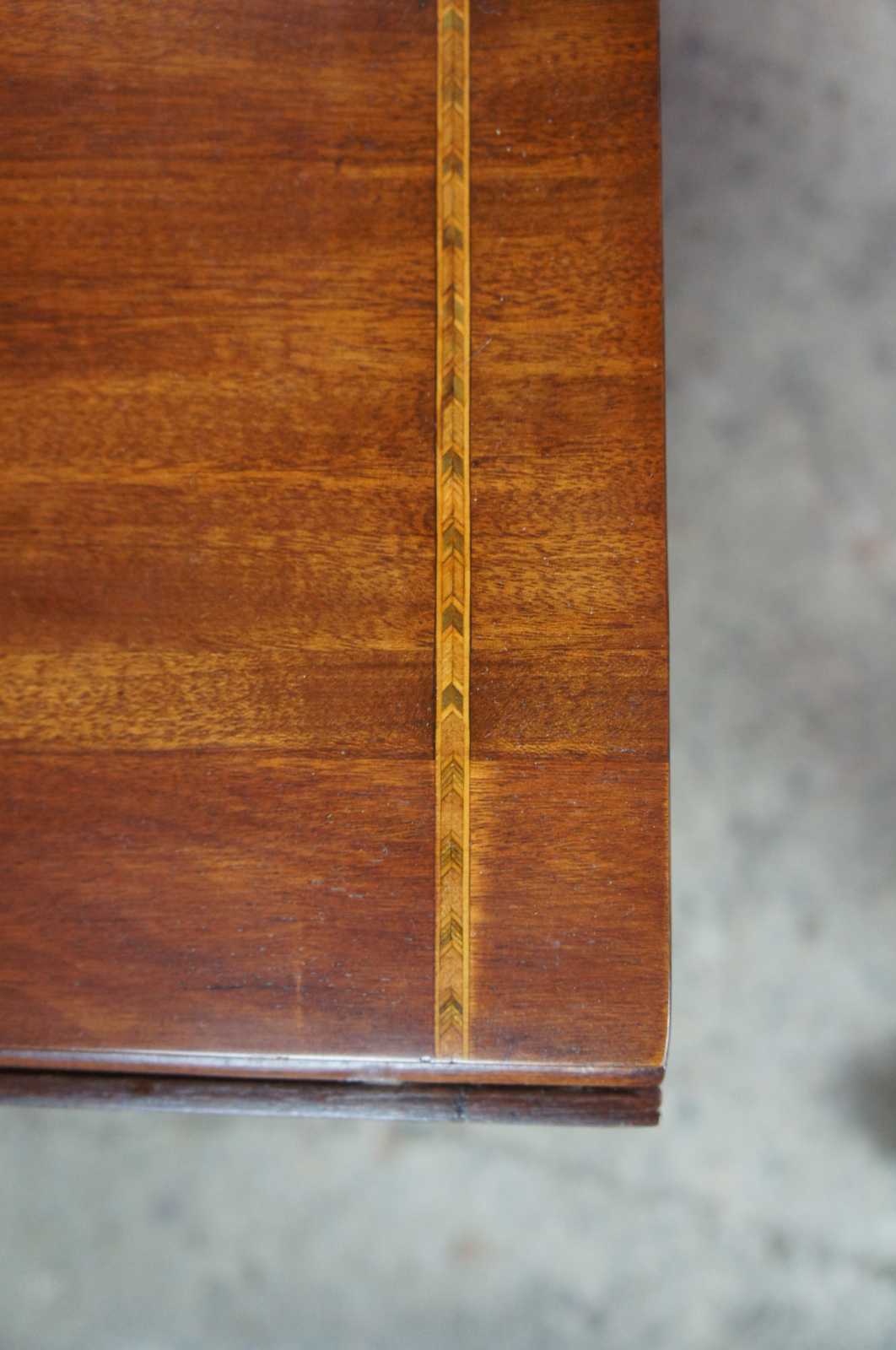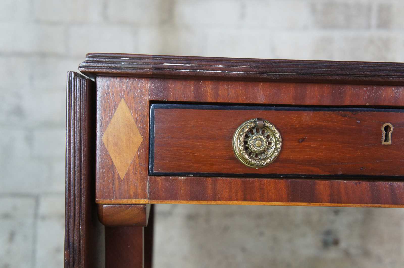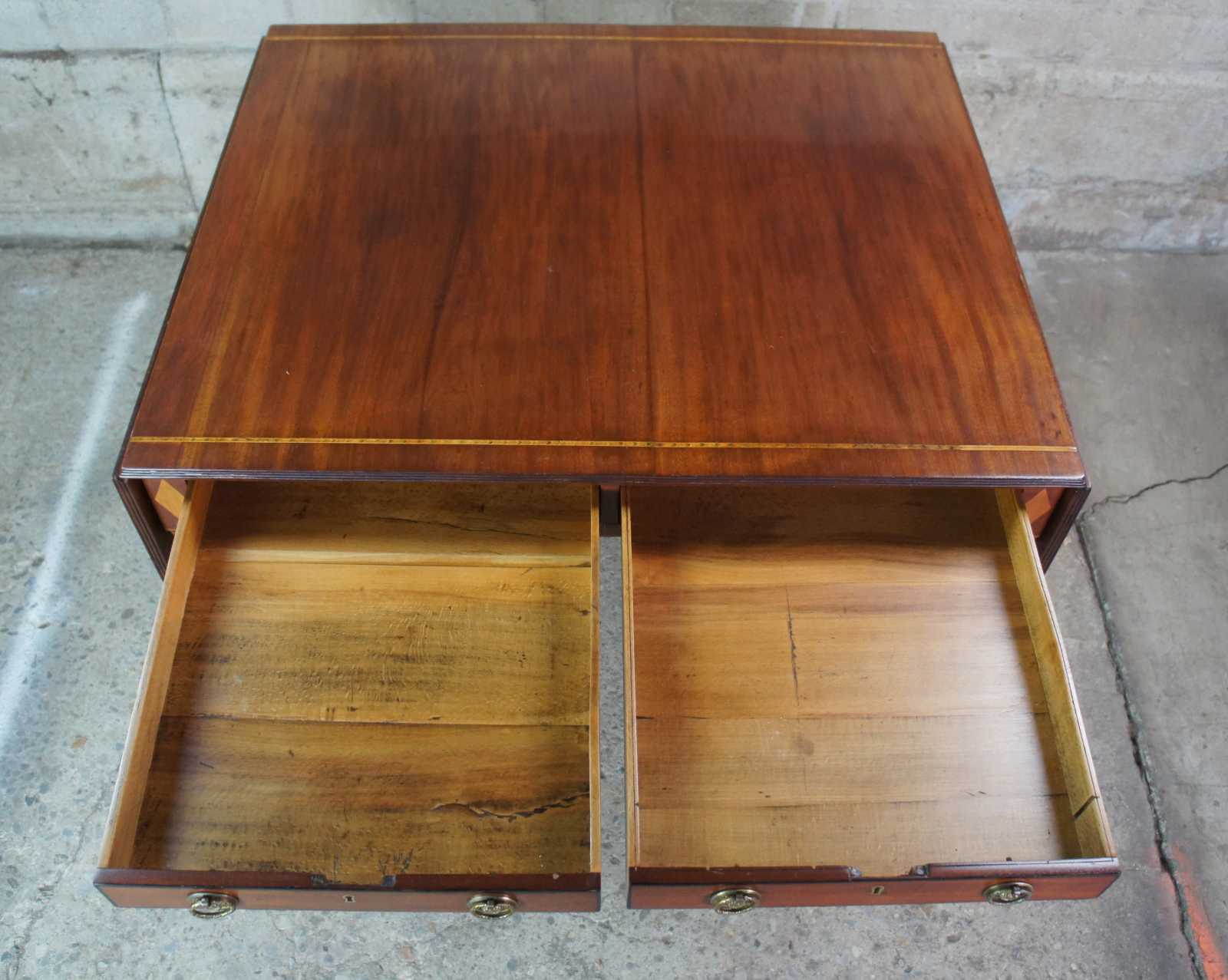 A fine English Regency drop leaf library desk or sofa table, circa early 19th century. Rectangular in form featuring diamond shaped inlay, yew banding, ebonized drawer fronts and brass hardware. Includes two long hand dovetailed drawers with brass knocker pulls. The desk is supported by an X shaped frame along each side connected by three hand turned posts. Lower legs are fluted leading to square capped feet with casters.