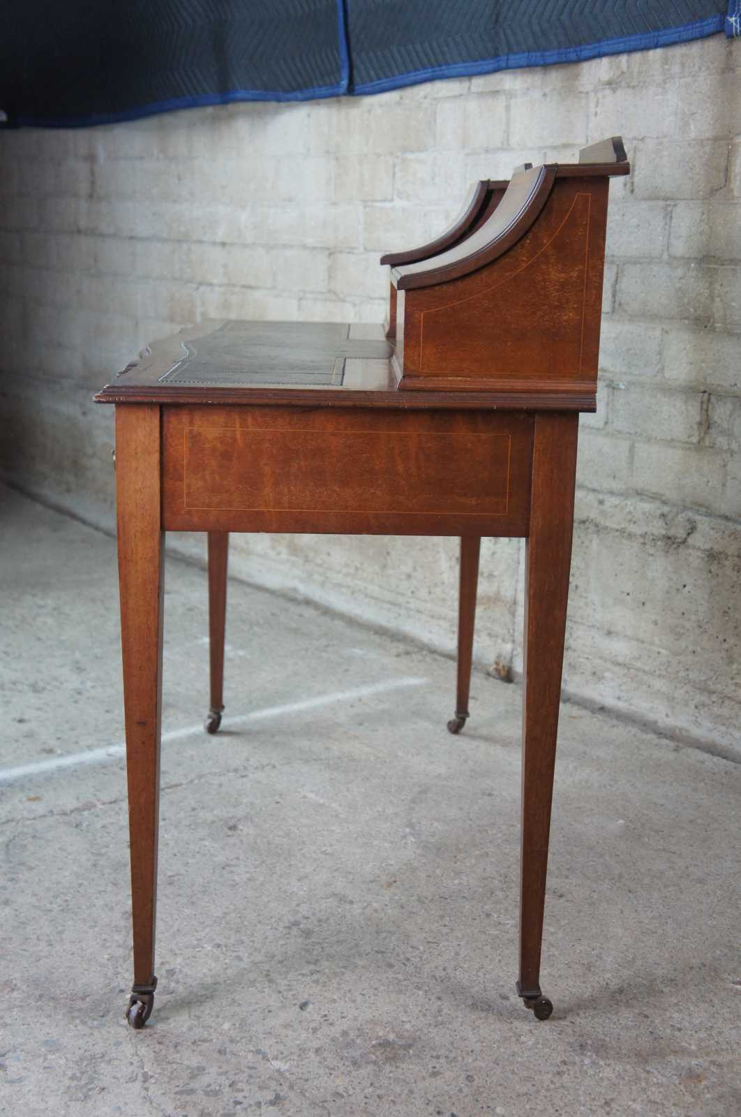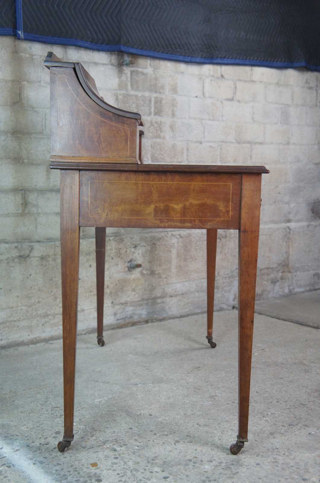 An exquisite English Regency ""Carlton House"" style writing desk, circa early 19th century. A serpentine form made from walnut burl with banding, yew inlay, tooled leather top and neoclassical brass hardware. Grandesque in design with sloped glove boxes along the back complete with dividers for file storage. The desk is supported by square tapered legs leading to casters.
