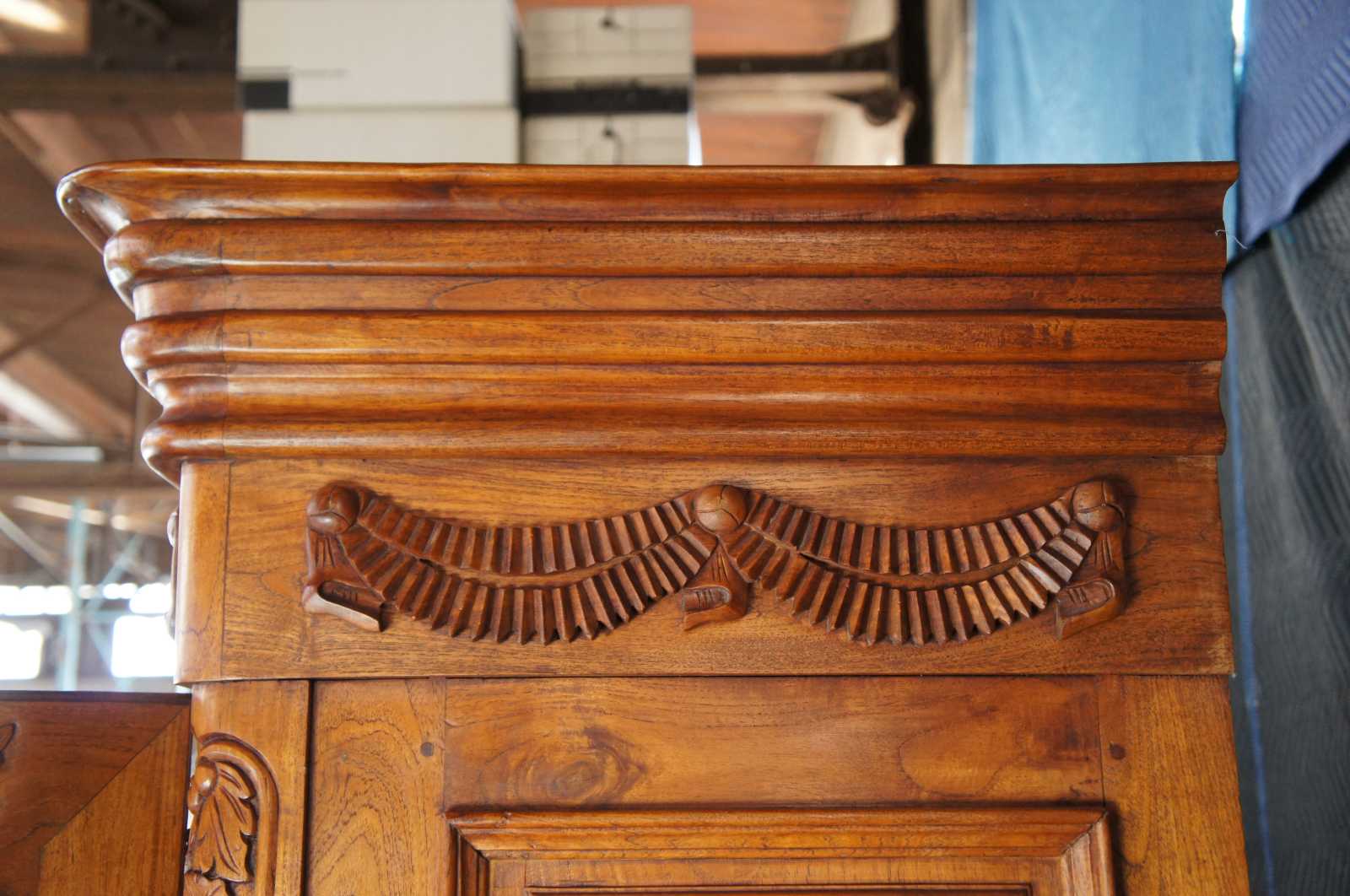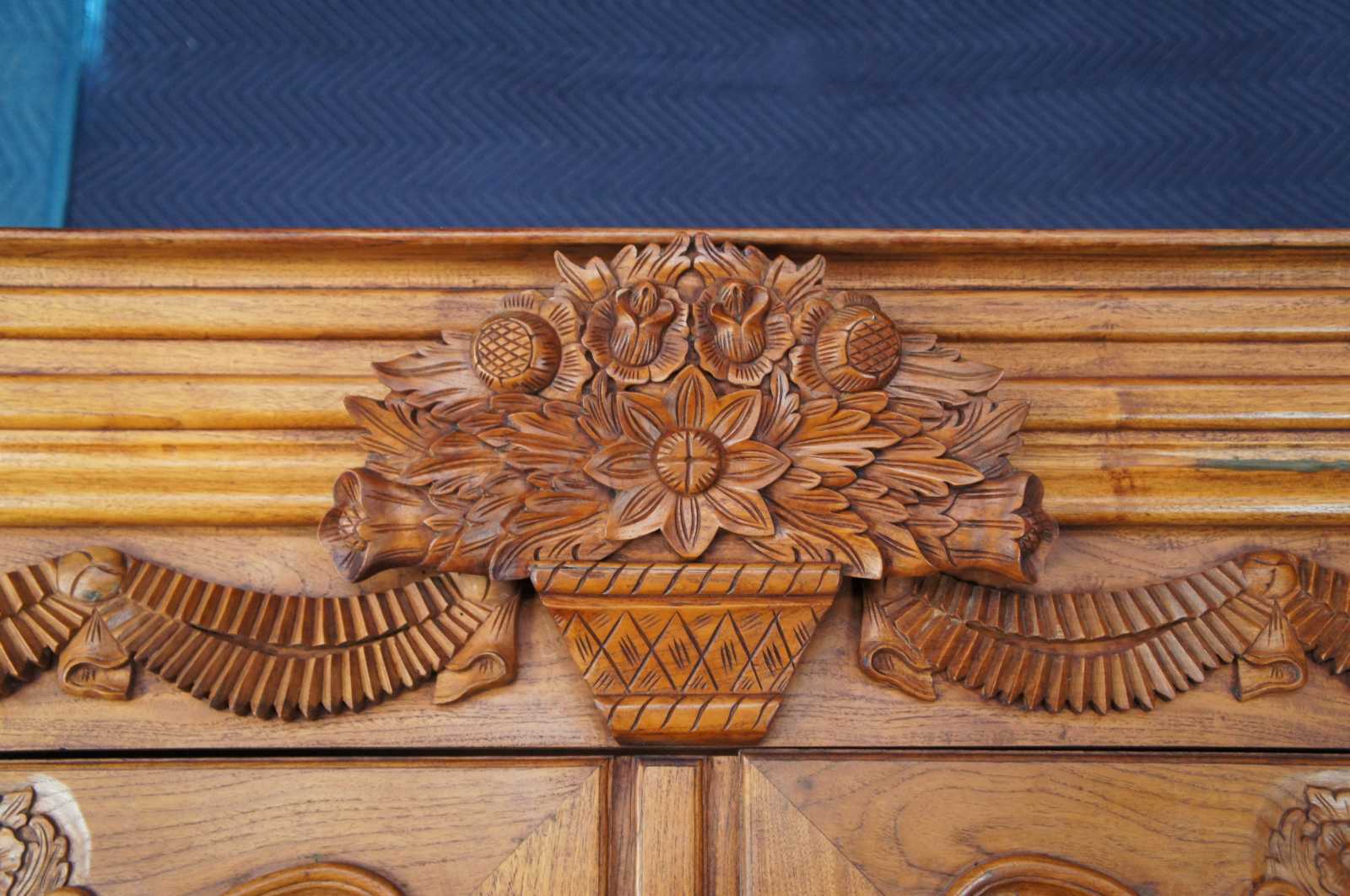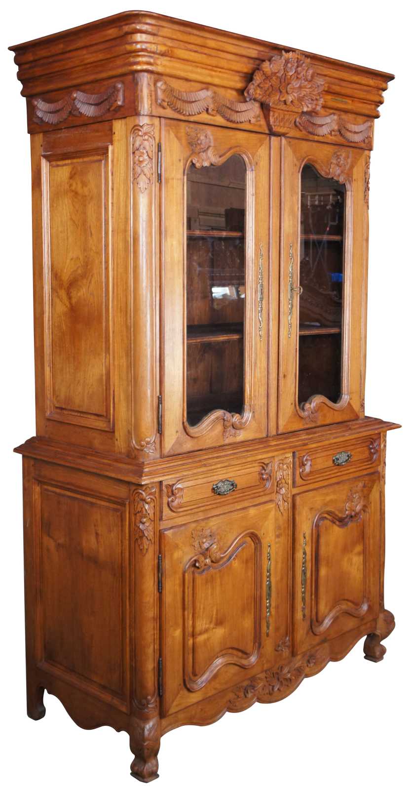 Vintage carved deux corps wedding / marriage buffet / china hutch / curio cabinet / bookcase featuring embellished foliage and flowers in carved relief with a central flower filled basket.