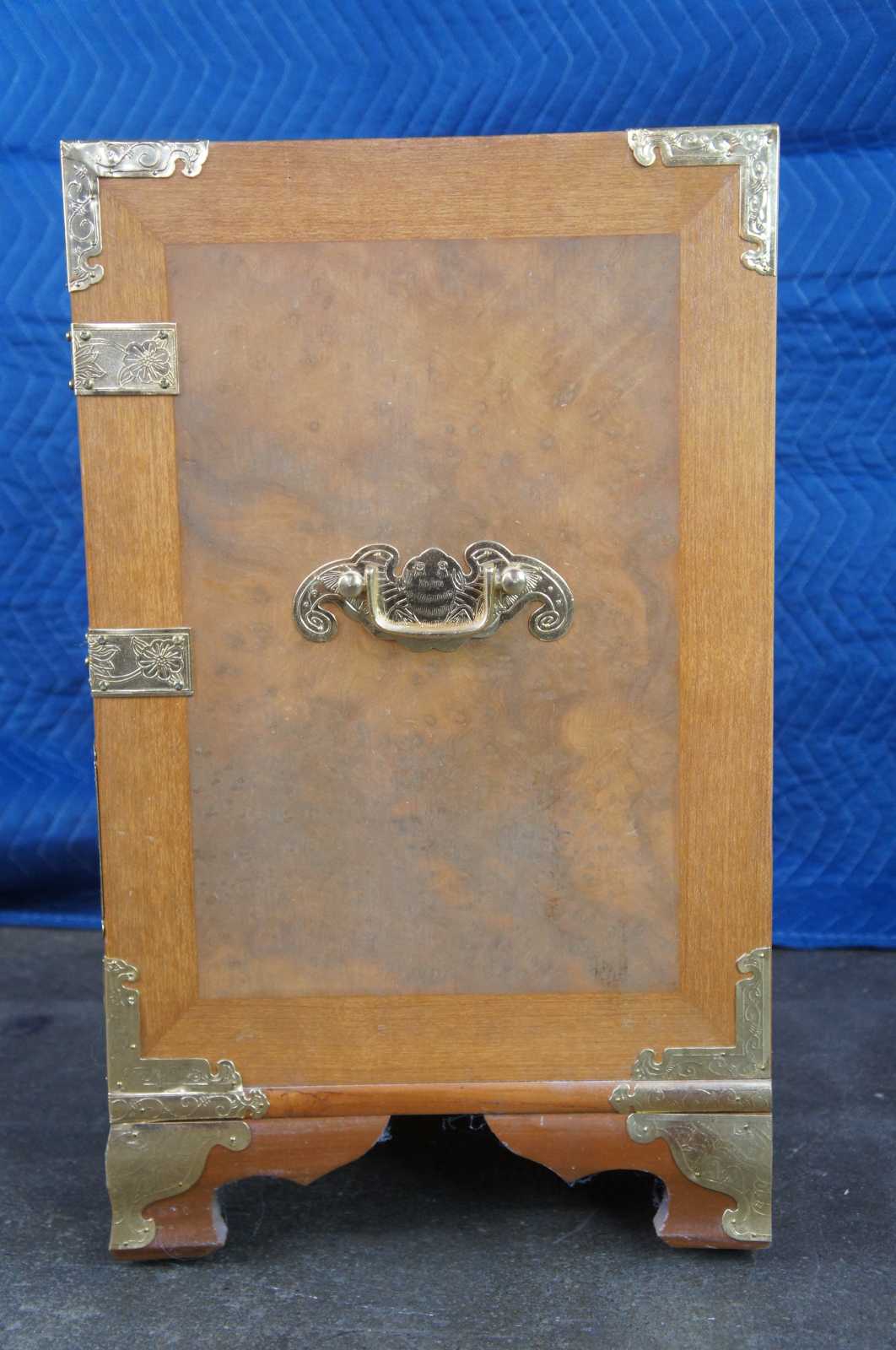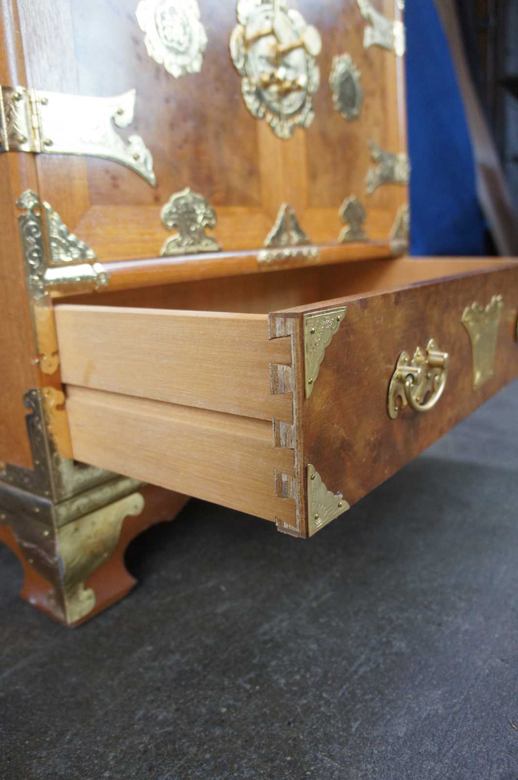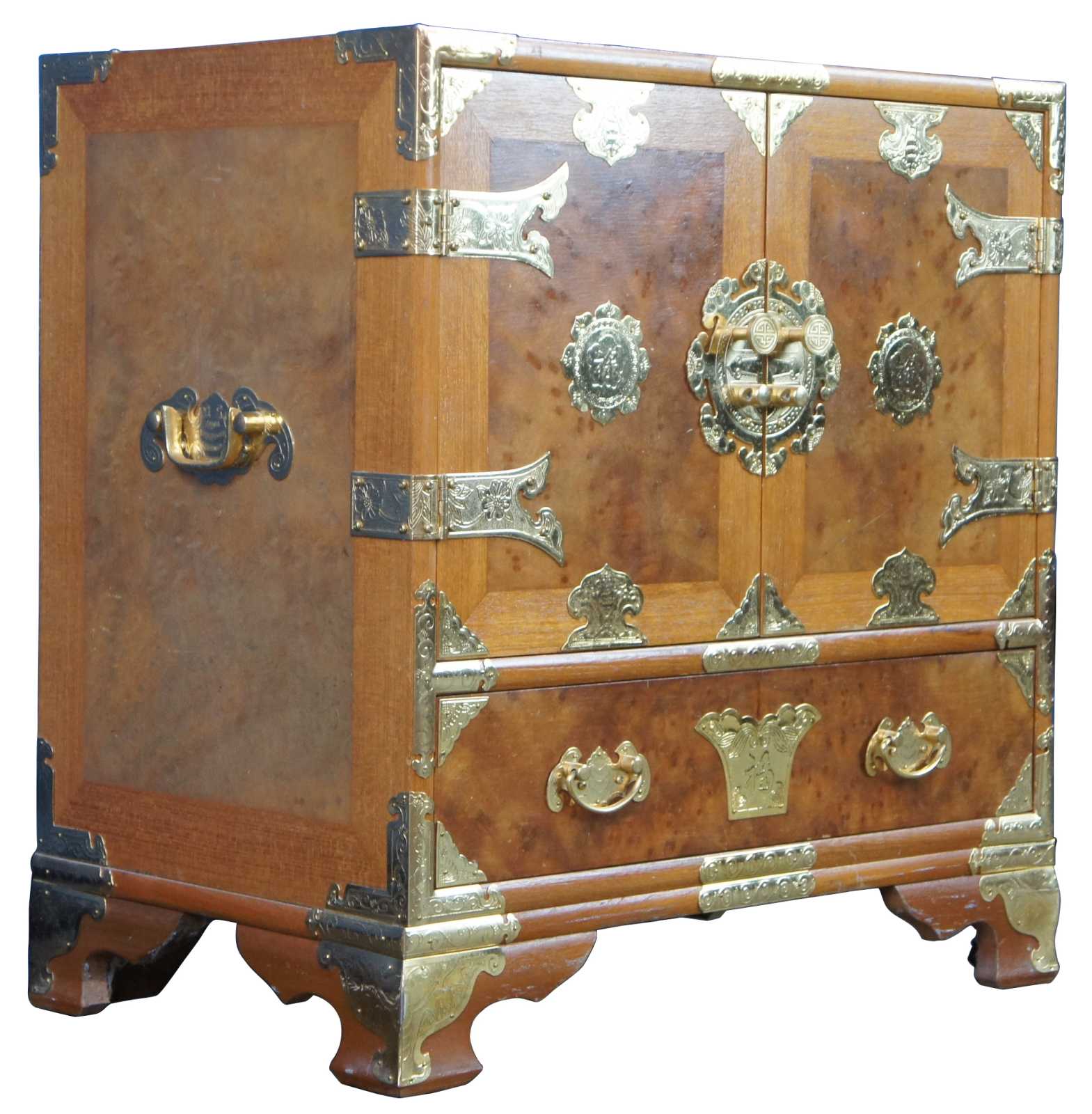 Mid century tansu inspired chest featuring elm burl wood case with a heavy adornment of brass accents.