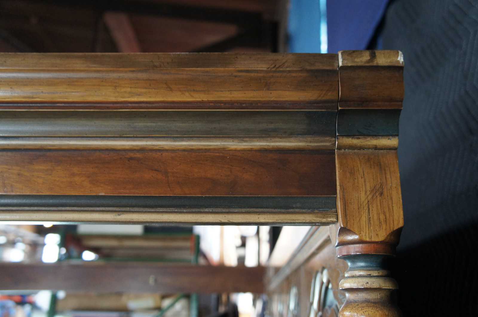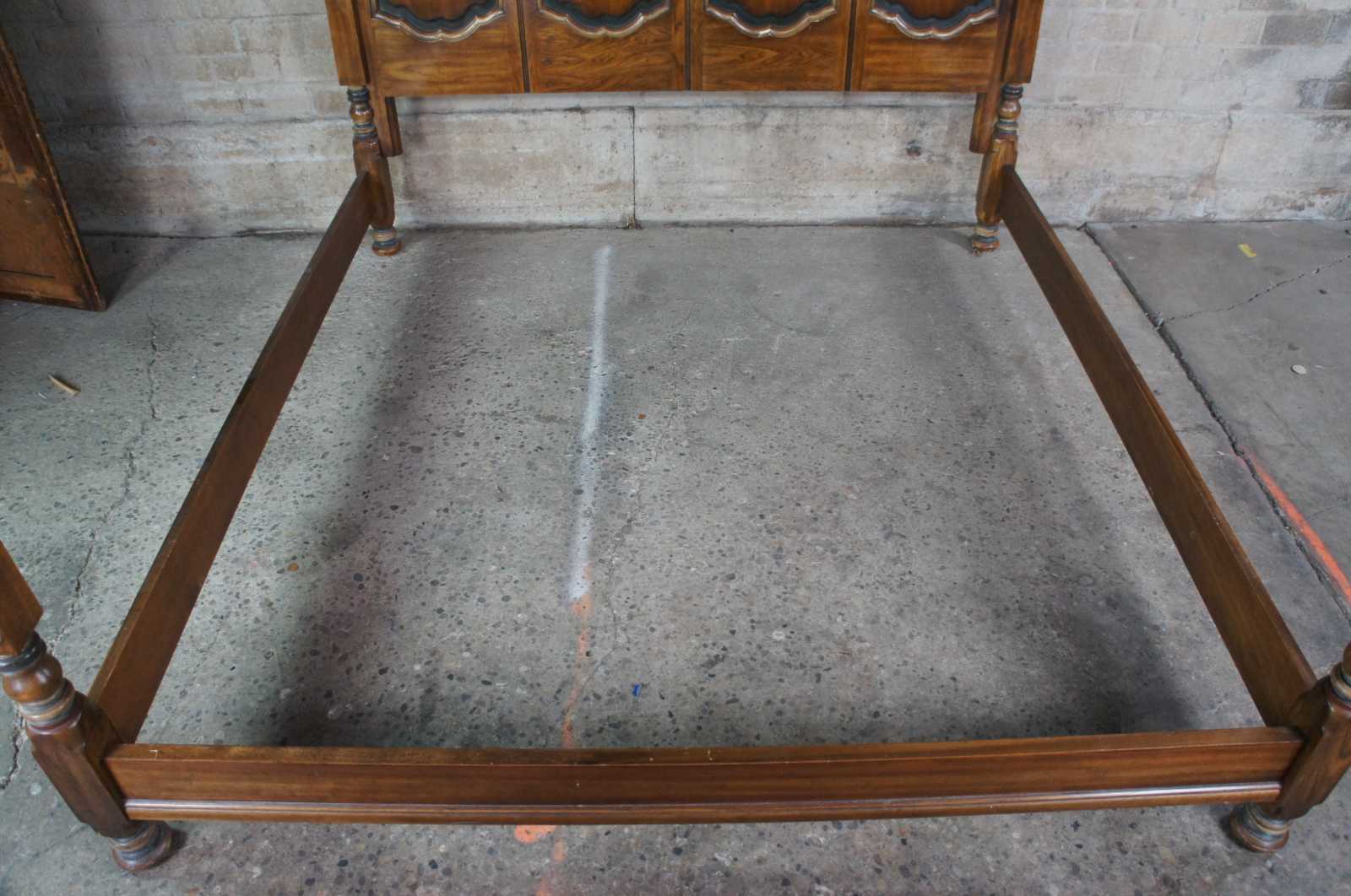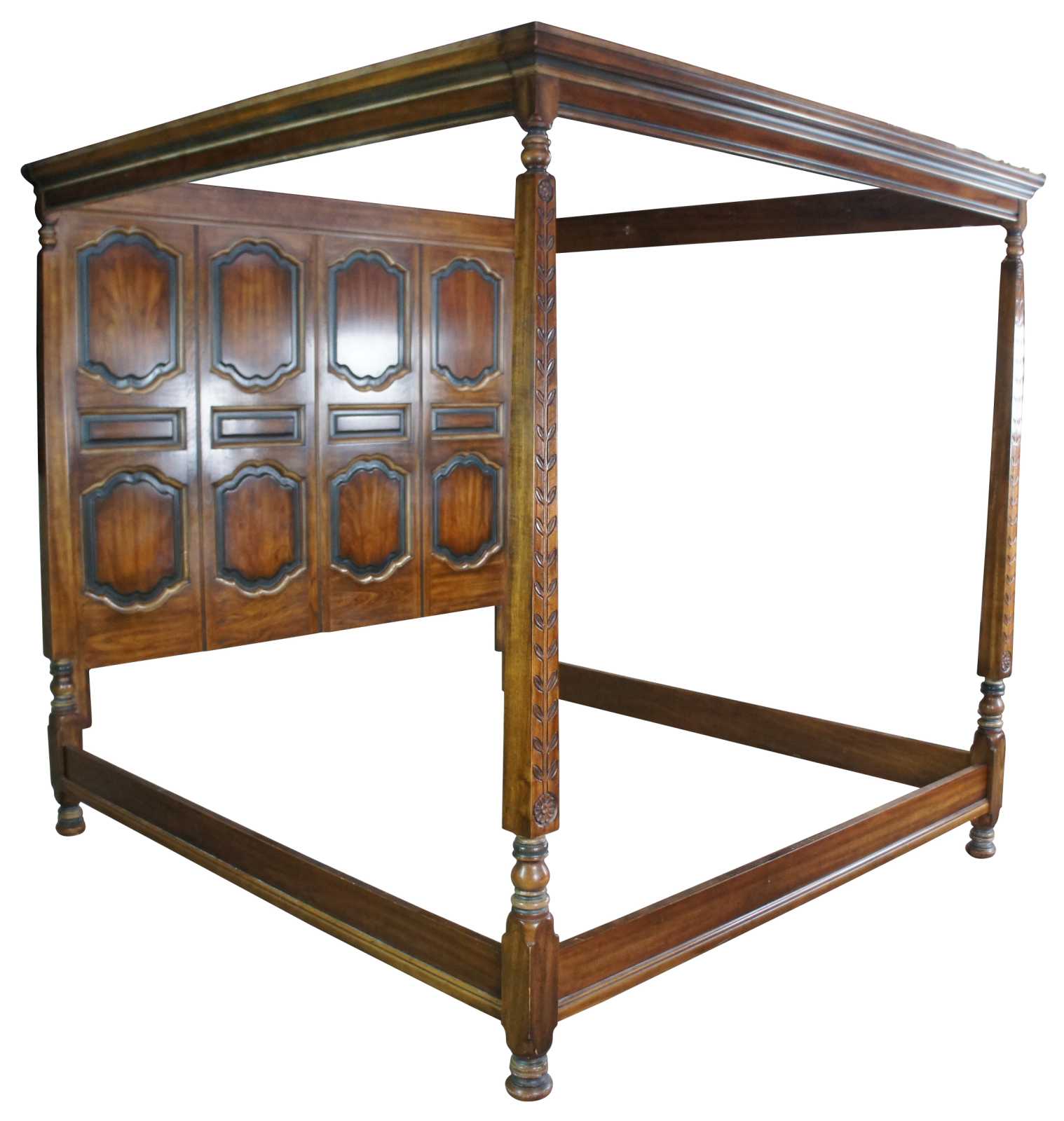 Drexel Heritage Brittany Collection King size canopy Bed, circa 1980s. Features an oak frame with Panelled backing, square tapered sunflower carved posts and bun feet. Trimmed with green accents, 202-581-1