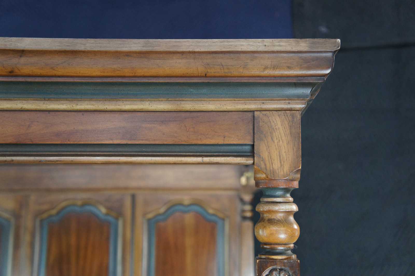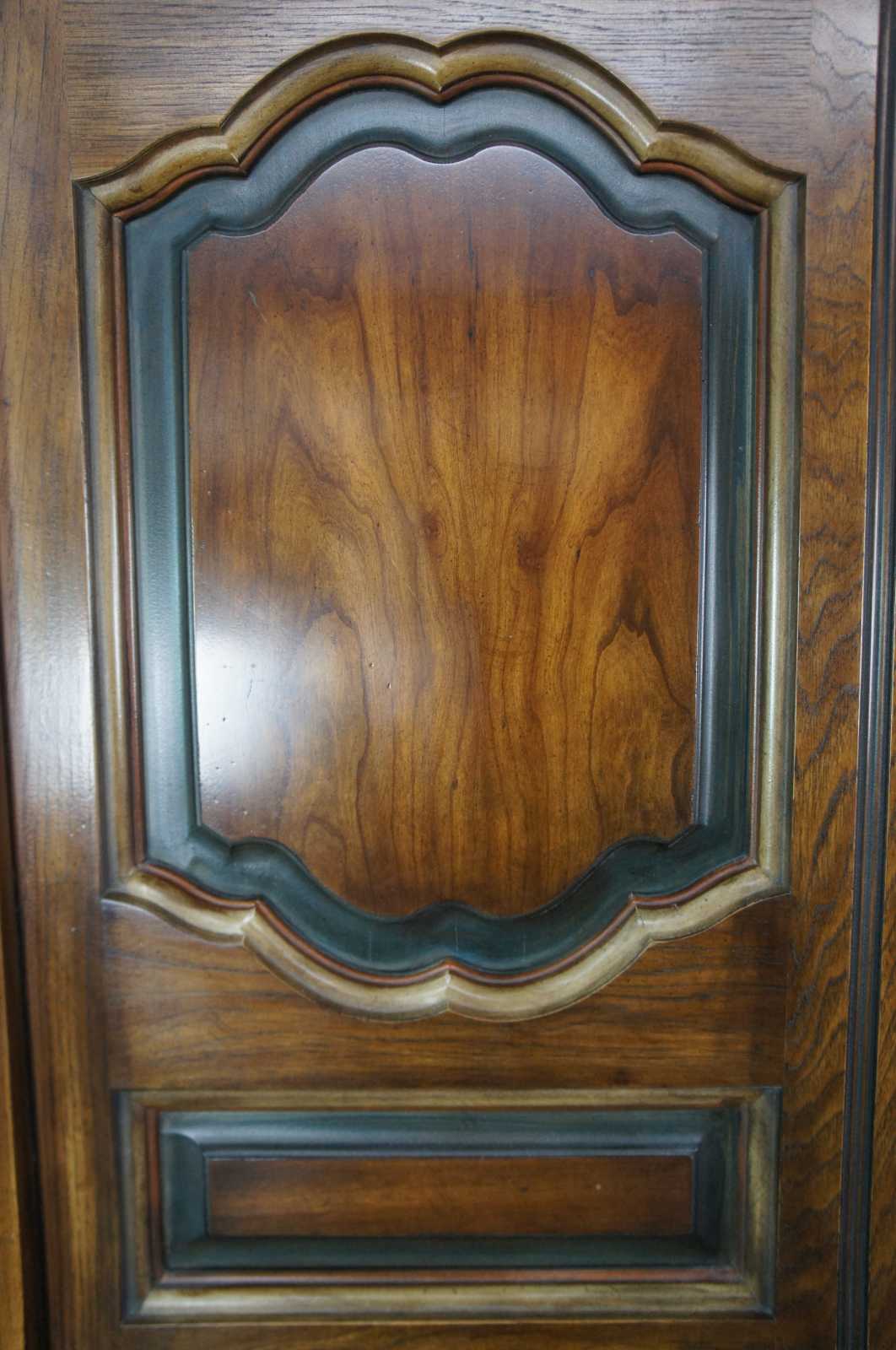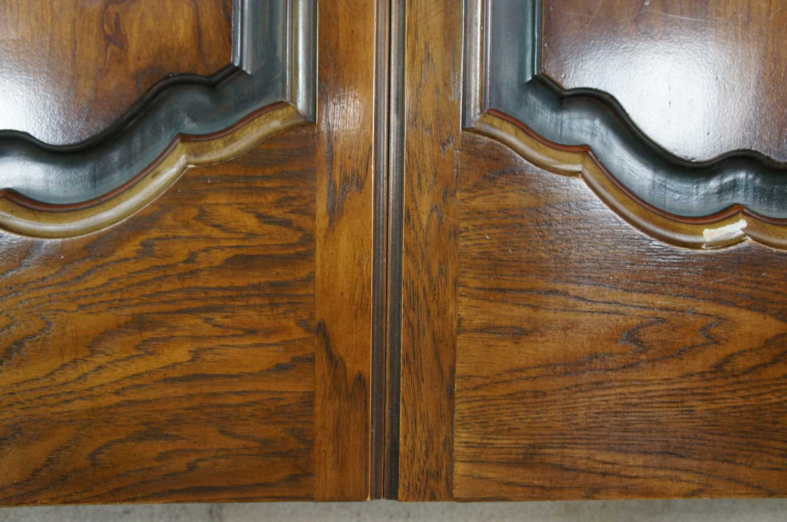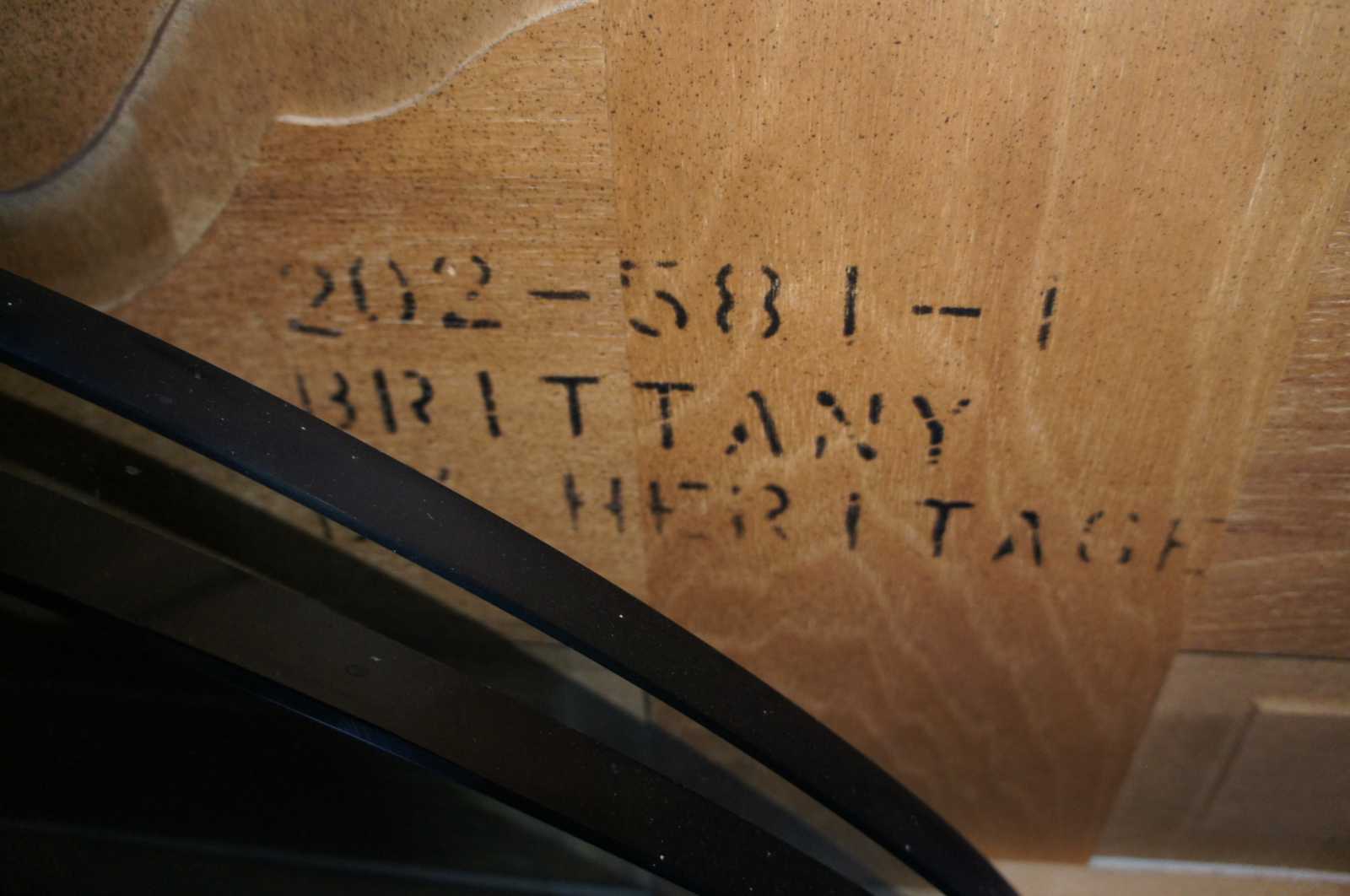Drexel Heritage Brittany Collection King size canopy Bed, circa 1980s. Features an oak frame with Panelled backing, square tapered sunflower carved posts and bun feet. Trimmed with green accents, 202-581-1