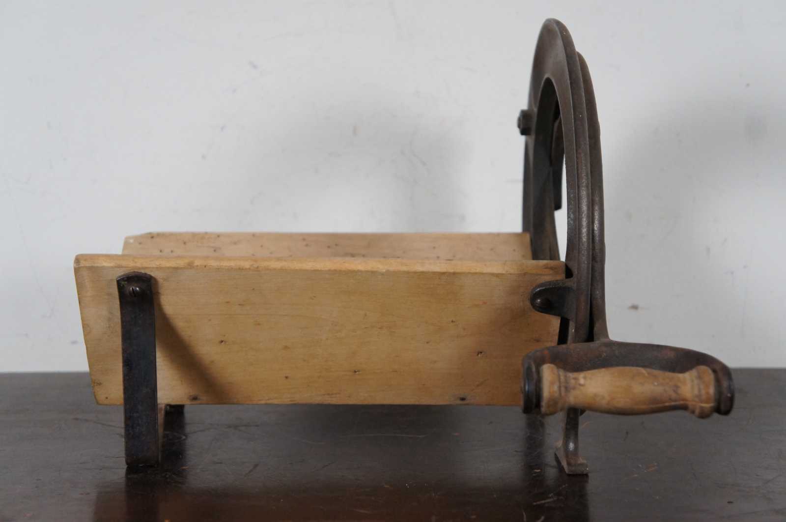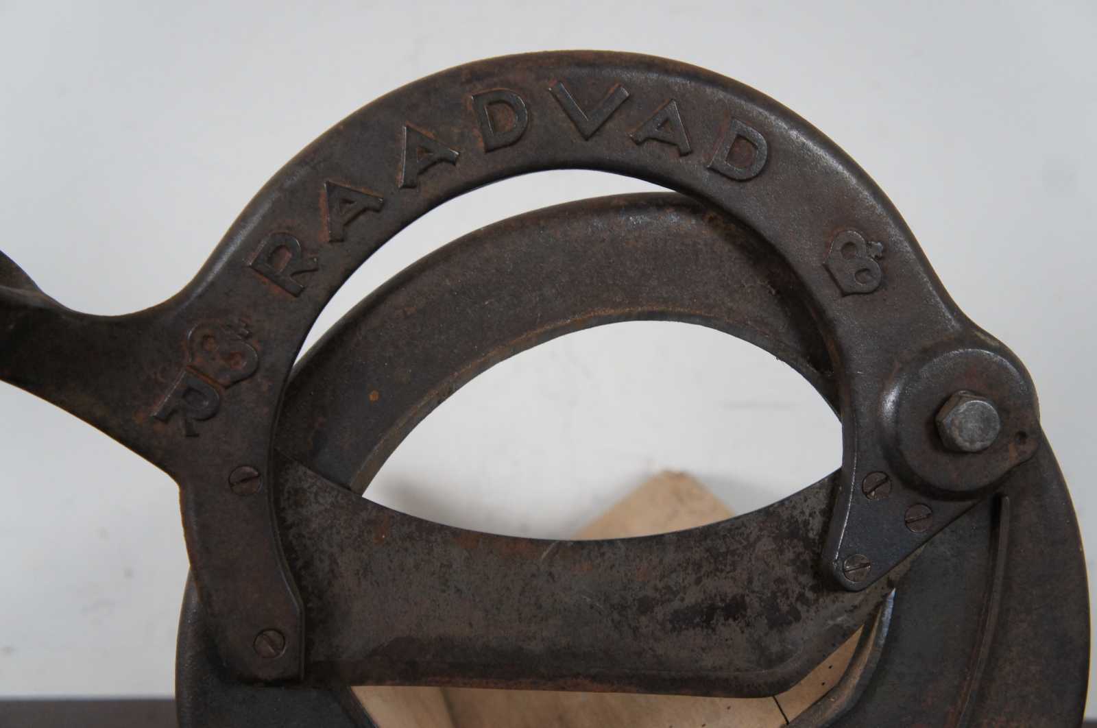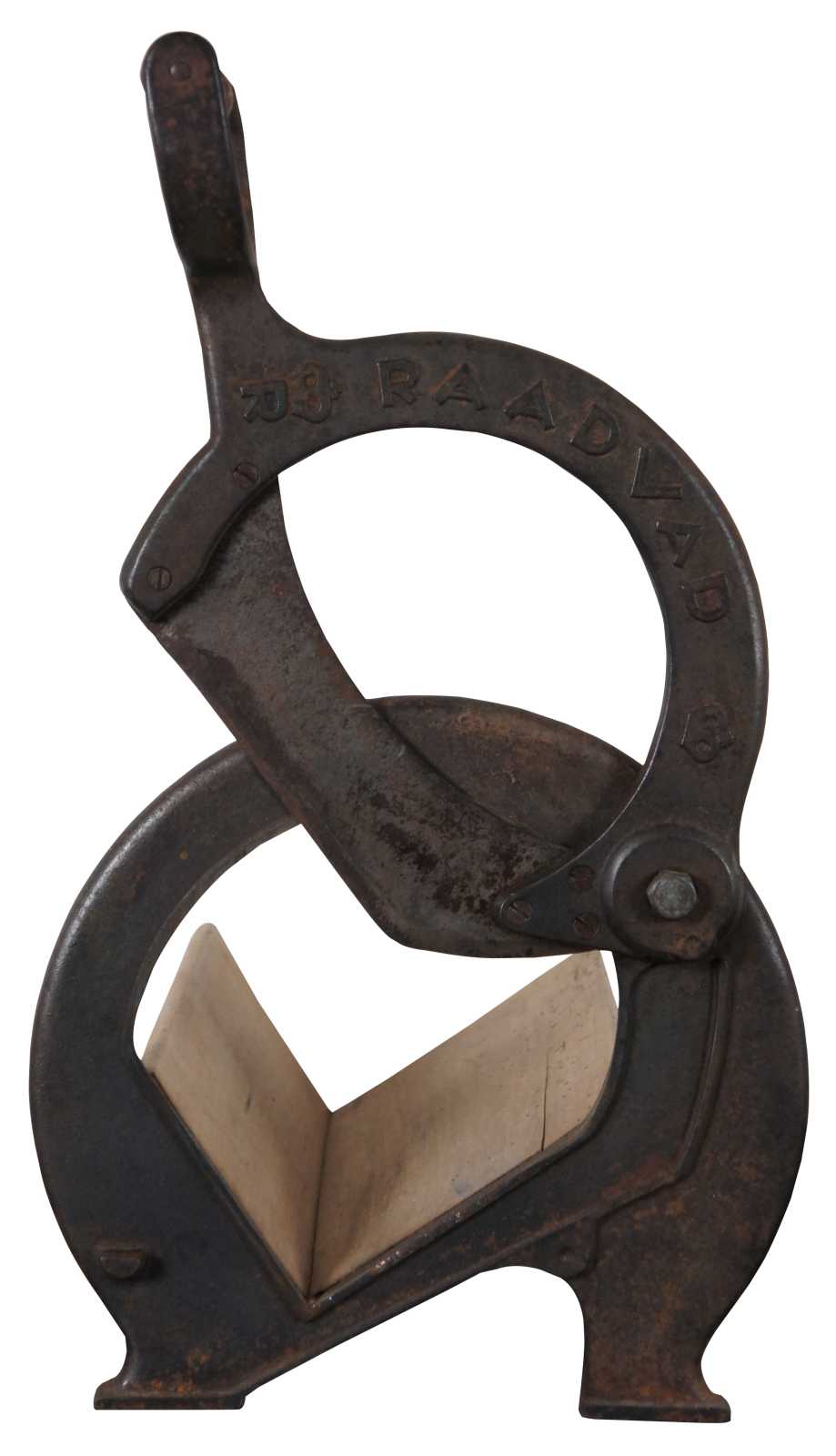 All original and rare Danish cast iron and wood bread or baguette slicer by Raadvad.