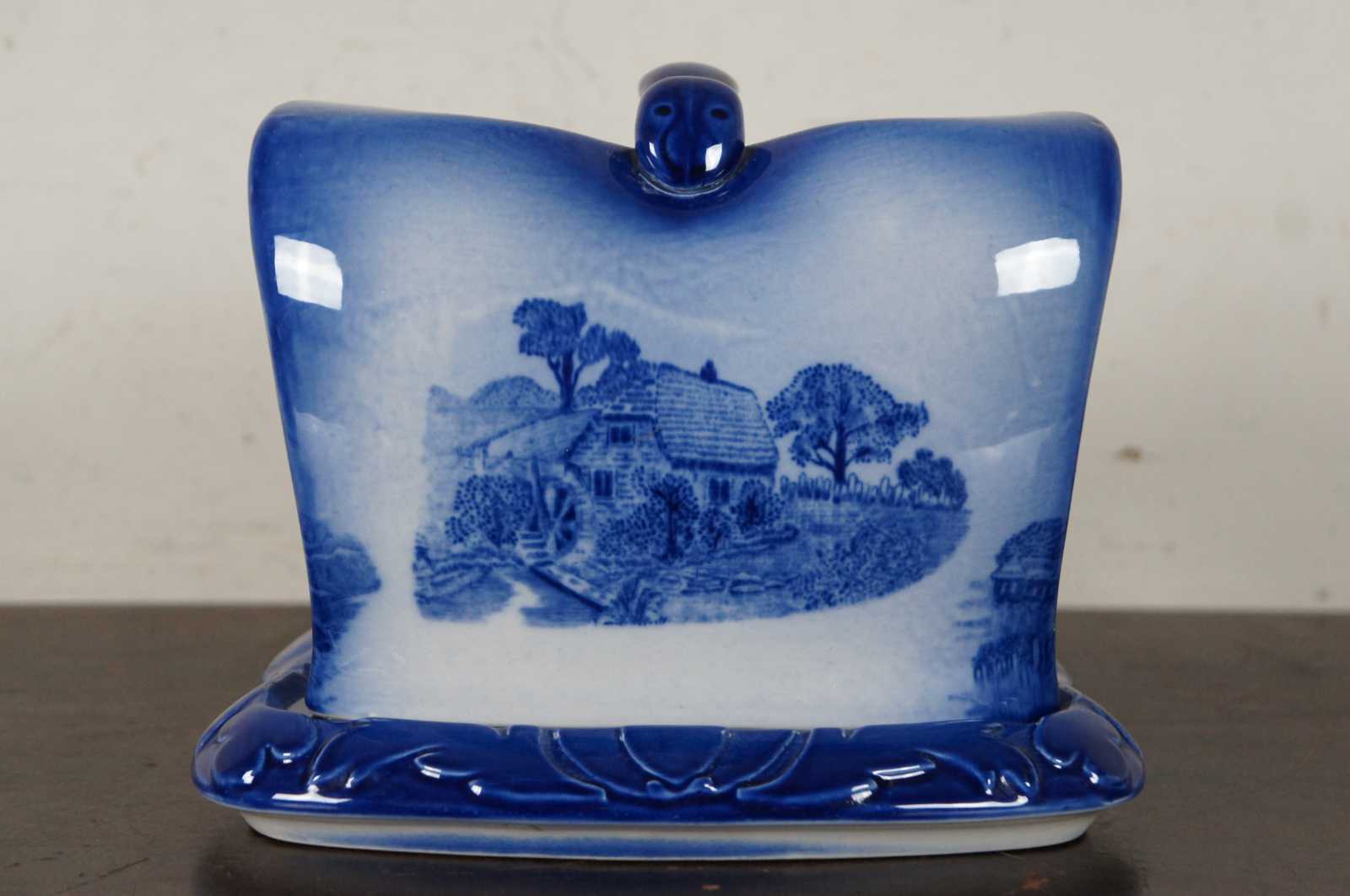 Antique Blakeney Homestead Flo Blue porcelain wedge shaped cheese dish with plate and bell, featuring a worm shaped handle and transferware scenes of cows and farmyards.