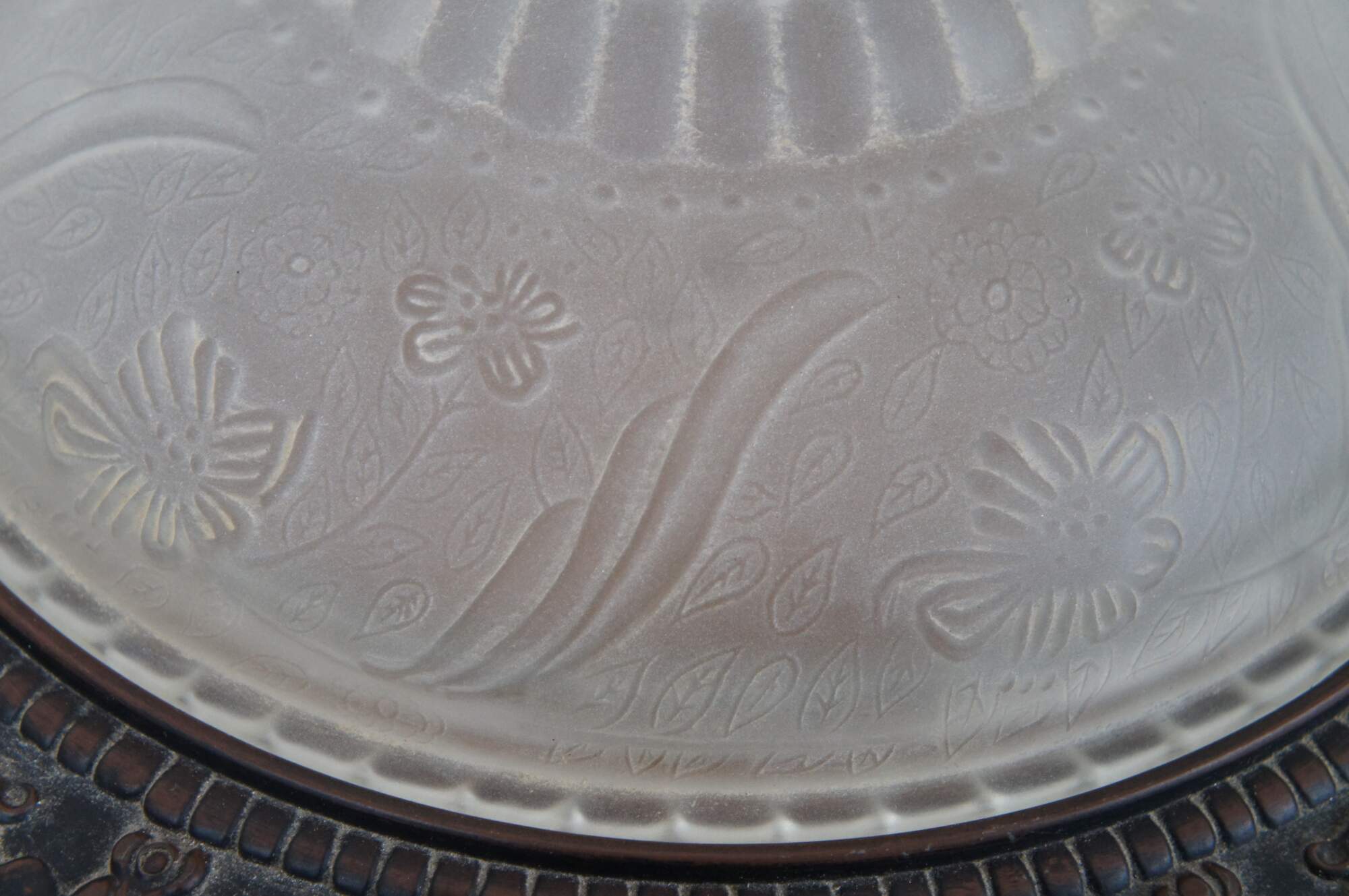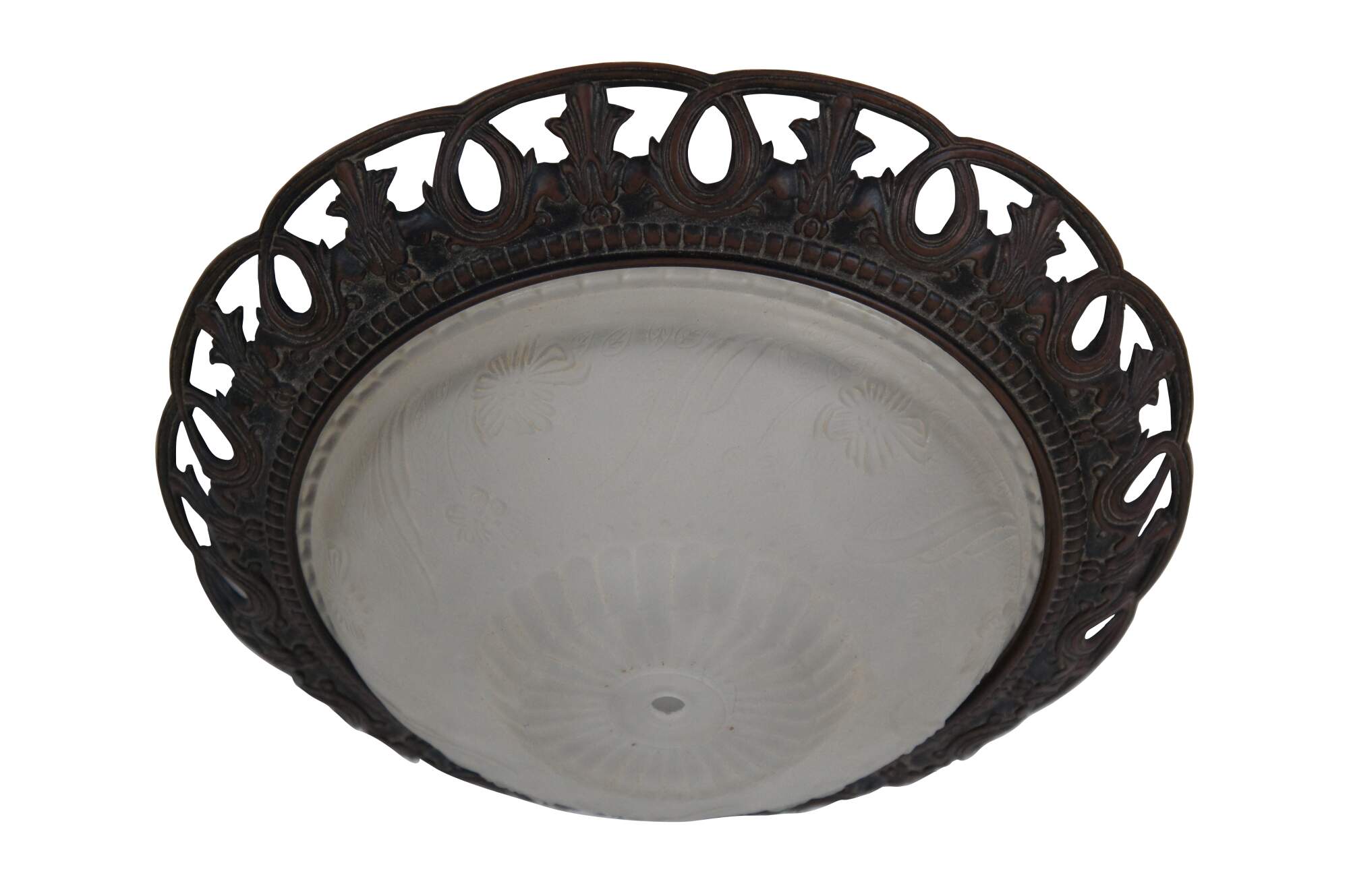 French Provincial / country style flush mount ceiling light medallion in an antique copper finish with a frosted glass shade decorated with flowers and swirls.