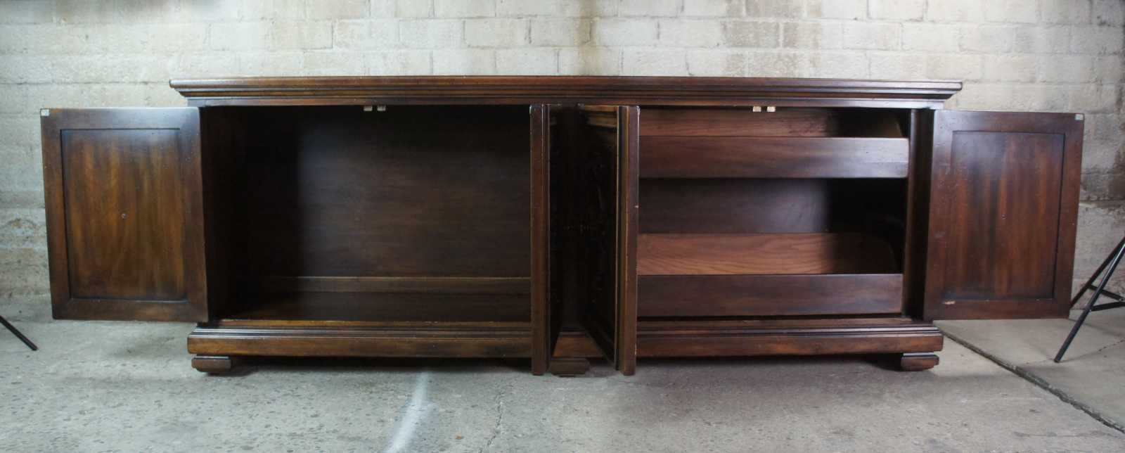 Mid 20th Century John Widdicomb credenza, buffet, or console. Traditional styling with French flare. Made of walnut featuring four paneled doors with thick carvings that lead to two storage cabinets. The cabinet is supported by square block feet with inset rollers allowing for ease of movement.