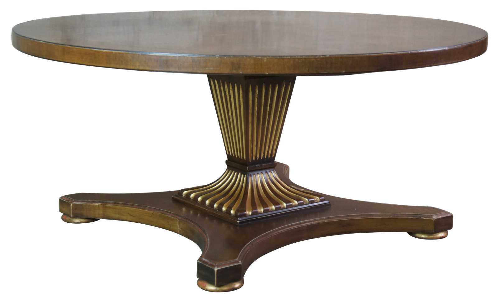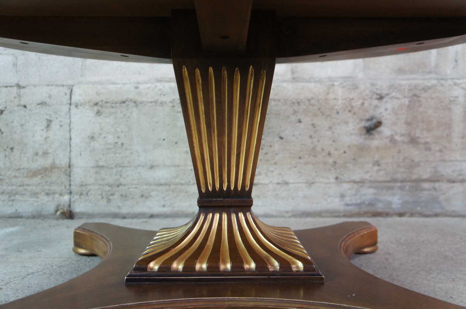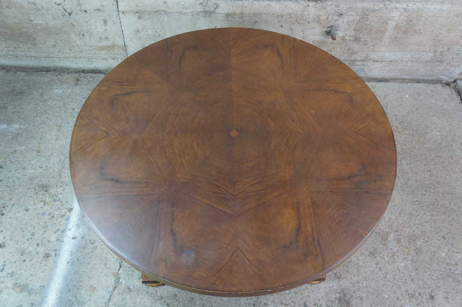 A unique blend of Italian Provincial & French Regency styling by WM A Berkey for John Widdicomb, circa mid 20th century. Features a round form made from walnut with a matchbook top creating a stunning sunburst like design. The table is supported by a square tapered fluted and gilt base supported by bun feet.
