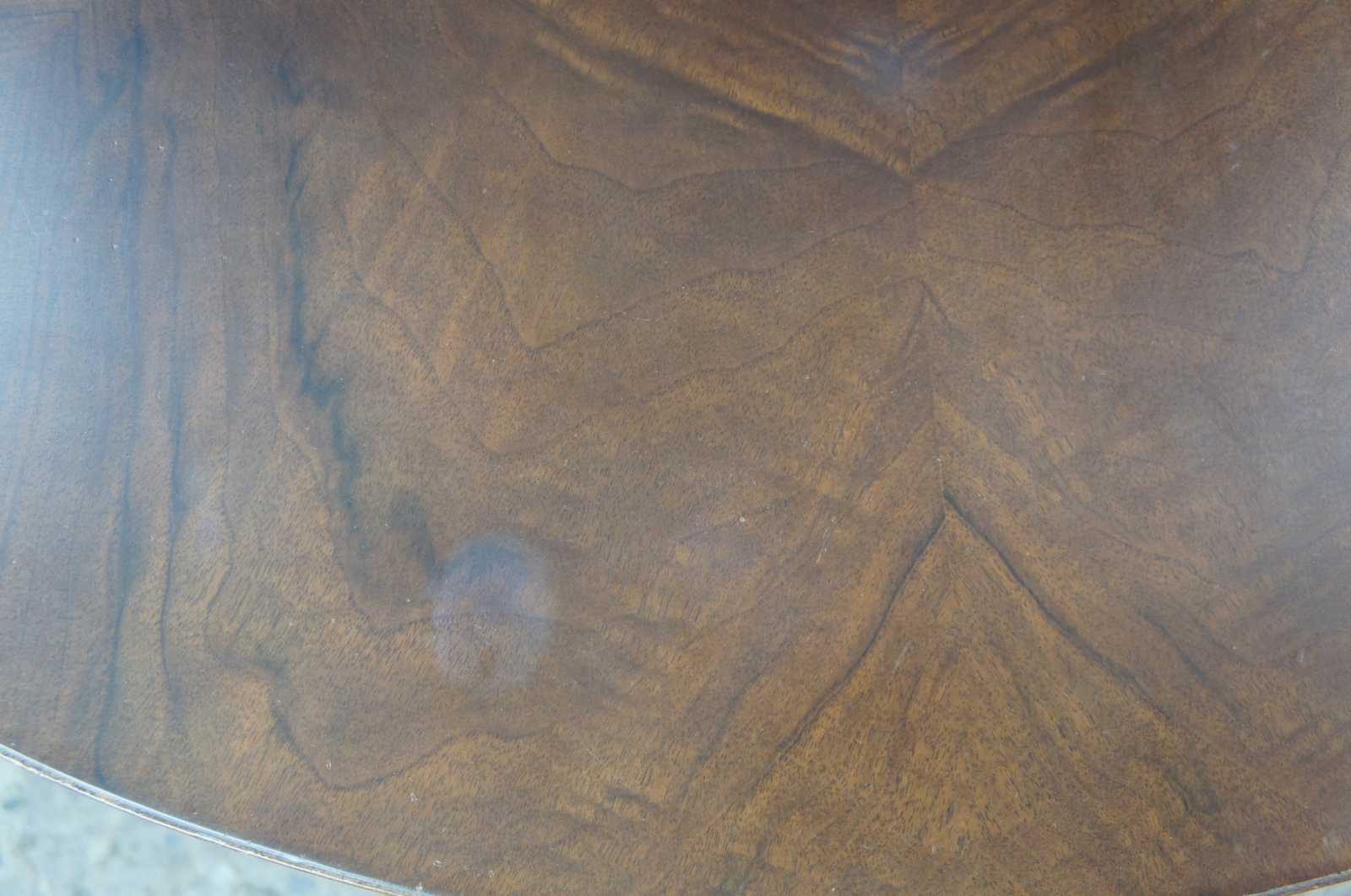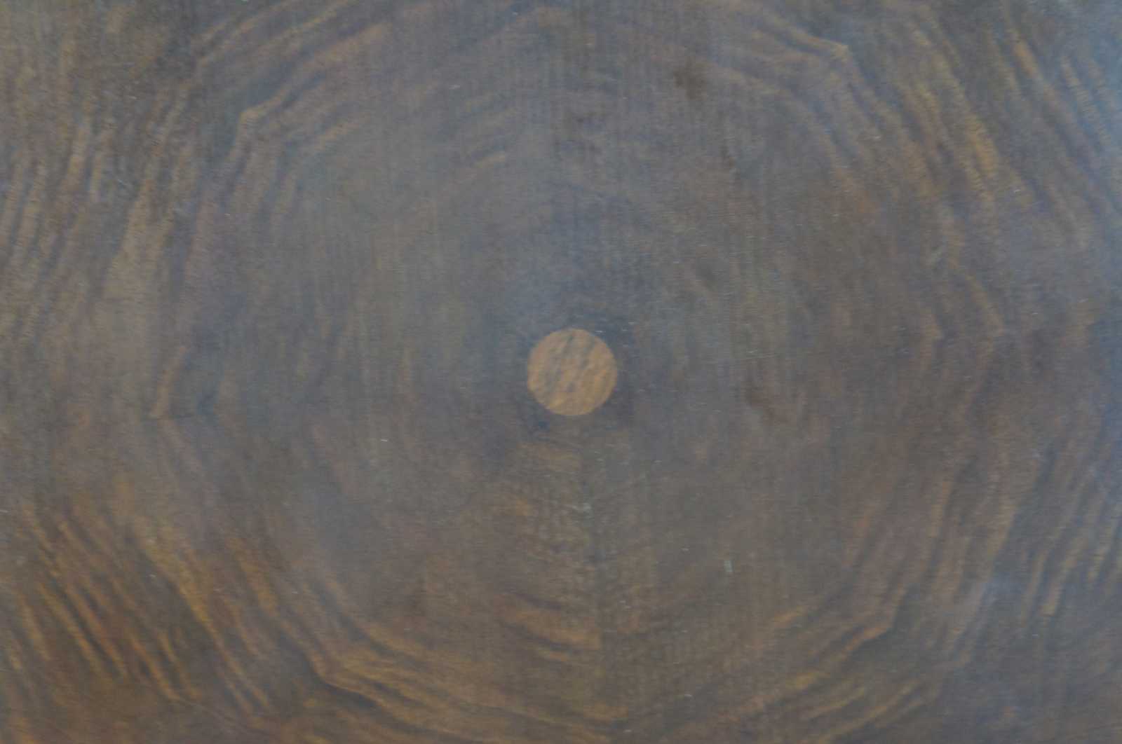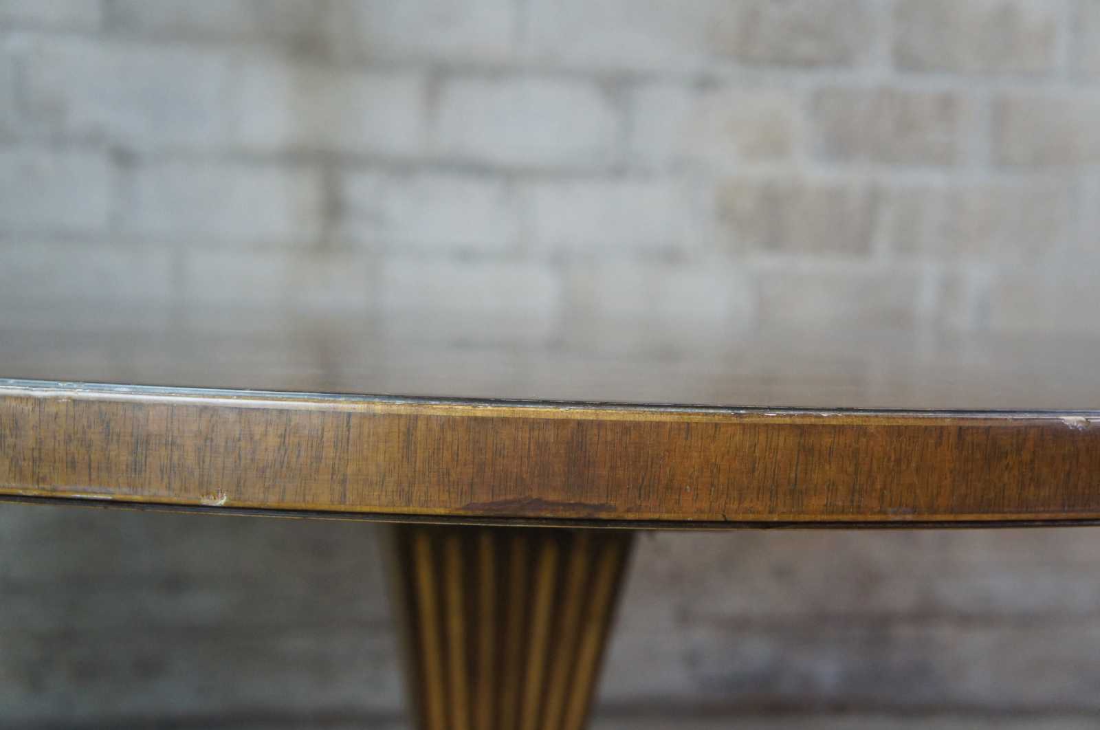 A unique blend of Italian Provincial & French Regency styling by WM A Berkey for John Widdicomb, circa mid 20th century. Features a round form made from walnut with a matchbook top creating a stunning sunburst like design. The table is supported by a square tapered fluted and gilt base supported by bun feet.